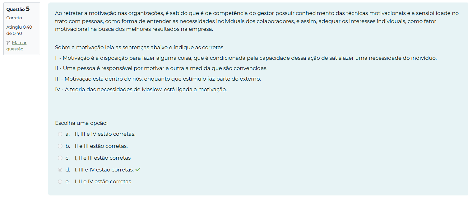 Questão 5 Ao retratar a motivação nas organizações, é sabido que é de competência do gestor possuir conhecimento das técnicas motivacionais e a sensibilidade no Correto trato com pessoas, como forma de entender as necessidades individuais dos colaboradores, e assim, adequar interesses individuais, como fator Atingiu 0,40 motivacional na busca dos melhores resultados na empresa. de 0,40 Marcar questão Sobre a motivação leia as sentenças abaixo e indique as corretas. I Motivação é a disposição para fazer alguma coisa, que é condicionada pela capacidade dessa ação de satisfazer uma necessidade do indivíduo. II Uma pessoa é responsável por motivar a outra a medida que são convencidas. III Motivação está dentro de nós, enquanto que estímulo faz parte do externo. IV A teoria das necessidades de Maslow, está ligada a motivação. Escolha uma opção: a. II, III e IV estão corretas. b. II e III estão corretas. C. I, II e III estão corretas d. I, III e IV estão corretas. e. I, II e IV estão corretas