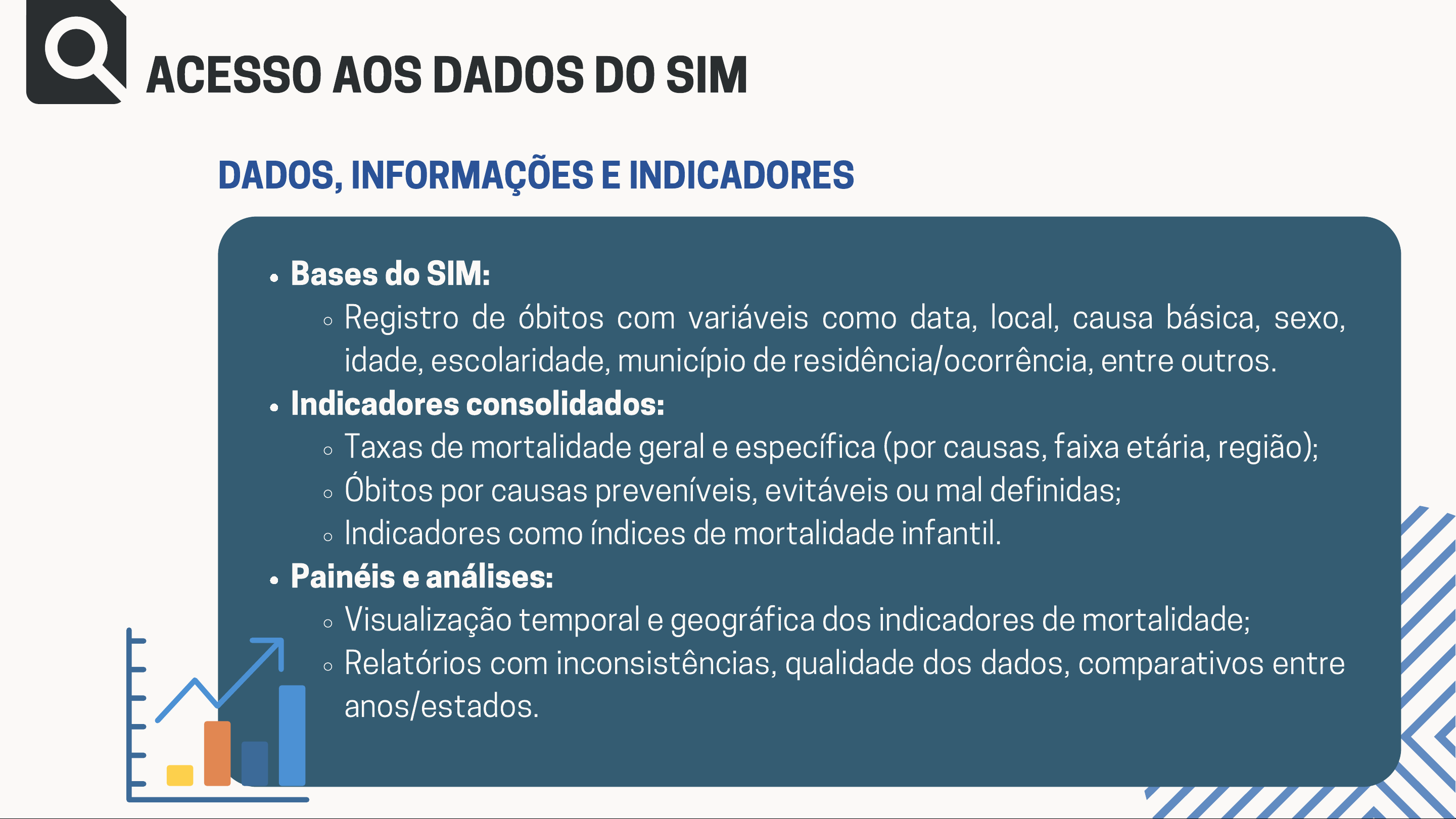 Bases do SIM: Registro de óbitos com variáveis como data, local, causa básica, sexo, idade, escolaridade, município de residência/ocorrência, entre outros. Indicadores consolidados: Taxas de mortalidade geral e específica (por causas, faixa etária, região); Óbitos por causas preveníveis, evitáveis ou mal definidas; Indicadores como índices de mortalidade infantil. Painéis e análises: Visualização temporal e geográfica dos indicadores de mortalidade; Relatórios com inconsistências, qualidade dos dados, comparativos entre anos/estados. DADOS, INFORMAÇÕES E INDICADORES ACESSO AOS DADOS DO SIM COMO O CIDADÃO PODE OBTER DADOS DO SIM? 1. Acesse o site do TABNET/ DATASUS https://datasus.saude.gov.br/informacoes-de-saude-tabnet COMO O CIDADÃO PODE OBTER DADOS DO SIM? 2. Role a página até encontrar “Estatísticas Vitais” Clique em “Mortalidade” COMO O CIDADÃO PODE OBTER DADOS DO SIM? 3. Selecione o tipo de dado de interesse: Escolha entre os diversos tipos de óbitos (ex.: “Mortalidade geral”) Escolha também a abrangência geográfica COMO O CIDADÃO PODE OBTER DADOS DO SIM? 4. Primeira seleção → forma como os dados serão apresentados na tabela de visualização Linha: escolha uma variável (ex: cor/ raça) Coluna: escolha outra variável (ex: faixa etária) Conteúdo: óbitos por residência x óbitos por ocorrência COMO O CIDADÃO PODE OBTER DADOS DO SIM? 5. Segunda seleção → refere-se ao período desejado Use Shift + seta para selecionar múltiplos anos COMO O CIDADÃO PODE OBTER DADOS DO SIM? 6. Configure os demais filtro, caso deseje Exemplo: C53 na Categoria CID-10 COMO O CIDADÃO PODE OBTER DADOS DO SIM? 7. Visualize e exporte os dados: Clique em “Mostra” para gerar a tabela. Após a visualização: Você pode copiar os dados. Ou clicar em “Exportar” e salvar em formato .csv, compatível com o Excel e outros softwares. COMO O CIDADÃO PODE OBTER DADOS DO SIM? Tabela gerada como exemplo: MORTALIDADE DE CÂNCER DE COLO DE ÚTERO PERÍODO: 2019-2022 REGIÃO: NORTE REGIÃO NORTE Alta mortalidade Maior taxa do país (9,07/100 mil em 2021). 1ª causa de morte por câncer entre mulheres da região. Baixa cobertura de prevenção Menor cobertura de PCCU e vacinação contra HPV. Barreiras geográficas e sociais no acesso à saúde. RECORTE HISTÓRICO Taxas de mortalidade por câncer do colo do útero, ajustada por idade pela população mundial. Brasil e Regiões, 2000 a 2021. Fonte: INCA. Atlas de Mortalidade. MORTALIDADE DE CÂNCER DE COLO DE ÚTERO PERÍODO: 2019-2022 REGIÃO: NORTE (FEBRASGO, 2023) 2019: Ano pré-pandemia Funcionamento regular dos serviços de saúde; Alta cobertura de exames (PCCU) e vacinação contra HPV; Base comparativa para os impactos da pandemia. RECORTE HISTÓRICO tabela do sim do ano 2019 MORTALIDADE DE CÂNCER DE COLO DE ÚTERO PERÍODO: 2019-2022 REGIÃO: NORTE 2020–2021: Pandemia de COVID-19 Queda acentuada nos exames preventivos; Queda de até 47,7% na realização de exames em 2020 no Pará; Redução nas taxas de vacinação contra o HPV; Atrasos no diagnóstico e tratamento; Potencial aumento da subnotificação de óbitos. RECORTE HISTÓRICO Número de exames citopatológicos cérvico-vaginais em mulheres de 25 a 64 anos realizados no SUS, Grandes Regiões/ Regiões (Brasil), 2018 a 2022. Fonte: Ministério da Saúde. Sistema de Informações Ambulatoriais do SUS (SIA/SUS). MORTALIDADE DE CÂNCER DE COLO DE ÚTERO PERÍODO: 2019-2022 REGIÃO: NORTE 2022: Retomada dos serviços Reorganização da atenção básica e rastreamento; Reforço gradual nas ações de vacinação e prevenção; Avaliação dos impactos residuais da pandemia. RECORTE HISTÓRICO tabela do SIM 2022 MORTALIDADE DE CÂNCER DE COLO DE ÚTERO PERÍODO: 2019-2022 REGIÃO: NORTE Importância do recorte Evidencia rupturas na linha de cuidado da saúde da mulher; Integra vigilância epidemiológica com prevenção primária e secundária; Região Norte como prioritária para vigilância, rastreamento e intervenções. RECORTE HISTÓRICO Fonte: MS/SVS/CGIAE - Sistema de Informações sobre Mortalidade - SIM RESULTADOS MORTALIDADE DE CÂNCER DE COLO DE ÚTERO PERÍODO: 2019-2022 REGIÃO: NORTE VARIÁVEIS Faixa etária n % 15 - 19 anos 20 - 29 anos 30 - 39 anos 40 - 49 anos 50 - 59 anos 60 - 69 anos 70 - 79 anos 80 anos e mais Cor/ raça Branca Preta Amarela Parda Indígena Ignorado Fonte: MS/SVS/CGIAE - Sistema de Informações sobre Mortalidade - SIM 1 112 510 877 765 605 446 252 583 173 13 2.678 79 62 0,03 3,12 14,21 24,44 21,32 16,86 12,43 7,02 16,24 4,82 0,36 74,63 2,20 1,72 Distribuição das variáveis sociodemográficas de pacientes que vieram a óbito devido ao Câncer de Colo de Útero na Região Norte, no período de 2019 a 2022
