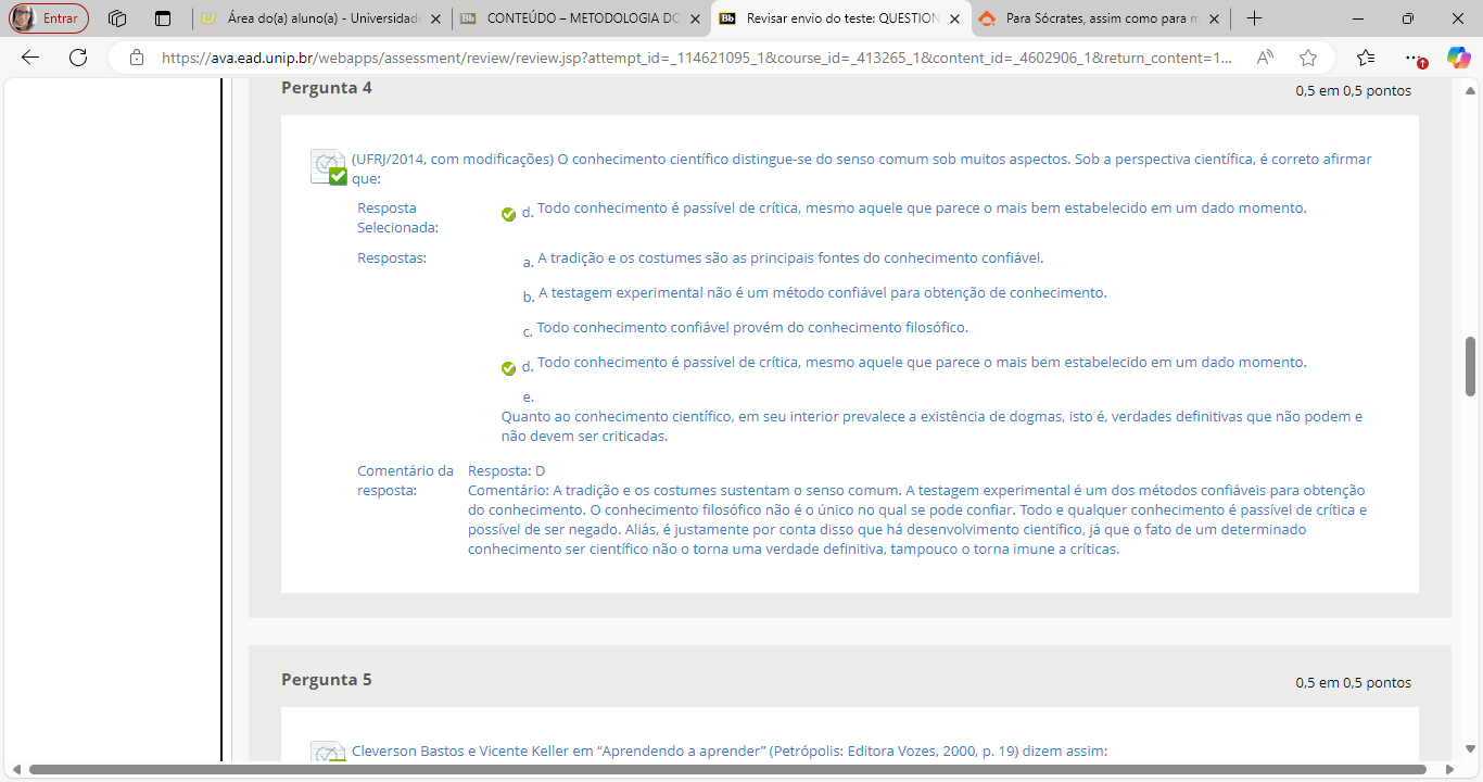 Entrar Área do(a) aluno(a) Universidad X CONTEÚDO - METODOLOGIA DC X Revisar envio do teste: QUESTION X Para Sócrates, assim como para X + X Pergunta 4 0,5 em 0,5 pontos (UFRJ/2014, com modificações) conhecimento científico distingue-se do senso comum sob muitos aspectos. Sob a perspectiva científica, é correto afirmar que: Resposta d. Todo conhecimento é passível de mesmo aquele que parece O mais bem estabelecido em um dado momento. Selecionada: Respostas: a. A tradição e os costumes são as principais fontes do conhecimento confiável. b. A testagem experimental não é um método confiável para obtenção de conhecimento. Todo conhecimento confiável provém do conhecimento filosófico. d. Todo conhecimento é passível de crítica, mesmo aquele que parece mais bem estabelecido em um dado momento. e. Quanto ao conhecimento científico, em seu interior prevalece a existência de dogmas, isto é, verdades definitivas que não podem e não devem ser criticadas. Comentário da Resposta: D resposta: Comentário: A tradição e os costumes sustentam senso comum. A testagem experimental é um dos métodos confiáveis para obtenção do conhecimento. conhecimento filosófico não é único no qual se pode confiar. Todo e qualquer conhecimento é passível de crítica e possível de ser negado. Aliás, é justamente por conta disso que há desenvolvimento científico, já que fato de um determinado conhecimento ser científico não torna uma verdade definitiva, tampouco torna imune a Pergunta 5 0.5 em 0,5 pontos Cleverson Bastos e Vicente Keller em "Aprendendo a aprender" (Petrópolis: Editora Vozes, 2000, p. 19) dizem assim: