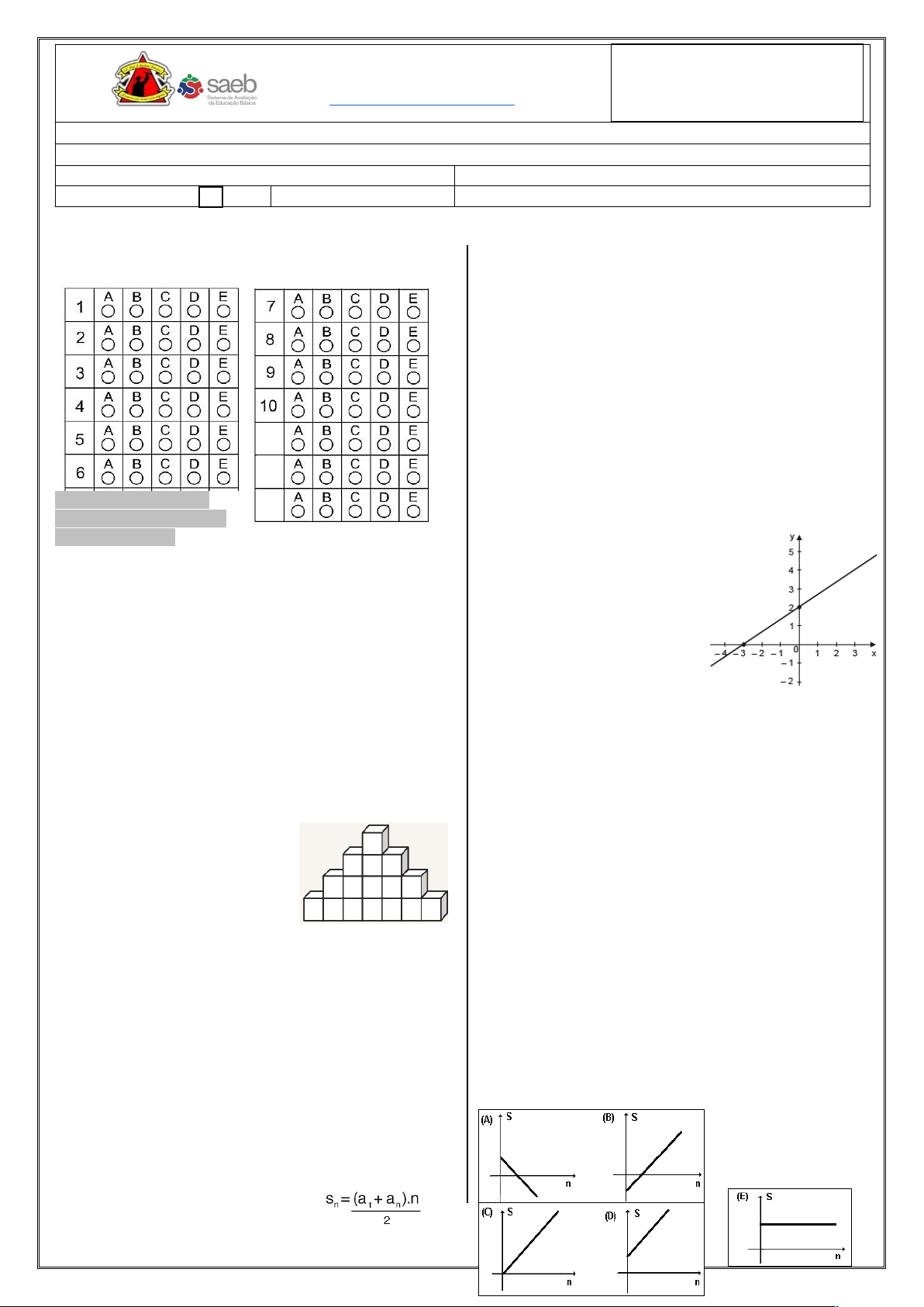 E. E. PROFESSOR JOSÉ MONTEIRO FONSECADESCRITORES DA MATRIZ DE REFERÊNCIA SAEB D18 – Reconhecer uma função a partir de uma tabela. D19 – Resolver problema envolvendo função do 1º grau. D20 – Analisar crescimento/decrescimento, zeros da função do 1º grau. D21 – Identificar o gráfico que representa uma situação. D22 – Resolver problema de P.A dada a fórmula do termo geral. Rua Montes Claros, 110 – Bairro Coronel Olinto Vieira 39.818-000 – Padre Paraíso-MG E-mail: escola.147711@educacao.mg.gov.br 2º SIMULADO AVALIATIVO DE APRENDIZAGEM - SAEB ALUNO (A): COMPONENTE CURRICULAR: MATEMÁTICA PROFESSOR: IANN JARDIM CHAVES TURMA: 3º ANO REG DATA: _____/____/_____ VALOR: 6,0 PTS NOTA: PROFESSOR IANN JARDIM CHAVES GABARITO DE RESPOSTAS Preencha apenas uma bolha por questão.13 12 11 Leia atentamente cada questão antes de responder. QUESTÃO 01 – (NÍVEL 4M). A Copa do Mundo de Futebol é um torneio realizado a cada 4 anos. A sequência abaixo relaciona os anos em que houve a Copa do Mundo desde a conquista do primeiro título brasileiro em 1958. (1958, 1962, 1966, 1970, ...) Quantos torneios foram realizados de 1958 até 2022? (A) 15 (B) 16 (C) 17 (D) 56 (E) 60 QUESTÃO 02 – (NÍVEL 4M). Carla fez uma torre com cubos de madeira. No desenho abaixo está representado alguns cubos da parte de cima dessa torre. Quantos cubos tem a base da torre de Carla, sabendo que ela tem 10 andares? (A) 10 cubos. (D) 20 cubos. (B) 16 cubos. (E) 26 cubos. (C) 19 cubos. QUESTÃO 03 – (NÍVEL 4D). Uma emissora de rádio tem 13000 ouvintes às 14 horas. Se sua audiência aumentar em 2000 ouvintes por hora. (Dado: ). Qual o número de ouvintes às 20 horas? (A) 23000 (B) 25000 (C) 40000 (D) 78000 (E) 26000 QUESTÃO 04 – (NÍVEL 4D). Na loja de Rafaela, inaugurada recentemente, foi analisado que no dia da inauguração foram vendidas 32 peças de roupas, e cada dia posterior houve um aumento nas vendas de 17 peças por dia. Quantas peças foram vendidas no total, 12 dias após a inauguração? (A) 32 peças. (B) 49 peças. (C) 236 peças. (D) 556 peças. (E) 1 506 peças. QUESTÃO 05 – (NÍVEL 2D). Um padeiro fabrica 250 pães por hora. A função que representa a quantidade de pães fabricados p em função do tempo t em horas é: (A) P(t) = 250 + t (B) P(t) = 250/t (C) P(t) = 250 – t (D) P(t) = 250t (E) P(t) = 250t QUESTÃO 06 – (NÍVEL 4F). No gráfico abaixo, está representada uma função polinomial do 1º grau. Qual é a raiz dessa função? (A) – 3 (B) – 1 (C) 1 (D) 2 (E) 3 QUESTÃO 07 – (NÍVEL 2D). Em determinada cidade, a pessoa que deseja andar de taxi deve pagar R$ 4,50 como taxa fixa (bandeirada) mais R$ 1,35 por quilômetro rodado expresso pela função v(x) = 4,50 + 1,35x onde x é a quantidade de quilômetros percorridos na “corrida”. Nestas condições, uma pessoa que percorrer 7 quilômetros em um táxi, pagará pelo serviço (A) R$ 5,35 (B) R$ 5,85 (C) R$ 13,95 (D) R$ 18,00 (E) R$ 21,35 QUESTÃO 08 – (NÍVEL 4F). Uma Associação de Estudantes está a organizar a festa de final de ano, a realizar no ginásio que tem capacidade para 400 alunos. Já foram gastos R$ 500,00 na decoração e nos equipamentos de som e iluminação. Decidiram cobrar por cada bilhete R$ 2,00. A expressão S = 2n - 500 permite calcular o saldo monetário da festa (S) em função do número de bilhetes vendidos (n). Qual dos gráficos representa a relação entre o saldo monetário e o número de bilhetes vendidos? QUESTÃO 09 – (NÍVEL 4M). A tabela abaixo apresenta alguns valores de x e de y, sendo y função da variável x. Uma expressão algébrica que representa essa função é: (A) y = 0,5x + 1,5 (B) y = 0,5x + 3 (C) y = 1,5x + 1,5 (D) y = 3x + 0,5 (E) y = 3x + 1,5 QUESTÃO 10 – (NÍVEL 4M). Luizinho desafia seu irmão mais velho, Pedrão, para uma corrida. Pedrão aceita e permite que o desafiante saia 20 metros a sua frente. Pedrão ultrapassa Luizinho e ganha a corrida. O gráfico que melhor ilustra essa disputa é: QUESTÃO 11 – (NÍVEL 4M). Paulo emprestou R$ 5.000,00 a um amigo, a uma taxa de juros simples de 3% ao mês. Considere x o número de meses do empréstimo e M(x) o montante a ser devolvido para Paulo no final de x meses. Nessas condições, a representação gráfica correta para M(x) é: QUESTÃO 12 – (NÍVEL 4D). QUESTÃO 13 – (NÍVEL 4D). O gráfico abaixo representa o conjunto de pontos de uma função afim. A lei de formação dessa função afim é dada por: (A) F(x) = - x + 1 (B) F(x) = - x – 1 (C) F(x) = x + 1 (D) F(x) = - x (E) F(x) = x - 1 GABARITO 2º SIMULADO DE MATEMÁTICA – SAEB (3º ANO) 1- C 2- C 3- B 4- E 5- D 6- A 7- C 8- B 9- B 10- B 11- A 12- A 13- A NÍVEL 2D – 0,25 (2) – 0,5 NÍVEL 4F – 0,5 (2) – 1,0 NÍVEL 4M – 0,5 (5) – 2,5 NÍVEL 4D – 0,5 (4) – 2,0 image3.png image4.png image5.wmf r n a a n × - + = ) 1 ( 1 oleObject1.bin image6.png image7.png image8.png image9.png image10.png image11.png image12.png image13.png image14.png image15.png image16.png image17.png image18.png image19.png image1.png image2.jpeg