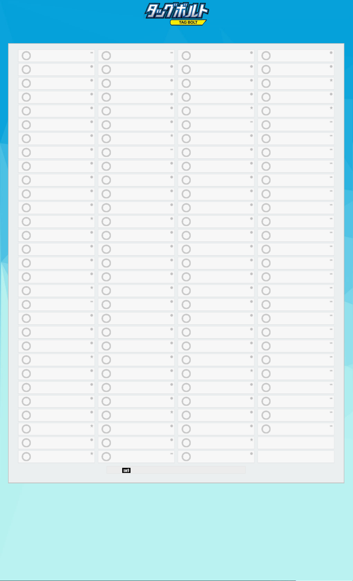 TAG BOLT CHECKLIST This icon will appear on cards in this set via Pokellector Venusaur & Celebi GX 001 Weedle 002 Weedle 003 Kakuna 004 Beedrill 005 Paras 006 Parasect 007 Exeggcute 008 Pinsir 009 Charmander 010 Charmander 011 Charmeleon 012 Charizard 013 Vulpix 014 Ninetales 015 Ponyta 016 Rapidash 017 Moltres 018 Magikarp & Wailord GX 019 Squirtle 020 Squirtle 021 Wartortle 022 Blastoise 023 Psyduck 024 Golduck 025 Staryu 026 Magikarp 027 Gyarados 028 Lapras 029 Articuno 030 Pikachu & Zekrom GX 031 Alolan Geodude 032 Alolan Geodude 033 Alolan Graveler 034 Alolan Golem 035 Voltorb 036 Electrode 037 Gengar & Mimikyu GX 038 Nidoran� 039 Nidorina 040 Nidoqueen 041 Nidoran� 042 Nidorino 043 Nidoking 044 Tentacool 045 Tentacruel 046 Grimer 047 Muk 048 Starmie 049 Mr. Mime 050 Jynx 051 Mankey 052 Primeape 053 Hitmonlee 054 Hitmonchan 055 Omanyte 056 Omastar 057 Kabuto 058 Kabutops 059 Latios & Latias GX 060 Alolan Exeggutor 061 Dratini 062 Dratini 063 Dragonair 064 Dragonite 065 Eevee & Snorlax GX 066 Pidgey 067 Pidgey 068 Pidgeotto 069 Pidgeot 070 Meowth 071 Persian 072 Farfetch'd 073 Kangaskhan 074 Tauros 075 Aerodactyl 076 Escape Rope 077 Judge Whistle 078 Unidentified Fossil 079 Ultra Ball 080 Rare Candy 081 Pokémon Communication 082 Muscle Pad 083 Erika’s Hospitality 084 Judge 085 Cynthia 086 Brock's Grit 087 Sabrina's Hint 088 Bill's Analysis 089 Lavender Tower 090 Viridian Forest 091 Aqua Patch 092 Field Blower 093 Choice Band 094 Volkner 095 Venusaur & Celebi GX 096 Venusaur & Celebi GX 097 Magikarp & Wailord GX 098 Magikarp & Wailord GX 099 Pikachu & Zekrom GX 100 Pikachu & Zekrom GX 101 Gengar & Mimikyu GX 102 Gengar & Mimikyu GX 103 Latios & Latias GX 104 Latios & Latias GX 105 Eevee & Snorlax GX 106 Erika's Hospitality 107 Brock 108 Sabrina's Hint 109 Venusaur & Celebi GX 110 Magikarp & Wailord GX 111 Pikachu & Zekrom GX 112 Gengar & Mimikyu GX 113 Latios & Latias GX 114 Eevee & Snorlax GX 115 Pokémon Communication 116 Judge's Whistle 117 Brooklet Hill 118 http://www.pokellector.com/Tag-Bolt-Expansion/ http://www.pokellector.com/Tag-Bolt-Expansion/Venusaur-Celebi-GX-Card-1 http://www.pokellector.com/Tag-Bolt-Expansion/Weedle-Card-2 http://www.pokellector.com/Tag-Bolt-Expansion/Weedle-Card-3 http://www.pokellector.com/Tag-Bolt-Expansion/Kakuna-Card-4 http://www.pokellector.com/Tag-Bolt-Expansion/Beedrill-Card-5 http://www.pokellector.com/Tag-Bolt-Expansion/Paras-Card-6 http://www.pokellector.com/Tag-Bolt-Expansion/Parasect-Card-7 http://www.pokellector.com/Tag-Bolt-Expansion/Exeggcute-Card-8 http://www.pokellector.com/Tag-Bolt-Expansion/Pinsir-Card-9 http://www.pokellector.com/Tag-Bolt-Expansion/Charmander-Card-10 http://www.pokellector.com/Tag-Bolt-Expansion/Charmander-Card-11 http://www.pokellector.com/Tag-Bolt-Expansion/Charmeleon-Card-12 http://www.pokellector.com/Tag-Bolt-Expansion/Charizard-Card-13 http://www.pokellector.com/Tag-Bolt-Expansion/Vulpix-Card-14 http://www.pokellector.com/Tag-Bolt-Expansion/Ninetales-Card-15 http://www.pokellector.com/Tag-Bolt-Expansion/Ponyta-Card-16 http://www.pokellector.com/Tag-Bolt-Expansion/Rapidash-Card-17 http://www.pokellector.com/Tag-Bolt-Expansion/Moltres-Card-18 http://www.pokellector.com/Tag-Bolt-Expansion/Magikarp-Wailord-GX-Card-19 http://www.pokellector.com/Tag-Bolt-Expansion/Squirtle-Card-20 http://www.pokellector.com/Tag-Bolt-Expansion/Squirtle-Card-21 http://www.pokellector.com/Tag-Bolt-Expansion/Wartortle-Card-22 http://www.pokellector.com/Tag-Bolt-Expansion/Blastoise-Card-23 http://www.pokellector.com/Tag-Bolt-Expansion/Psyduck-Card-24 http://www.pokellector.com/Tag-Bolt-Expansion/Golduck-Card-25 http://www.pokellector.com/Tag-Bolt-Expansion/Staryu-Card-26 http://www.pokellector.com/Tag-Bolt-Expansion/Magikarp-Card-27 http://www.pokellector.com/Tag-Bolt-Expansion/Gyarados-Card-28 http://www.pokellector.com/Tag-Bolt-Expansion/Lapras-Card-29 http://www.pokellector.com/Tag-Bolt-Expansion/Articuno-Card-30 http://www.pokellector.com/Tag-Bolt-Expansion/Pikachu-Zekrom-GX-Card-31 http://www.pokellector.com/Tag-Bolt-Expansion/Alolan-Geodude-Card-32 http://www.pokellector.com/Tag-Bolt-Expansion/Alolan-Geodude-Card-33 http://www.pokellector.com/Tag-Bolt-Expansion/Alolan-Graveler-Card-34 http://www.pokellector.com/Tag-Bolt-Expansion/Alolan-Golem-Card-35 http://www.pokellector.com/Tag-Bolt-Expansion/Voltorb-Card-36 http://www.pokellector.com/Tag-Bolt-Expansion/Electrode-Card-37 http://www.pokellector.com/Tag-Bolt-Expansion/Gengar-Mimikyu-GX-Card-38 http://www.pokellector.com/Tag-Bolt-Expansion/Nidoran-Card-39 http://www.pokellector.com/Tag-Bolt-Expansion/Nidorina-Card-40 http://www.pokellector.com/Tag-Bolt-Expansion/Nidoqueen-Card-41 http://www.pokellector.com/Tag-Bolt-Expansion/Nidoran-Card-42 http://www.pokellector.com/Tag-Bolt-Expansion/Nidorino-Card-43 http://www.pokellector.com/Tag-Bolt-Expansion/Nidoking-Card-44 http://www.pokellector.com/Tag-Bolt-Expansion/Tentacool-Card-45 http://www.pokellector.com/Tag-Bolt-Expansion/Tentacruel-Card-46 http://www.pokellector.com/Tag-Bolt-Expansion/Grimer-Card-47 http://www.pokellector.com/Tag-Bolt-Expansion/Muk-Card-48 http://www.pokellector.com/Tag-Bolt-Expansion/Starmie-Card-49 http://www.pokellector.com/Tag-Bolt-Expansion/Mr-Mime-Card-50 http://www.pokellector.com/Tag-Bolt-Expansion/Jynx-Card-51 http://www.pokellector.com/Tag-Bolt-Expansion/Mankey-Card-52 http://www.pokellector.com/Tag-Bolt-Expansion/Primeape-Card-53 http://www.pokellector.com/Tag-Bolt-Expansion/Hitmonlee-Card-54 http://www.pokellector.com/Tag-Bolt-Expansion/Hitmonchan-Card-55 http://www.pokellector.com/Tag-Bolt-Expansion/Omanyte-Card-56 http://www.pokellector.com/Tag-Bolt-Expansion/Omastar-Card-57 http://www.pokellector.com/Tag-Bolt-Expansion/Kabuto-Card-58 http://www.pokellector.com/Tag-Bolt-Expansion/Kabutops-Card-59 http://www.pokellector.com/Tag-Bolt-Expansion/Latios-Latias-GX-Card-60 http://www.pokellector.com/Tag-Bolt-Expansion/Alolan-Exeggutor-Card-61 http://www.pokellector.com/Tag-Bolt-Expansion/Dratini-Card-6