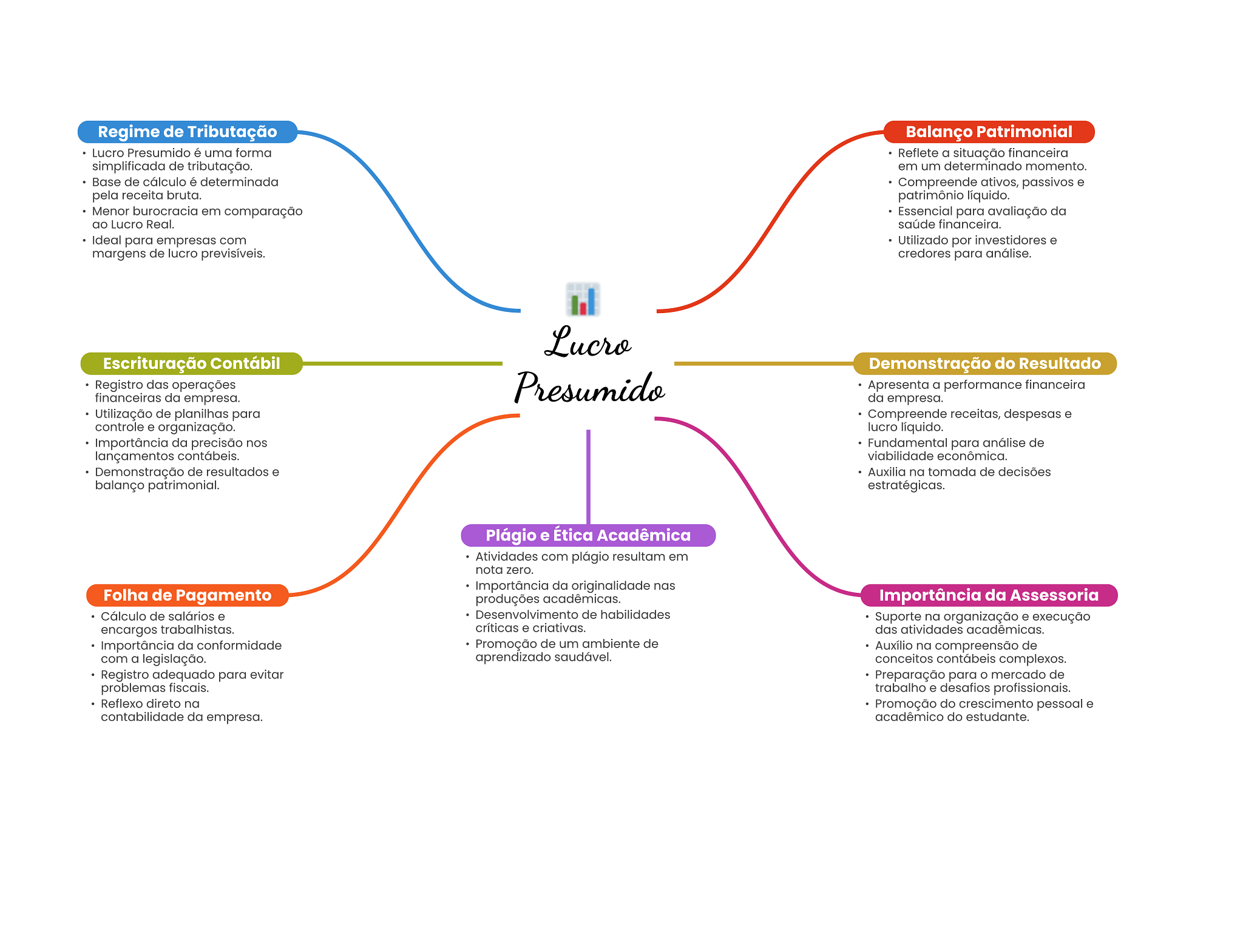 Regime de Tributação Balanço Patrimonial Lucro Presumido é uma forma Reflete a situação financeira simplificada de tributação. em um determinado momento. Base de cálculo é determinada Compreende ativos, passivos e pela receita bruta. patrimônio líquido. Menor burocracia em comparação Essencial para avaliação da ao Lucro Real. saúde financeira. Ideal para empresas com Utilizado por investidores e margens de lucro previsíveis. credores para análise. Lucro Escrituração Contábil Demonstração do Resultado Registro das operações Presumido Apresenta a performance financeira financeiras da empresa. da empresa. Utilização de planilhas para Compreende receitas, despesas e controle e organização. lucro líquido. Importância da precisão nos Fundamental para análise de lançamentos contábeis. viabilidade econômica. Demonstração de resultados e Auxilia na tomada de decisões balanço patrimonial. estratégicas. Plágio e Ética Acadêmica Atividades com plágio resultam em nota zero. Importância da originalidade nas Folha de Pagamento produções acadêmicas. Importância da Assessoria Cálculo de salários e Desenvolvimento de habilidades Suporte na organização e execução encargos trabalhistas. críticas e criativas. das atividades acadêmicas. Importância da conformidade Promoção de um ambiente de Auxílio na compreensão de com a legislação. aprendizado saudável. conceitos contábeis complexos. Registro adequado para evitar Preparação para mercado de problemas fiscais. trabalho e desafios profissionais. Reflexo direto na Promoção do crescimento pessoal e contabilidade da empresa. acadêmico do estudante.