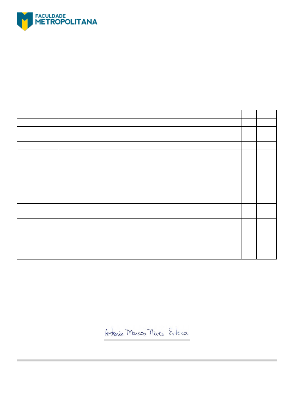 Declaração de Matrícula Declaramos para os devidos fins que, Niceuma Moraes da Silva, CPF 070.263.899-47, está matriculado(a), neste estabelecimento de ensino, no curso de pós-graduação Lato Sensu em “Nutrição no Transtorno do Espectro Autista (TEA)”, de acordo com a Resolução CES/CNE nº 1 de 06 de abril de 2018, com carga horária total de 720 horas, cujas aulas ocorrem a distância, com início em 01/04/2025 e previsão de término em 01/04/2026, conforme cronograma previsto a seguir. A instituição está credenciada pela portaria MEC nº 1.956, de 07 de novembro de 2019. Data Disciplinas CH Nota 28/04/2025 PRINCÍPIOS BÁSICOS DA NUTRIÇÃO 60h 10.0 AVALIAÇÃO NUTRICIONAL GERAL DE CRIANÇAS E ADOLESCENTES 60h AVALIAÇÃO NUTRICIONAL EM COMUNIDADE 60h CONTEXTUALIZAÇÃO E CRITÉRIOS DIAGNÓSTICOS DO AUTISMO 60h FUNDAMENTOS DO DESENVOLVIMENTO CEREBRAL 60h DESENVOLVIMENTO HUMANO E DESAFIOS EM INDIVÍDUOS COM TEA 60h TRATAMENTOS E INTERVENÇÕES NO TEA (ABA, HABILIDADES COGNITIVAS E ANÁLISE FUNCIONAL) 60h TRANSTORNO SENSORIAL E SELETIVIDADE ALIMENTAR NO TEA 60h DESORDENS ALIMENTARES NO TEA 60h AVALIAÇÃO CLÍNICA NUTRICIONAL NO TEA 60h DIETOTERAPIAS NUTRICIONAIS ESPECÍFICAS I 60h DIETOTERAPIAS NUTRICIONAIS ESPECÍFICAS II 60h Carga Horária Total 720 Ribeirão Preto, 30 de Abril de 2025 Código de autenticidade: e5e01b5a689b0b74f31a5033e69f2479 Site para verificação: https://www.estudesemfronteiras.com/novo/autenticidade-declaracao Antonio Marcos Neves Esteca Metropolitan Educação Ltda 13.411.192/0001-70 Av. Presidente Kennedy, 1677 Parque Industrial Lagoinha - Ribeirão Preto / SP CEP: 14095-220 Tel: (16) 3617-1318 Coordenador de Pós-Graduação Metropolitan Educação Ltda 13.411.192/0001-70 Av. Presidente Kennedy, 1677 Parque Industrial Lagoinha - Ribeirão Preto / SP CEP: 14095-220 Tel: (16) 3617-1318