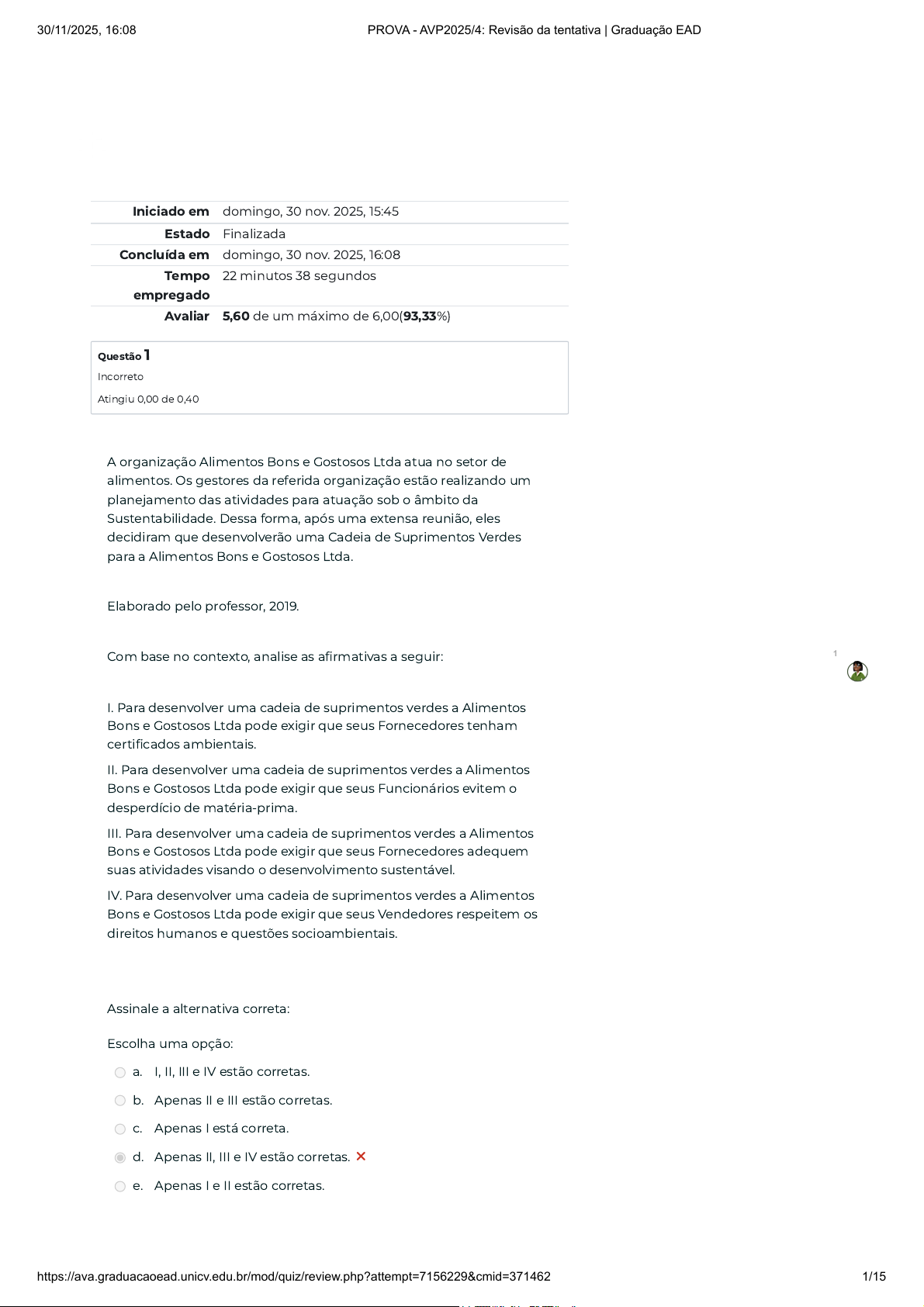 Iniciado em domingo, 30 nov. 2025, 15:45 Estado Finalizada Concluída em domingo, 30 nov. 2025, 16:08 Tempo empregado 22 minutos 38 segundos Avaliar 5,60 de um máximo de 6,00(93,33%) Questão 1 Incorreto Atingiu 0,00 de 0,40 A organização Alimentos Bons e Gostosos Ltda atua no setor de alimentos. Os gestores da referida organização estão realizando um planejamento das atividades para atuação sob o âmbito da Sustentabilidade. Dessa forma, após uma extensa reunião, eles decidiram que desenvolverão uma Cadeia de Suprimentos Verdes para a Alimentos Bons e Gostosos Ltda. Elaborado pelo professor, 2019. Com base no contexto, analise as afirmativas a seguir: I. Para desenvolver uma cadeia de suprimentos verdes a Alimentos Bons e Gostosos Ltda pode exigir que seus Fornecedores tenham certificados ambientais. II. Para desenvolver uma cadeia de suprimentos verdes a Alimentos Bons e Gostosos Ltda pode exigir que seus Funcionários evitem o desperdício de matéria-prima. III. Para desenvolver uma cadeia de suprimentos verdes a Alimentos Bons e Gostosos Ltda pode exigir que seus Fornecedores adequem suas atividades visando o desenvolvimento sustentável. IV. Para desenvolver uma cadeia de suprimentos verdes a Alimentos Bons e Gostosos Ltda pode exigir que seus Vendedores respeitem os direitos humanos e questões socioambientais. Assinale a alternativa correta: Escolha uma opção: a. I, II, III e IV estão corretas. b. Apenas II e III estão corretas. c. Apenas I está correta. d. Apenas II, III e IV estão corretas. × e. Apenas I e II estão corretas. 1 30/11/2025, 16:08 PROVA - AVP2025/4: Revisão da tentativa | Graduação EAD https://ava.graduacaoead.unicv.edu.br/mod/quiz/review.php?attempt=7156229&cmid=371462 1/15 Questão 2 Correto Atingiu 0,40 de 0,40 A ISO 26000 discorre sobre a Responsabilidade Social Corporativa (RSC). Alguns dos tópicos enfatizados na ISO 26000 são: governança da organização, direito humanos e práticas do trabalho. Com base no enunciado, analise as afirmativas a seguir: I. Governança da organização. Apresenta questões relativas a modelagem dos controles internos, gerenciamento das atividades, a estrutura organizacional, ao desenvolvimento de funções, responsabilidades de cada órgão da organização e demais aspectos da governança. II. Direitos Humanos. Apresenta questões relativas Direitos Humanos são as que envolvem a modelagem dos controles internos, gerenciamento das atividades, a estrutura organizacional, ao desenvolvimento de funções, responsabilidades de cada órgão da organização e demais aspectos da governança. III. Governança Corporativa. Discorre sobre práticas de trabalho que contribuem para o bem-estar dos colaboradores. Assinale a alternativa correta: Escolha uma opção: a. Apenas I e II, estão corretas. b. Apenas a II, está correta. c. Apenas a III, está correta. d. Apenas a I, está correta. ✓ e. Apenas II e III, estão corretas. 1 30/11/2025, 16:08 PROVA - AVP2025/4: Revisão da tentativa | Graduação EAD https://ava.graduacaoead.unicv.edu.br/mod/quiz/review.php?attempt=7156229&cmid=371462 2/15 Questão 3 Correto Atingiu 0,40 de 0,40 Carroll (1979) foi um estudioso da Responsabilidade Social Corporativa. Em relação aos tipos de responsabilidade, têm-se a __________________, corresponde cumprir todas leis, ou seja, estar em conformidade com a legislação. Essa responsabilidade é importante, visto que o descumprimento da legislação pode ocasionar sanções, multas, que resultam em saídas de caixa. CARROLL, A. B. A three dimensional conceptual model of corporate social performance. Academy of Management Review, vol. 16, nº. 4, pp. 497 505, 1979. Assinale a alternativa que preenche corretamente a lacuna acima: Escolha uma opção: a. Responsabilidade Ética b. Responsabilidade Legal ✓ c. Responsabilidade Filantrópica d. Responsabilidade Econômica e. Responsabilidade Jurídica. 1 30/11/2025, 16:08 PROVA - AVP2025/4: Revisão da tentativa | Graduação EAD https://ava.graduacaoead.unicv.edu.br/mod/quiz/review.php?attempt=7156229&cmid=371462 3/15 Questão 4 Correto Atingiu 0,40 de 0,40 A B3, bolsa de valores brasileira possui indicadores de sustentabilidade, os quais são utilizados para demonstrar ao mercado de capitais, quais são as organizações que possuem melhores desempenhos sustentáveis. B3. Site da B3, aba índices de sustentabilidade. Ano: 2019. Disponível em: http://www.b3.com.br/pt_br/market-data-e- indices/indices/indices-de-sustentabilidade/. Acesso em: 01 dez. 2019. Considerando o enunciado, avalie as asserções I e II a seguir: I. O Índice de Sustentabilidade Empresarial (ISE) é composto pelas ações das organizações que adotam práticas transparentes com relação a suas emissões de gases efeito estufa (GEE). PORQUE II. O Índice Carbono Eficiente (ICO2) visa propiciar um ambiente de investimento compatível com as demandas de desenvolvimento sustentável da sociedade contemporânea e estimular a Responsabilidade Social Corporativa. Formado pelas organizações com alta liquidez, eficiência econômica, equilíbrio ambiental, justiça social e governança corporativa. A respeito das asserções I e II, assinale a alternativa correta: Escolha uma opção: a. As asserções I e II são proposições falsas. ✓ b. A asserção I é uma proposição falsa e a II é uma proposição verdadeira. c. As asserções I e II são proposições verdadeiras e a II é uma justificativa correta da I. d. A asserção I é uma proposição verdadeira e a II é uma proposição falsa. e. As asserções I e II são proposições verdadeiras, mas a II não é uma justificativa correta da I. 1 30/11/2025, 16:08 PROVA - AVP2025/4: Revisão da tentativa | Graduação EAD https://ava.graduacaoead.unicv.edu.br/mod/quiz/review.php?attempt=7156229&cmid=371462 4/15 Questão 5 Correto Atingiu 0,40 de 0,40 Com o surgimento dos conceitos de Sustentabilidade e Desenvolvimento Sustentável, notou-se que apenas 