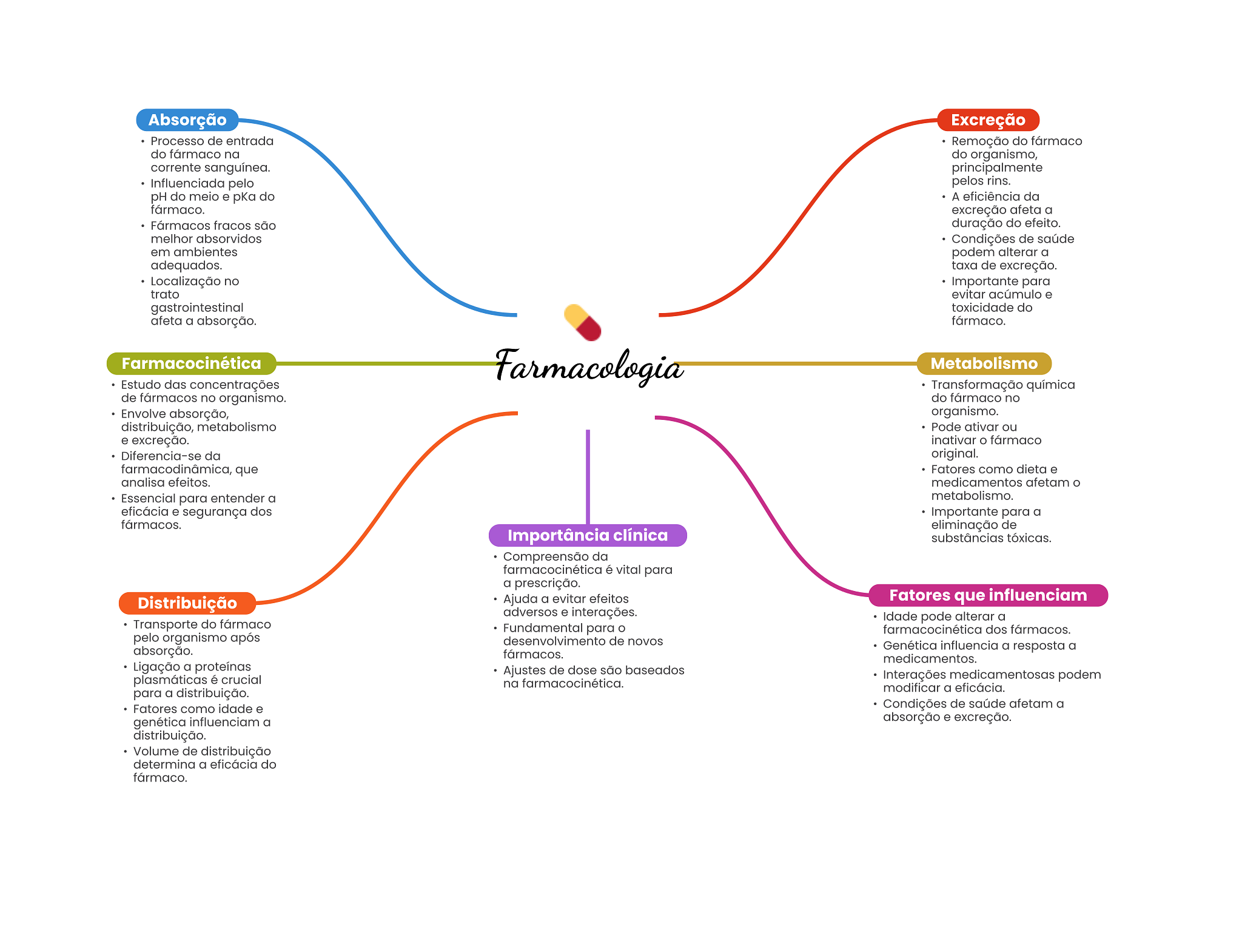 Absorção Excreção Processo de entrada Remoção do fármaco do fármaco na do organismo, corrente sanguínea. principalmente Influenciada pelo pelos rins. pH do meio e do A eficiência da fármaco. excreção afeta a Fármacos fracos são duração do efeito. melhor absorvidos Condições de saúde em ambientes podem alterar a adequados. taxa de excreção. Localização no Importante para trato evitar acúmulo e gastrointestinal toxicidade do afeta a absorção. fármaco. Farmacocinética Farmacologia Metabolismo Estudo das concentrações Transformação química de fármacos no organismo. do fármaco no Envolve absorção, organismo. distribuição, metabolismo Pode ativar ou e excreção. inativar O fármaco Diferencia-se da original. farmacodinâmica, que Fatores como dieta e analisa efeitos. medicamentos afetam Essencial para entender a metabolismo. eficácia e segurança dos Importante para a fármacos. eliminação de Importância clínica substâncias tóxicas. Compreensão da farmacocinética é vital para a prescrição. Distribuição Ajuda a evitar efeitos Fatores que influenciam adversos e interações. Idade pode alterar a Transporte do fármaco Fundamental para farmacocinética dos fármacos. pelo organismo após desenvolvimento de novos absorção. Genética influencia a resposta a fármacos. medicamentos. Ligação a proteínas Ajustes de dose são baseados plasmáticas é crucial Interações medicamentosas podem na farmacocinética. para a distribuição. modificar a eficácia. Fatores como idade e Condições de saúde afetam a genética influenciam a absorção e excreção. distribuição. Volume de distribuição determina a eficácia do fármaco.