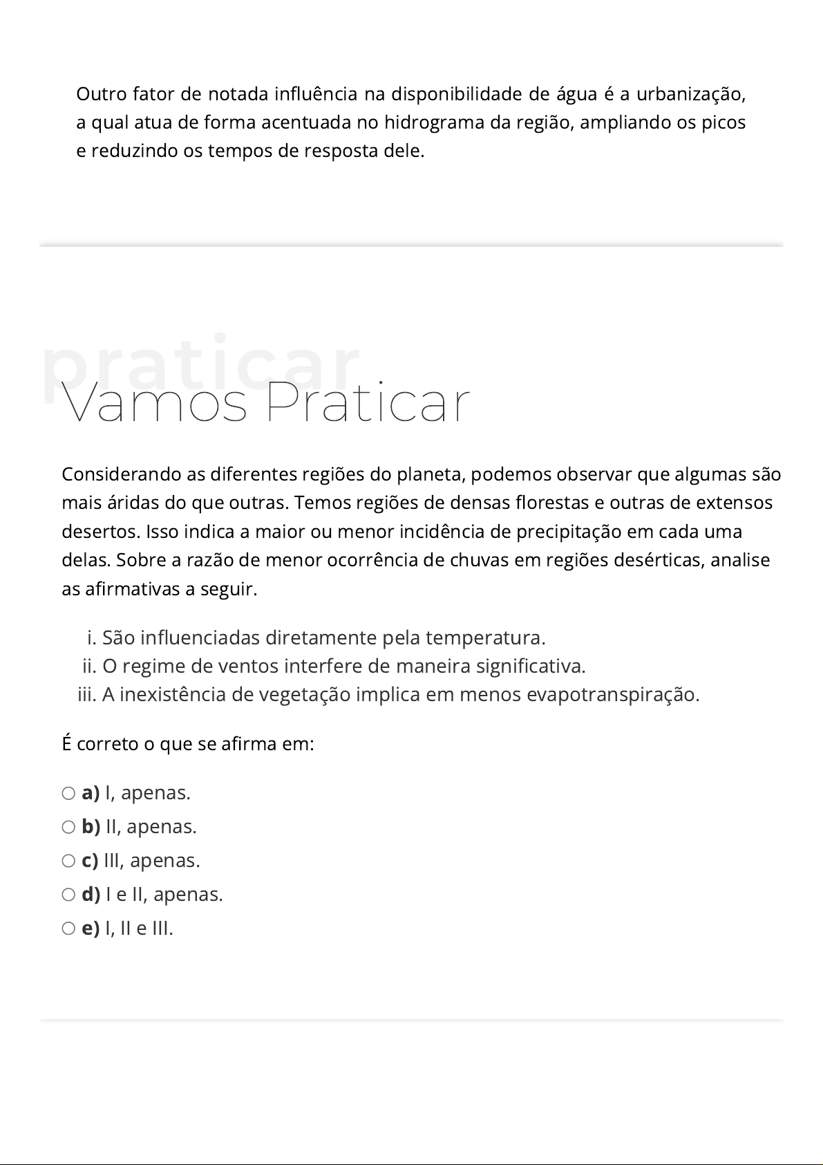 Outro fator de notada influência na disponibilidade de água é a urbanização, a qual atua de forma acentuada no hidrograma da região, ampliando os picos e reduzindo os tempos de resposta dele. praticar Vamos Praticar Considerando as diferentes regiões do planeta, podemos observar que algumas são mais áridas do que outras. Temos regiões de densas florestas e outras de extensos desertos. Isso indica a maior ou menor incidência de precipitação em cada uma delas. Sobre a razão de menor ocorrência de chuvas em regiões desérticas, analise as afirmativas a seguir. i. São influenciadas diretamente pela temperatura. ii. O regime de ventos interfere de maneira significativa. iii. A inexistência de vegetação implica em menos evapotranspiração. É correto o que se afirma em: a) I, apenas. b) II, apenas. c) III, apenas. d) I e II, apenas. e) I, II e III.