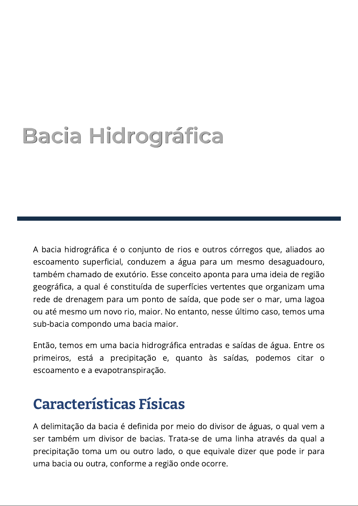 A bacia hidrográfica é o conjunto de rios e outros córregos que, aliados ao escoamento superficial, conduzem a água para um mesmo desaguadouro, também chamado de exutório. Esse conceito aponta para uma ideia de região geográfica, a qual é constituída de superfícies vertentes que organizam uma rede de drenagem para um ponto de saída, que pode ser o mar, uma lagoa ou até mesmo um novo rio, maior. No entanto, nesse último caso, temos uma sub-bacia compondo uma bacia maior. Então, temos em uma bacia hidrográfica entradas e saídas de água. Entre os primeiros, está a precipitação e, quanto às saídas, podemos citar o escoamento e a evapotranspiração. Características Físicas A delimitação da bacia é definida por meio do divisor de águas, o qual vem a ser também um divisor de bacias. Trata-se de uma linha através da qual a precipitação toma um ou outro lado, o que equivale dizer que pode ir para uma bacia ou outra, conforme a região onde ocorre. Bacia HidrográficaBacia Hidrográfica