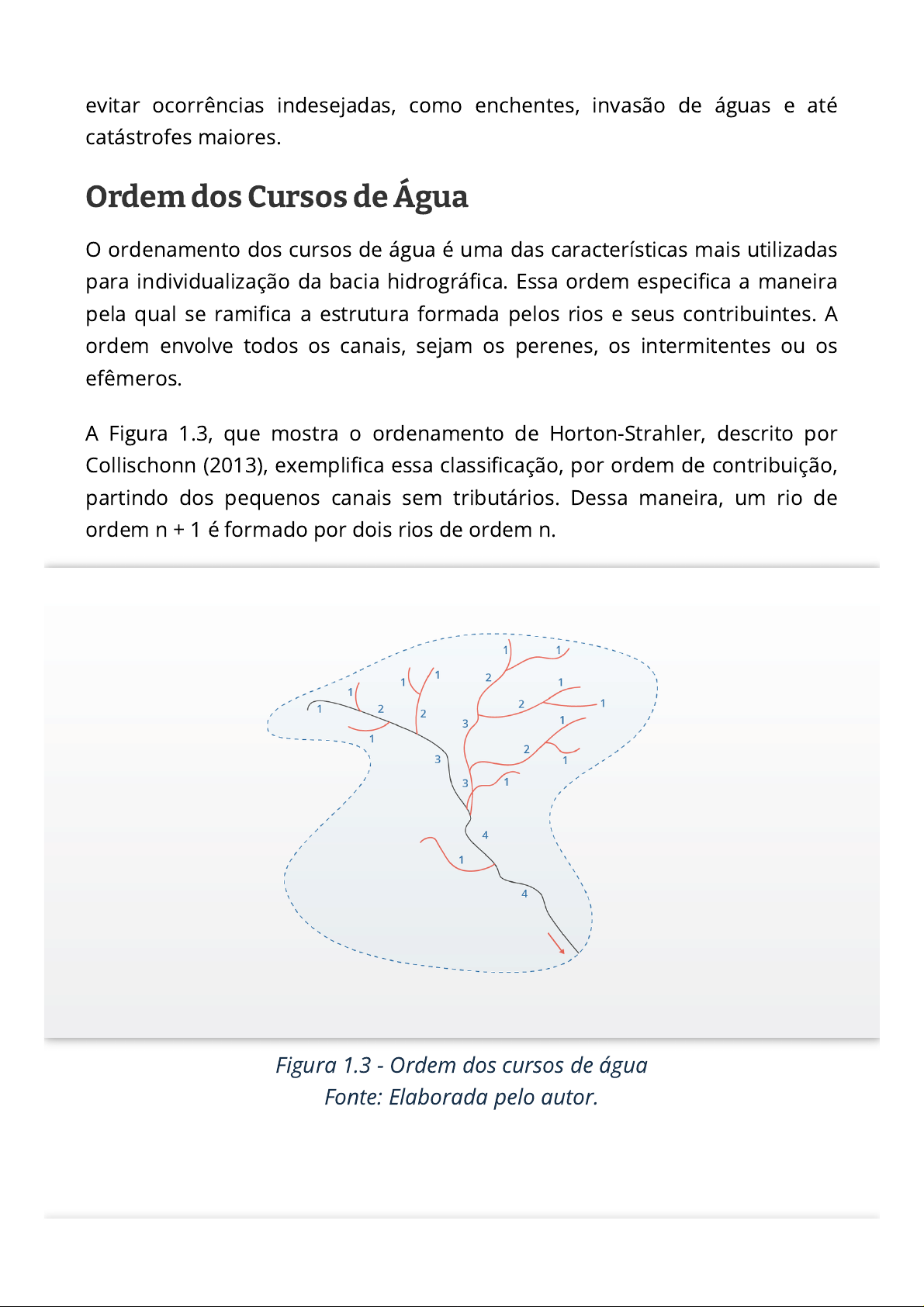 evitar ocorrências indesejadas, como enchentes, invasão de águas e até catástrofes maiores. Ordem dos Cursos de Água O ordenamento dos cursos de água é uma das características mais utilizadas para individualização da bacia hidrográfica. Essa ordem especifica a maneira pela qual se ramifica a estrutura formada pelos rios e seus contribuintes. A ordem envolve todos os canais, sejam os perenes, os intermitentes ou os efêmeros. A Figura 1.3, que mostra o ordenamento de Horton-Strahler, descrito por Collischonn (2013), exemplifica essa classificação, por ordem de contribuição, partindo dos pequenos canais sem tributários. Dessa maneira, um rio de ordem n + 1 é formado por dois rios de ordem n. Figura 1.3 - Ordem dos cursos de água Fonte: Elaborada pelo autor.
