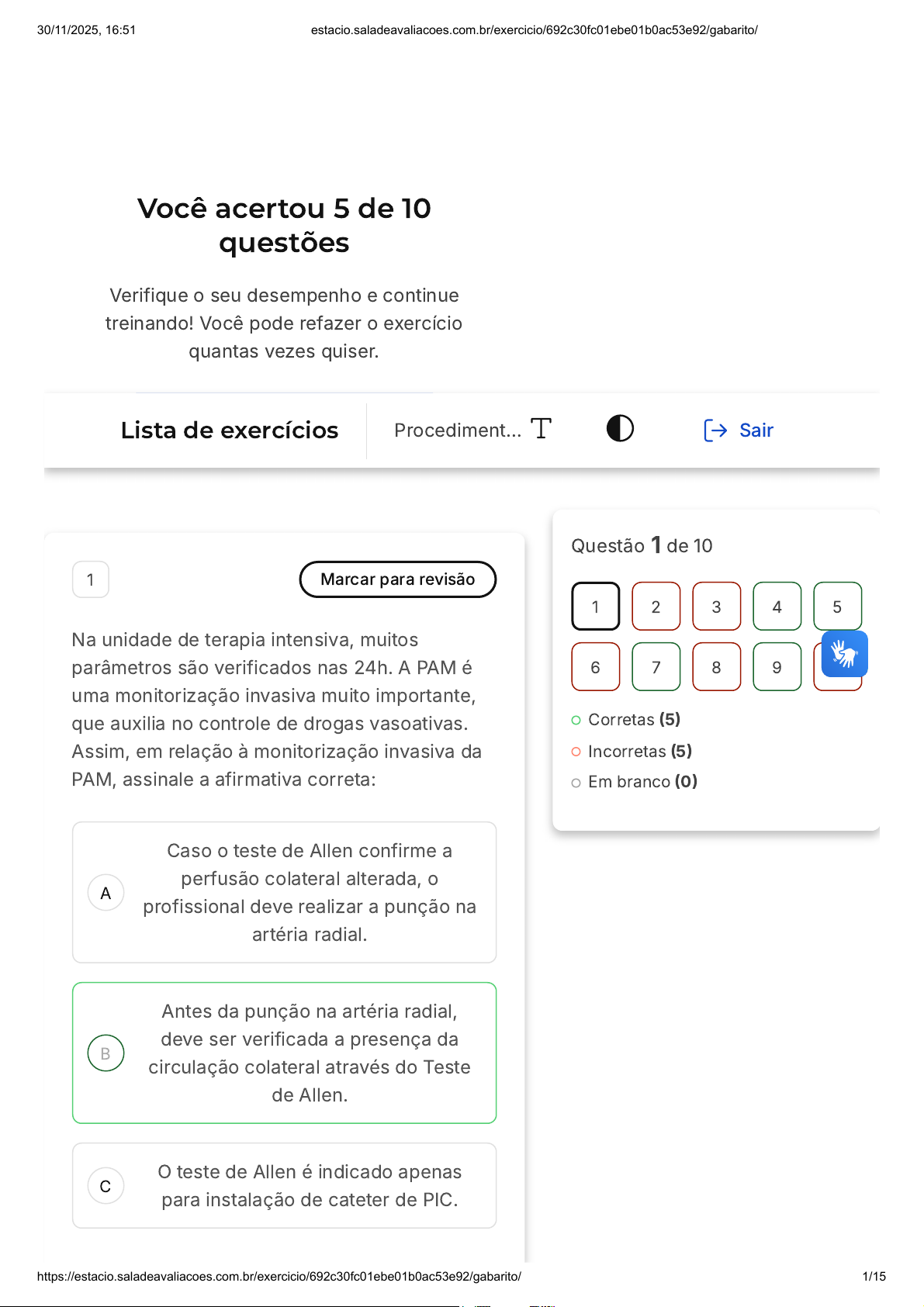 Você acertou 5 de 10 questões Verifique o seu desempenho e continue treinando! Você pode refazer o exercício quantas vezes quiser. Verificar Desempenho A B C 1 Marcar para revisão Na unidade de terapia intensiva, muitos parâmetros são verificados nas 24h. A PAM é uma monitorização invasiva muito importante, que auxilia no controle de drogas vasoativas. Assim, em relação à monitorização invasiva da PAM, assinale a afirmativa correta: Caso o teste de Allen confirme a perfusão colateral alterada, o profissional deve realizar a punção na artéria radial. Antes da punção na artéria radial, deve ser verificada a presença da circulação colateral através do Teste de Allen. O teste de Allen é indicado apenas para instalação de cateter de PIC. Questão 1 de 10 Corretas (5) Incorretas (5) Em branco (0) 1 2 3 4 5 6 7 8 9 10 Lista de exercícios Procediment… Sair 30/11/2025, 16:51 estacio.saladeavaliacoes.com.br/exercicio/692c30fc01ebe01b0ac53e92/gabarito/ https://estacio.saladeavaliacoes.com.br/exercicio/692c30fc01ebe01b0ac53e92/gabarito/ 1/15 D E Antes da punção na artéria ulnar, deve ser verificada a presença da circulação colateral através do Teste de Stevens. A PAM não auxilia no controle do uso de drogas vasoativas. Resposta correta Parabéns, você selecionou a alternativa correta. Confira o gabarito comentado! Gabarito Comentado A alternativa correta é a B. O Teste de Allen é um procedimento realizado antes da punção na artéria radial para verificar a presença da circulação colateral. Este teste é crucial para garantir a segurança do paciente, pois, se a circulação colateral estiver inadequada, a punção na artéria radial pode levar a complicações graves, como a isquemia. Portanto, se o Teste de Allen indicar uma circulação colateral inadequada, o profissional de saúde não deve realizar a punção na artéria radial. 2 Marcar para revisão A pressão intracraniana, ou PIC, é considerada o principal parâmetro para monitorização neurológica e consiste na relação da pressão e volume do conteúdo da calota craniana com o crânio. Acerca da PIC, marque a alternativa correta. 30/11/2025, 16:51 estacio.saladeavaliacoes.com.br/exercicio/692c30fc01ebe01b0ac53e92/gabarito/ https://estacio.saladeavaliacoes.com.br/exercicio/692c30fc01ebe01b0ac53e92/gabarito/ 2/15 A B C D E A PIC contribui para o reconhecimento e tratamento tardios da Hipertensão Intracraniana. O reconhecimento precoce e o tratamento inicial da PIC elevada não aumentam as chances de sucesso no seu manejo. A PIC pode ser classificada em 3 componentes: parenquimatoso, liquórico e vascular. Seu objetivo é prevenir ou diagnosticar precocemente os eventos que podem desencadear lesões cardíacas ou respiratórias. O valor padrão da PIC varia de 3 a 10 mmHg para adultos, sendo a elevação acima deste valor considerada hipertensão intracraniana (HIC). Resposta incorreta Opa! A alternativa correta é a letra C. Confira o gabarito comentado! Gabarito Comentado A alternativa correta é a C, que afirma que a Pressão Intracraniana (PIC) pode ser classificada em três componentes: parenquimatoso, liquórico e vascular. Isso significa que a PIC é composta pela pressão exercida pelo tecido cerebral (parenquimatoso), pelo líquido cefalorraquidiano (liquórico) e pelo sangue (vascular) dentro do crânio. Essa 30/11/2025, 16:51 estacio.saladeavaliacoes.com.br/exercicio/692c30fc01ebe01b0ac53e92/gabarito/ https://estacio.saladeavaliacoes.com.br/exercicio/692c30fc01ebe01b0ac53e92/gabarito/ 3/15 A B C D E classificação é fundamental para entender a dinâmica da PIC e para o manejo adequado de condições que envolvem alterações na pressão intracraniana, como a hipertensão intracraniana. 3 Marcar para revisão O fluxo sanguíneo cerebral é analisado através da pressão de perfusão cerebral (PPC). A PPC normal mantém a estabilidade do fluxo sanguíneo para o cérebro mediante contração ou dilatação dos vasos sanguíneos cerebrais. Acerca da PPC, marque a alternativa correta. A PPC igual a 0 não significa ausência de fluxo cerebral. A PPC tem relação direta com os valores da Pressão Arterial Média e da Pressão Intracraniana. A PPC tem relação direta com os valores da Pressão Venosa Central e da Pressão Intracraniana. A PPC não apresenta variação, o que varia são os valores da Pressão Venosa Central e da Pressão Intracraniana. O valor padrão da PPC varia de 3 a 10 mmHg para lactentes e abaixo de 15 mmHg para as demais idades. 30/11/2025, 16:51 estacio.saladeavaliacoes.com.br/exercicio/692c30fc01ebe01b0ac53e92/gabarito/ https://estacio.saladeavaliacoes.com.br/exercicio/692c30fc01ebe01b0ac53e92/gabarito/ 4/15 Resposta incorreta Opa! A alternativa correta é a letra B. Confira o gabarito comentado! Gabarito Comentado A Pressão de Perfusão Cerebral (PPC) é calculada pela diferença entre a Pressão Arterial Média (PAM) e a Pressão Intracraniana (PIC). Isso significa que a PPC tem uma relação direta com esses dois valores. A manutenção da estabilidade do fluxo sanguíneo cerebral, mesmo diante de variações de pressão sanguínea no restante do corpo, é garantida pela capacidade de contração ou dilatação dos vasos sanguíneos cerebrais. Portanto, a alternativa B está correta, pois afirma que a PPC tem relação direta com os valores da PAM e da PIC. 4 Marcar para revisão Em relação à instalação do CVC, o enfermeiro tem papel determinante e essencial nos períodos pré, trans e pós procedimento, além do processo terapêutico em si. Sobre os cuidados de enfermagem ao paciente com CVC, marque a alternativa correta. 30/11/2025, 16:51 estacio.saladeavaliacoes.com.br/exercicio/692c30fc01ebe01b0ac53e92/gabarito/ https://estacio.saladeavaliacoes.com.br/exercicio/692c30fc01ebe01b0ac53e92/gabarito/ 5/15 A B C D E O primeiro curativo do CVC deve ser feito em até 12 dias após sua instalação; A remoção do CVC deve ser feita de forma rápida e s
