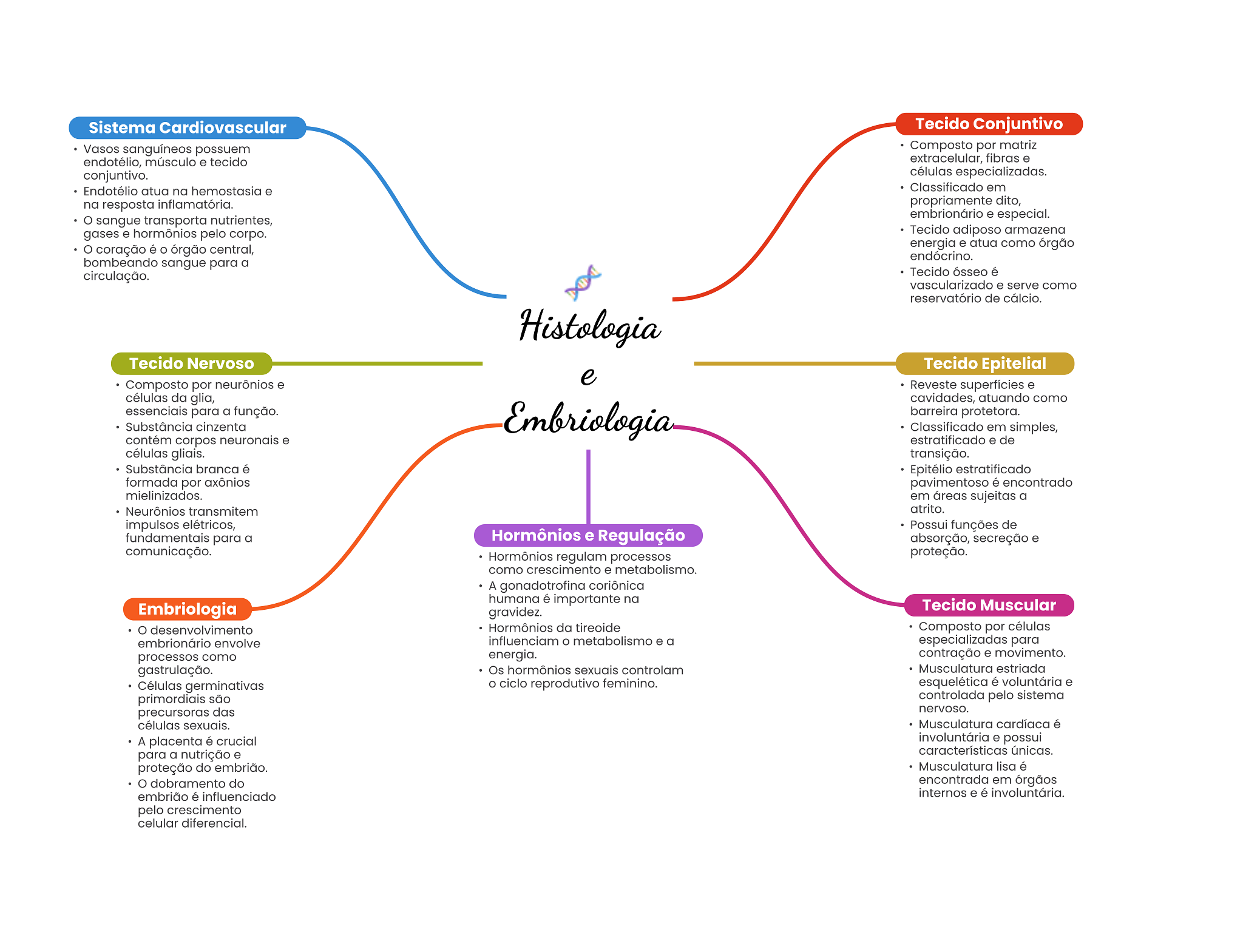 Sistema Cardiovascular Tecido Conjuntivo Vasos sanguíneos possuem Composto por matriz endotélio, músculo e tecido extracelular, fibras e conjuntivo. células especializadas. Endotélio atua na hemostasia e Classificado em na resposta inflamatória. propriamente dito, sangue transporta nutrientes, embrionário e especial. gases e hormônios pelo corpo. Tecido adiposo armazena coração é órgão central, energia e atua como órgão endócrino. bombeando sangue para a circulação. Tecido ósseo é vascularizado e serve como reservatório de cálcio. Histologia Tecido Nervoso Tecido Epitelial e Composto por neurônios e Reveste superfícies e células da glia, cavidades, atuando como essenciais para a função. Embriologia barreira protetora. Substância cinzenta Classificado em simples, contém corpos neuronais e estratificado e de células gliais. transição. Substância branca é Epitélio estratificado formada por axônios pavimentoso é encontrado mielinizados. em áreas sujeitas a Neurônios transmitem atrito. impulsos elétricos, Possui funções de fundamentais para a Hormônios e Regulação absorção, secreção e comunicação. Hormônios regulam processos proteção. como crescimento e metabolismo. A gonadotrofina coriônica humana é importante na Embriologia Tecido Muscular gravidez. desenvolvimento Hormônios da tireoide Composto por células embrionário envolve influenciam metabolismo e a especializadas para processos como energia. contração e movimento. gastrulação. Os hormônios sexuais controlam Musculatura estriada Células germinativas ciclo reprodutivo feminino. esquelética é voluntária e primordiais são controlada pelo sistema precursoras das nervoso. células sexuais. Musculatura cardíaca é A placenta é crucial involuntária e possui para a nutrição e características únicas. proteção do embrião. Musculatura lisa é dobramento do encontrada em órgãos embrião é influenciado internos e é involuntária. pelo crescimento celular diferencial.