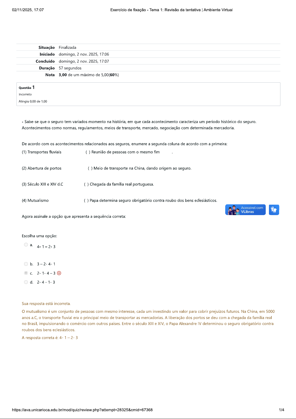 02/11/2025, 17:07 Exercício de fixação - Tema 1: Revisão da tentativa Ambiente Virtual Situação Finalizada Iniciado domingo, 2 nov. 2025, 17:06 Concluído domingo, 2 nov. 2025, 17:07 Duração 57 segundos Nota 3,00 de um máximo de 5,00(60%) Questão 1 Incorreto Atingiu 0,00 de 1,00 Sabe-se que seguro tem variados momento na história, em que cada acontecimento caracteriza um período histórico do seguro. Acontecimentos como normas, regulamentos, meios de transporte, mercado, negociação com determinada mercadoria. De acordo com os acontecimentos relacionados aos seguros, enumere a segunda coluna de acordo com a primeira: (1) Transportes fluviais Reunião de pessoas com o mesmo fim (2) Abertura de portos Meio de transporte na China, dando origem ao seguro. (3) Século XIII e XIV d.C Chegada da família real portuguesa. (4) Mutualismo Papa determina seguro obrigatório contra roubo dos bens eclesiásticos. Acessível com VLibras Agora assinale a opção que apresenta a sequência correta: Escolha uma opção: a. 4-1-2-3 b. 3-2-4-1 C. Sua resposta está incorreta. mutualismo é um conjunto de pessoas com mesmo interesse, cada um investindo um valor para cobrir prejuízos futuros. Na China, em 5000 anos transporte fluvial era principal meio de transportar as mercadorias. A liberação dos portos se deu com a chegada da família real no Brasil, impulsionando comércio com outros países. Entre século XIII e XIV, Papa Alexandre IV determinou seguro obrigatório contra roubos dos bens eclesiásticos. A resposta correta é:4-1-2-3 1/402/11/2025, 17:07 Exercício de fixação - Tema 1: Revisão da tentativa Ambiente Virtual Questão 2 Correto Atingiu 1,00 de 1,00 A história do seguro foi dividida em períodos, como período pré-histórico, período antigo e período moderno. Cada um tem sua característica própria, como tempo, acontecimentos, tipos de seguros, país etc. Com base nos acontecimentos ocorridos em cada período, identifique os referentes ao período moderno. I. Criação da Susep e Código Civil no Brasil. II. Surge o Código de Hamurabi. III. Troca do trabalho artesanal para o maquinário. IV. Publicação em Portugal da primeira lei de seguros. Agora, assinale a opção que apresenta as afirmativas corretas: Escolha uma opção: a. As afirmativas I, e III estão corretas. b. As afirmativas II e III estão corretas. C. As afirmativas I e estão corretas. d. As afirmativas le III estão corretas. Acessível com VLibras Sua resposta está correta. A afirmativa está correta, pois a Susep e Código Civil foram criados no Brasil no século A afirmativa III está correta, pois a troca do trabalho artesanal pelas máquinas consiste na revolução industrial que marcou o período moderno. A resposta correta é: As afirmativas e III estão corretas. 2/402/11/2025, 17:07 Exercício de fixação - Tema 1: Revisão da tentativa Ambiente Virtual Questão 3 Incorreto Atingiu 0,00 de 1,00 No Brasil, vários fatores contribuíram para a evolução das companhias de seguro, apesar de, na época, o país ser uma colônia de Portugal e todos os bens manufaturados serem oriundos de lá. Sabendo disso, qual principal fator que impulsionou mercado de seguro no Brasil? Escolha a opção que responde corretamente à questão. Escolha uma opção: a. Criação do Código Comercial. b. A vinda de empresas seguradoras para o Brasil. C. A abertura dos portos e a liberação de comercialização com outros países. d. A vinda da família real. Sua resposta está incorreta. Com a abertura dos portos por Dom João VI, em 1808, Brasil praticamente deixou de ser colônia, passando a negociar com outros países, não ficando tão dependente de Portugal. A resposta correta é: A abertura dos portos e a liberação de comercialização com outros países. Questão 4 Correto Atingiu 1,00 de 1,00 Acessível com VLibras "Em 1986, uma resolução do CNSP (revogada depois pela resolução CNSP no 14/98) havia fixado em 50% teto da participação do capital estrangeiro em empresas nacionais, limitado a um terço do capital votante, exceto para casos de interesse do governo brasileiro, de reciprocidade ou de acordos internacionais autorizados pelo presidente da Republica" (SOUZA, 2007, p. 09). SOUZA, S. Contabilidade de seguros, atuária e auditoria. São Paulo: Saraiva, 2007. Antes dessa resolução não havia restrições para o capital estrangeiro no Brasil. Qual a consequência dessa resolução? Escolha a opção que responde corretamente à questão. Escolha uma opção: a. mercado continuaria estável. b. Aumento do capital estrangeiro no Brasil. C. Poderia aumentar ou diminuir o capital, dependendo do mercado. d. Diminuição do capital estrangeiro no Brasil. Sua resposta está correta. Com teto de 50%, haveria uma inibição dos investidores nas empresas internacionais, que passariam a ter um limite para aplicar no país, o que ocasionaria uma diminuição do capital estrangeiro. A resposta correta é: Diminuição do capital estrangeiro no Brasil. 3/402/11/2025, 17:07 Exercício de fixação - Tema 1: Revisão da tentativa Ambiente Virtual Questão 5 Correto Atingiu 1,00 de 1,00 "A globalização e o aumento de competitividade no mundo não é, nos dias atuais, uma característica exclusiva do setor de seguros. Buscar maior eficiência e eficácia operacional tornou-se uma questão de sobrevivência. Estima-se que pelo menos metade das seguradoras existentes no Brasil, principalmente as pequenas, desaparecerão nos próximos anos, vítimas do processo de globalização, concentração e profissionalização do mercado" (SOUZA, 2007, p. 11). SOUZA, S. Contabilidade de seguros, atuária e auditoria. São Paulo: Saraiva, 2007. Qual a melhor explicação para esse acirramento de concorrência? Escolha a opção que responde corretamente à questão. Escolha uma opção: a. A abertura do mercado ao capital estrangeiro, a quebra do monopólio do IRB. b. governo está dificultando a entrada de capital estra