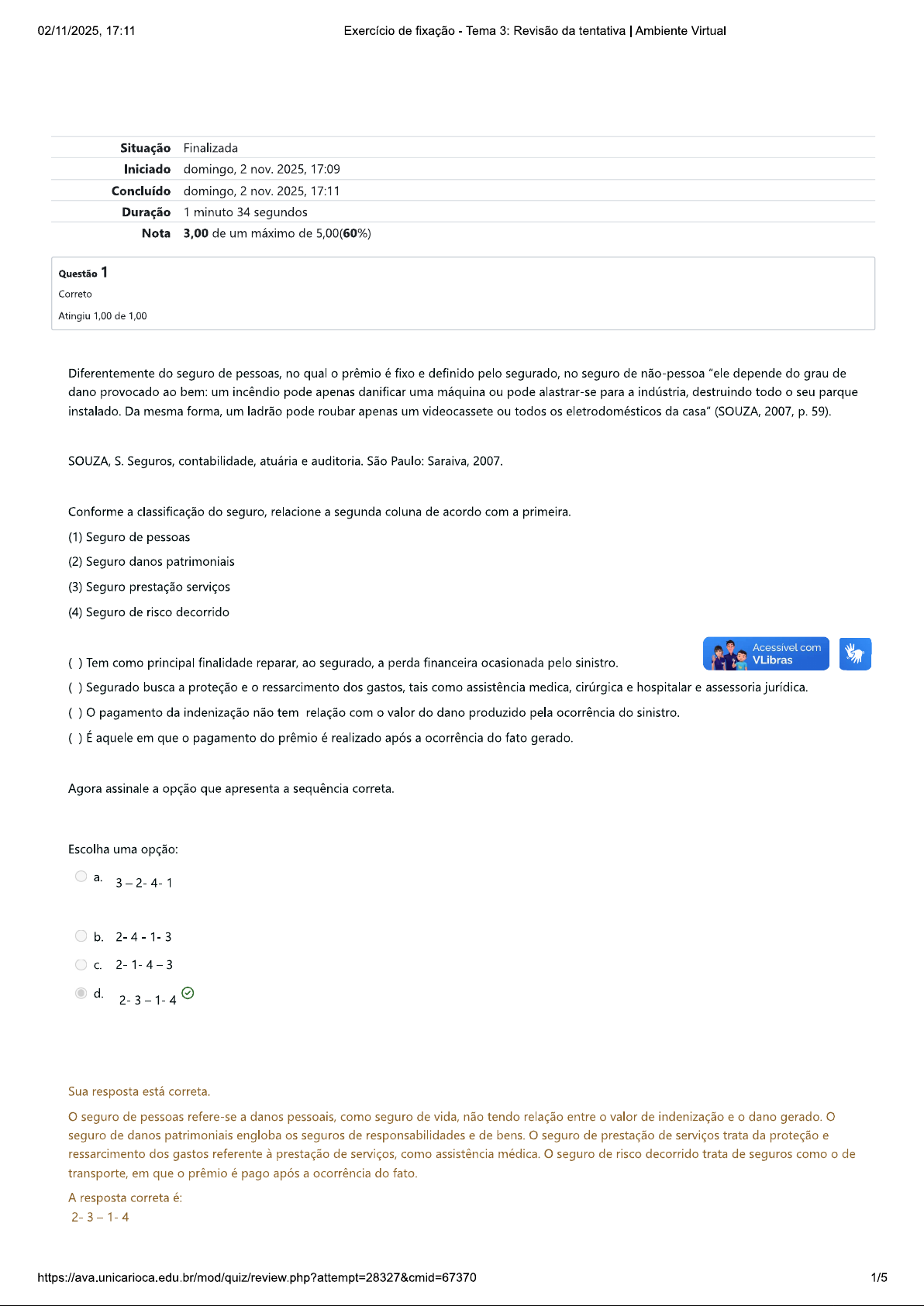 02/11/2025, 17:11 Exercício de fixação - Tema 3: Revisão da tentativa Ambiente Virtual Situação Finalizada Iniciado domingo, 2 nov. 2025, 17:09 Concluído domingo, 2 nov. 2025, 17:11 Duração 1 minuto 34 segundos Nota 3,00 de um máximo de 5,00(60%) Questão 1 Correto Atingiu 1,00 de 1,00 Diferentemente do seguro de pessoas, no qual o prêmio é fixo e definido pelo segurado, no seguro de não-pessoa "ele depende do grau de dano provocado ao bem: um incêndio pode apenas danificar uma máquina ou pode alastrar-se para a indústria, destruindo todo o seu parque instalado. Da mesma forma, um ladrão pode roubar apenas um videocassete ou todos os eletrodomésticos da casa" (SOUZA, 2007, p. 59). SOUZA, S. Seguros, contabilidade, atuária e auditoria. São Paulo: Saraiva, 2007. Conforme a classificação do seguro, relacione a segunda coluna de acordo com a primeira. (1) Seguro de pessoas (2) Seguro danos patrimoniais (3) Seguro prestação serviços (4) Seguro de risco decorrido Acessível com Tem como principal finalidade reparar, ao segurado, a perda financeira ocasionada pelo sinistro. VLibras Segurado busca a proteção e o ressarcimento dos gastos, tais como assistência medica, cirúrgica e hospitalar e assessoria jurídica. pagamento da indenização não tem relação com o valor do dano produzido pela ocorrência do sinistro. É aquele em que o pagamento do prêmio é realizado após a ocorrência do fato gerado. Agora assinale a opção que apresenta a sequência correta. Escolha uma opção: a. b. 2-4-1-3 C. 2-1-4-3 d. 2-3-1-4 Sua resposta está correta. seguro de pessoas refere-se a danos pessoais, como seguro de vida, não tendo relação entre valor de indenização e dano gerado. seguro de danos patrimoniais engloba os seguros de responsabilidades e de bens. seguro de prestação de serviços trata da proteção e ressarcimento dos gastos referente à prestação de serviços, como assistência médica. seguro de risco decorrido trata de seguros como de transporte, em que prêmio é pago após a ocorrência do fato. A resposta correta é: 2-3-1-4 1/502/11/2025, 17:11 Exercício de fixação - Tema 3: Revisão da tentativa Ambiente Virtual Questão 2 Incorreto Atingiu 0,00 de 1,00 "Seguro de vida individual tem como característica a longa duração do contrato e suas apólices podem ter coberturas para riscos de morte natural, acidental, por invalidez permanente total ou parcial por acidentes ou por doenças" (SOUZA, 2007, p. 61). Existem três modalidades deste seguro: seguro de vida ordinário, de pagamentos limitados e dotal. SOUZA, S. Seguros, contabilidade, atuária e auditoria. São Paulo: Saraiva, 2007. Analise as afirmativas a seguir sobre a modalidade de seguro de vida dotal. I. Enquanto viver segurado paga prêmios anuais ao segurador. II. segurado paga os prêmios anualmente, durante um período de tempo estipulado no contrato. III. Ele só paga os prêmios durante um período de tempo determinado no contrato. Agora, assinale a opção que apresenta a(s) afirmativa(s) correta(s). Escolha uma opção: a. As afirmativas I, e III estão corretas. b. Apenas a afirmativa está correta. As afirmativas le estão corretas. d. As afirmativas e III estão corretas. Acessível com VLibras Sua resposta está incorreta. A afirmativa está correta, pois apresenta o conceito de seguro de vida dotal, qual seja, que os prêmios são pagos anualmente, durante o período de tempo estipulado no contrato. Depois de um ano, a indenização devida poderá ser paga ao próprio segurado ou a um beneficiário indicado por ele. A resposta correta é: Apenas a afirmativa está correta. 2/502/11/2025, 17:11 Exercício de fixação - Tema 3: Revisão da tentativa Ambiente Virtual Questão 3 Correto Atingiu 1,00 de 1,00 mais popular seguro no Brasil, seguro de automóveis, tem como função cobrir perdas ou danos dos veículos terrestres de propulsão a motor e a seus reboques, desde que não trafeguem sobre trilhos. SOUZA, S. Seguros, contabilidade, atuária e auditoria. São Paulo: Saraiva, 2007. Dependendo da forma como for contratado, o seguro de automóveis poderá cobrir quais sinistros? Escolha a opção que responde corretamente à questão. Escolha uma opção: a. Roubo, morte em decorrência de acidentes, desastres. b. Batidas, roubos, brigas de trânsito. C. Cargas e descargas, fenômenos da natureza como tempestade. d. Colisão, incêndio e roubo do carro segurado, além de indenizar os prejuízos que, em decorrência do acidente, possam ser causados a terceiros. Sua resposta está correta. seguro de automóveis pode cobrir colisão, incêndio e roubo do carro segurado, além de indenizar os prejuízos que, em decorrência do acidente, possam ser causados a terceiros. Inclusive, no Brasil, colisão, incêndio e roubo correspondem a 97% dos prêmios recebidos pelas seguradoras. A resposta correta é: Colisão, incêndio e roubo do carro segurado, além de indenizar os prejuízos que, em decorrêr Acessível com m VLibras ser causados a terceiros. 3/502/11/2025, 17:11 Exercício de fixação - Tema 3: Revisão da tentativa Ambiente Virtual Questão 4 Correto Atingiu 1,00 de 1,00 perfil do motorista também é levado em consideração na hora do seguro. Um seguro para mulheres chega a custar até 30% menos que um idêntico para o público masculino. Esta diferenciação é fruto de pesquisas, realizadas em mais de 650 cidades, de 130 países, que mostraram que a mulher se envolve menos em acidentes, porque dificilmente dirige embriagada, tem um estilo de direção menos agressivo, circula menos à noite período de mais incidência de roubos e furtos -, e estaciona menos o veículo na rua, preferindo garagens e estacionamentos. SOUZA, S. Seguros, contabilidade, atuária e auditoria. São Paulo: Saraiva, 2007. Com base no perfil dos motoristas considerado no seguro, quais outras características podem ser observadas? Escolha a opção que responde corretamente à questão. Escolha 