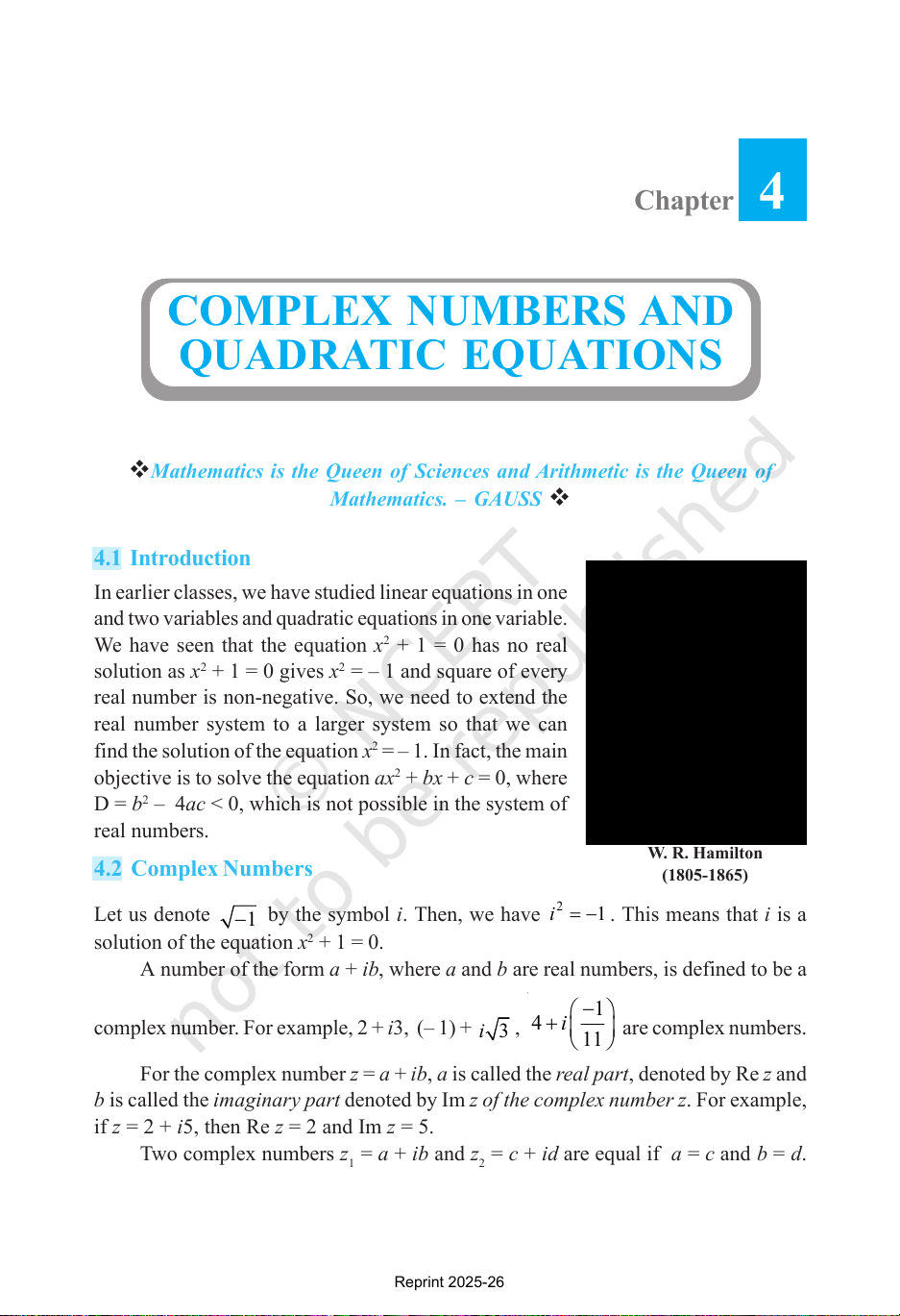 76 MATHEMATICS Chapter COMPLEX NUMBERS AND QUADRATIC EQUATIONS W. R. Hamilton (1805-1865) vMathematics is the Queen of Sciences and Arithmetic is the Queen of Mathematics. – GAUSS v 4.1 Introduction In earlier classes, we have studied linear equations in one and two variables and quadratic equations in one variable. We have seen that the equation x2 + 1 = 0 has no real solution as x2 + 1 = 0 gives x2 = – 1 and square of every real number is non-negative. So, we need to extend the real number system to a larger system so that we can find the solution of the equation x2 = – 1. In fact, the main objective is to solve the equation ax2 + bx + c = 0, where D = b2 – 4ac 0, b 0. What if aEQUATIONS 81 Example 3 Express (5 – 3i)3 in the form a + ib. Solution We have, (5 – 3i)3 = 53 – 3 × 52 × (3i) + 3 × 5 (3i)2 – (3i)3 = 125 – 225i – 135 + 27i = – 10 – 198i. Example 4 Express ( )( )3 2 2 3 i− + − − in the form of a + ib Solution We have, ( ) ( )3 2 2 3 i− + − − = ( ) ( )3 2 2 3i i− + − = 26 3 2 6 2i i i− + + − = ( ) ( )6 2 3 1 2 2 i− + + + 4.4 The Modulus and the Conjugate of a Complex Number Let z = a + ib be a complex number. Then, the modulus of z, denoted by | z |, is defined to be the non-negative real number 2 2a b+ , i.e., | z | = 2 2 a b+ and the conjugate of z, denoted as z , is the complex number a – ib, i.e., z = a – ib. For example, 2 2 3 3 1 10i+ = + = , 2 2 2 5 2 ( 5) 29i− = + − = , and 3 3i i+ = − , 2 5 2 5i i− = + , 3 5i− − = 3i – 5 Observe that the multiplicative inverse of the non-zero complex number z is given by z–1 = 1 a ib+ = 2 2 2 2 a b i a b a b − + + + = 2 2 a ib a b − + = 2 z z or z 2 z z= Furthermore, the following results can easily be derived. For any two compex numbers z 1 and z 2 , we have (i) 1 2 1 2z z z z= (ii) 11 2 2 zz z z = provided 2 0z ≠ (iii) 1 2 1 2z z z z= (iv) 1 2 1 2z z z z± = ± (v) 1 1 2 2 z z z z = provided z 2 ≠ 0. Reprint 2025-26 82 MATHEMATICS Example 5 Find the multiplicative inverse of 2 – 3i. Solution Let z = 2 – 3i Then z = 2 + 3i and 2 2 2 2 ( 3) 13z = + − = Therefore, the multiplicative inverse of 2 3i− is given by z–1 2 2 3 2 3 13 13 13 z i i z + = = = + The above working can be reproduced in the following manner also, z–1 = 1 2 3 2 3 (2 3 )(2 3 ) i i i i + = − − + = 2 2 2 3 2 3 2 3 13 13 132 (3 ) i i i i + + = = + − Example 6 Express the following in the form a + ib (i) 5 2 1 2 i i + − (ii) i–35 Solution (i) We have, 5 2 5 2 1 2 1 2 1 2 1 2 i i i i i i + + + = × − − + ( )2 5 5 2 2 2 1 2 i i i + + − = − = 3 6 2 3(1 2 2 ) 1 2 3 i i+ + = + = 1 2 2i+ . (ii) ( ) 35 35 17 2 1 1 1 i i i ii i i − = = = × − = 2 i i i = − EXERCISE 4.1 Express each of the complex number given in the Exercises 1 to 10 in the form a + ib. 1. ( ) 3 5 5 i i − 2. i i 9 19+ 3. i −39 Reprint 2025-26 COMPLEX NUMBERS AND QUADRATIC EQUATIONS 83 Fig 4.1 4. 3(7 + i7) + i (7 + i7) 5. (1 – i) – ( –1 + i6) 6. 1 2 5 4 5 5 2 i i + − + 7. 1 7 1 4 4 3 3 3 3 i i i + + + − − + 8. (1 – i)4 9. 3 1 3 3 i + 10. 3 1 2 3 i − − Find the multiplicative inverse of each of the complex numbers given in the Exercises 11 to 13. 11. 4 – 3i 12. 5 3i+ 13. – i 14. Express the following expression in the form of a + ib : ( ) ( ) ( ) ( ) 3 5 3 5 3 2 3 2 i i i i + − + − − 4.5 Argand Plane and Polar Representation We already know that corresponding to each ordered pair of real numbers (x, y), we get a unique point in the XY- plane and vice-versa with reference to a set of mutually perpendicular lines known as the x-axis and the y-axis. The complex number x + iy which corresponds to the ordered pair (x, y) can be represented geometrically as the unique point P(x, y) in the XY-plane and vice-versa. Some complex numbers such as 2 + 4i, – 2 + 3i, 0 + 1i, 2 + 0i, – 5 –2i and 1 – 2i which correspond to the ordered pairs (2, 4), ( – 2, 3), (0, 1), (2, 0), ( –5, –2), and (1, – 2), respectively, have been represented geometrically by the points A, B, C, D, E, and F, respectively in the Fig 4.1. The plane having a complex number assigned to each of its point is called the complex plane or the Argand plane. Reprint 2025-26 84 MATHEMATICS Obviously, in the Argand plane, the modulus of the complex number x + iy = 2 2x y+ is the distance between the point P(x, y) and the origin O (0, 0) (Fig 4.2). The points on the x-axis corresponds to the complex numbers of the form a + i 0 and the points on the y-axis corresponds to the complex numbers of the form Fig 4.2 Fig 4.3 0 + i b. The x-axis and y-axis in the Argand plane are called, respectively, the real axis and the imaginary axis. The representation of a complex number z = x + iy and its conjugate z = x – iy in the Argand plane are, respectively, the points P (x, y) and Q (x, – y). Geometrically, the point (x, – y) is the mirror image of the point (x, y) on the real axis (Fig 4.3). Reprint 2025-26 COMPLEX NUMBERS AND QUADRATIC EQUATIONS 85 Miscellaneous Examples Example 7 Find the conjugate of (3 2 )(2 3 ) (1 2 )(2 ) i i i i − + + − . Solution We have , (3 2 )(2 3 ) (1 2 )(2 ) i i i i − + + − = 6 9 4 6 2 4 2 i i i i + − + − + + = 12 5 4 3 4 3 4 3 i i i i + − × + − = 48 36 20 15 63 16 16 9 25 i i i− + + − = + = 63 16 25 25 i− Therefore, conjugate of (3 2 )(2 3 ) 63 16 is (1 2 )(2 ) 25 25 i i i i i − + + + − . Example 8 If x + iy = a ib a ib + − , prove that x2 + y2 = 1. Solution We have, x + iy = ( ) ( ) ( ) ( ) a ib a ib a ib a ib + + − + = 2 2 2 2 2a b abi a b − + + = 2 2 2 2 2 2 2a b ab i a b a b − + + + So that, x – iy = 2 2 2 2 2 2 2a b ab i a b a b − − + + Therefore, x2 + y2 = (x + iy) (x – iy) = 2 2 2 2 2 2 2 2 2 2 2 ( ) 4 ( ) ( ) a b a b a b a b − + + + = 2 2 2 2 2 2 ( ) ( ) a b a b + + = 1 Miscellaneous Exercise on Chapter 4 1. Evaluate: 3 25 18 1 i i + . 2. For any two complex numbers z 1 and z 2 , prove that Re (z 1 z 2 ) = Re z 1 Re z 2 – Imz 1 Imz 2 