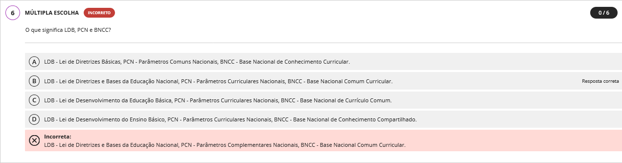 6 ESCOLHA INCORRETO que significa LDB, PCN e BNCC? A LDB Lei de Diretrizes PCN Comuns Nacionais, BNCC Base Nacional de Conhecimento Curricular. B LDB Lei de Diretrizes e Bases da Educação Nacional, PCN - Curriculares Nacionais, BNCC Base Nacional Comum Curricular. Resposta correta C LDB Lei de Desenvolvimento da Educação PCN Parametros Curriculares Nacionais, BNCC Base Nacional de Comum. D LDB Lei de Desenvolvimento do Ensino PCN Parametros Curriculares Nacionais, BNCC Base Nacional de Conhecimento Compartilhado. Incorreta: X LDB Lei de Diretrizes e Bases da Educação Nacional, PCN Parametros Complementares Nacionais, BNCC Base Nacional Comum Curricular.