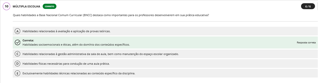 10 MULTIPLA ESCOLHA CORRETO 6/6 Quais habilidades a Base Nacional Comum Curricular (BNCC) destaca como importantes para 05 professores desenvolverem em sua prática educativa? A Habilidades relacionadas à avaliação e aplicação de provas Correta: Resposta correta Habilidades socioemocionais e éticas, além do dos conteúdos C Habilidades relacionadas à gestão administrativa da sala de aula, bem como manutenção do espaço escolar organizado. D Habilidades fisicas necessárias para condução de uma aula E Exclusivamente habilidades relacionadas ao conteúdo específico da disciplina.