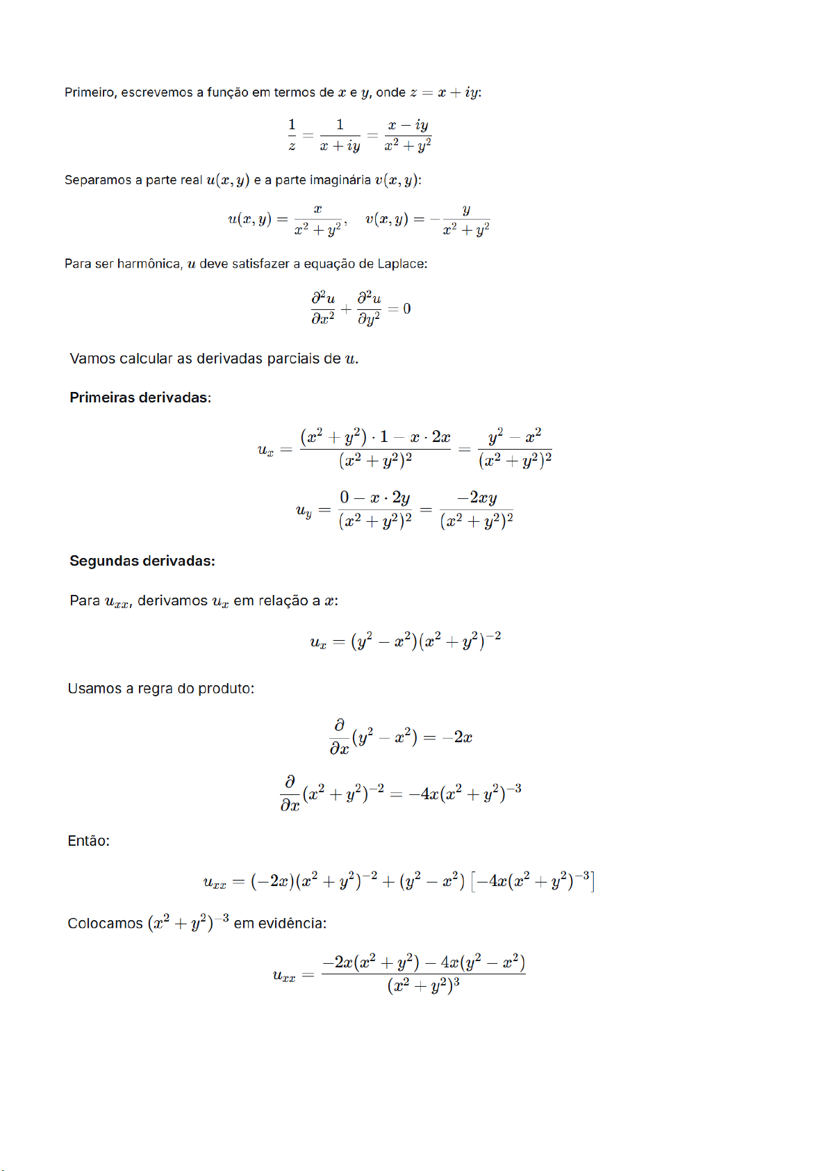 Como a soma é zero, a função 𝑢(𝑥, 𝑦) satisfaz a equação de Laplace, então é harmônica. Logo, 𝑓(𝑧) = 1 𝑧 é harmônica em seu domínio. Resposta final Sim, a função é harmônica.