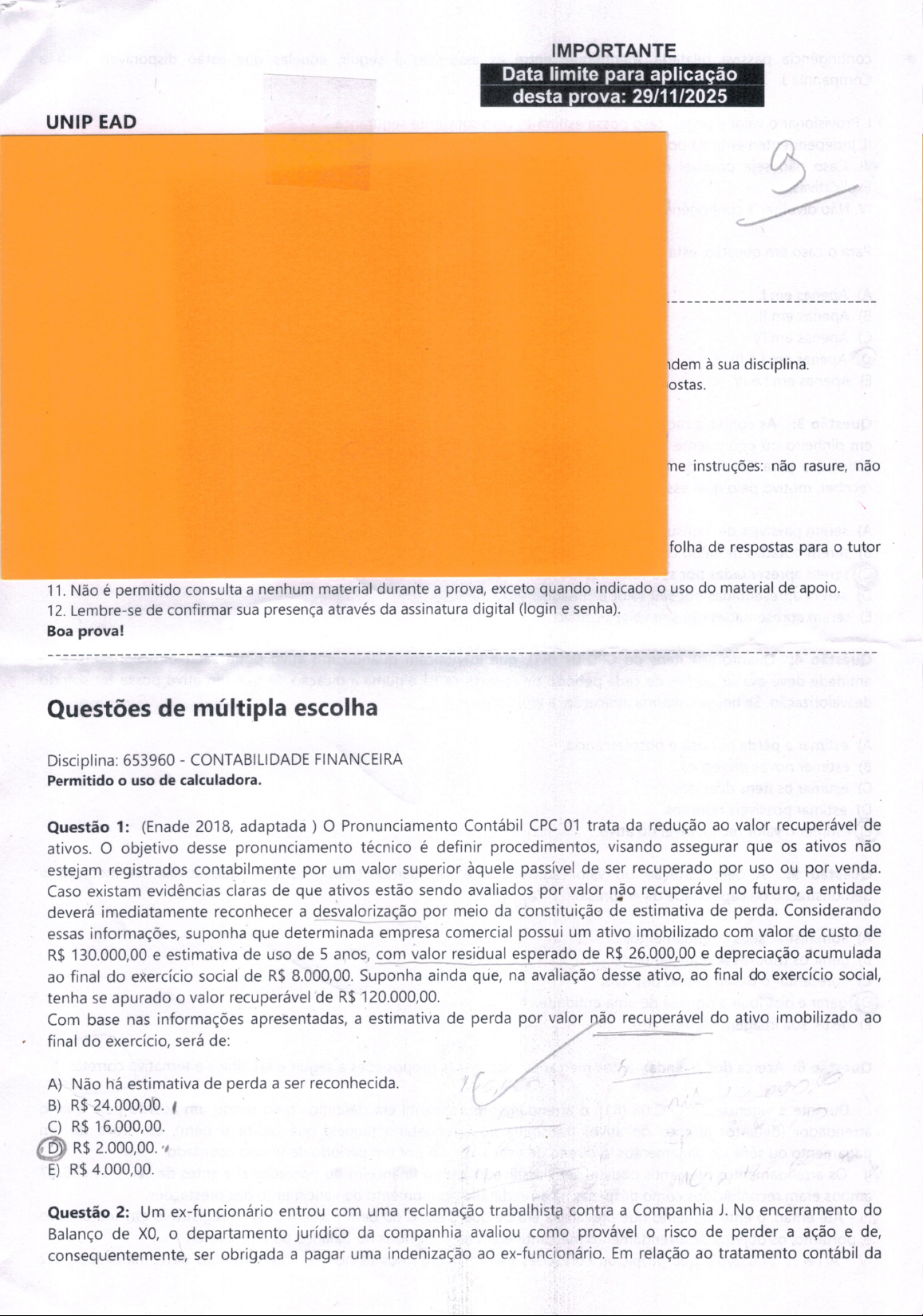 IMPORTANTE Data limite para aplicação desta prova: 29/11/2025 UNIP EAD à sua disciplina. ostas. me instruções: não rasure, não folha de respostas para tutor 11. Não é permitido consulta a nenhum material durante a prova, exceto quando indicado uso do material de apoio. 12. Lembre-se de confirmar sua presença através da assinatura digital (login e senha). Boa prova! Questões de múltipla escolha Disciplina: 653960 CONTABILIDADE FINANCEIRA Permitido o uso de calculadora. Questão 1: (Enade 2018, adaptada ) O Pronunciamento Contábil CPC 01 trata da redução ao valor recuperável de ativos. O objetivo desse pronunciamento técnico é definir procedimentos, visando assegurar que os ativos não estejam registrados contabilmente por um valor superior àquele passível de ser recuperado por uso ou por venda. Caso existam evidências claras de que ativos estão sendo avaliados por valor não recuperável no futuro, a entidade deverá imediatamente reconhecer a desvalorização por meio da constituição de estimativa de perda. Considerando essas informações, suponha que determinada empresa comercial possui um ativo imobilizado com valor de custo de R$ 130.000,00 e estimativa de uso de 5 anos, com valor residual esperado de R$ 26.000,00 e depreciação acumulada ao final do exercício social de R$ 8.000,00. Suponha ainda que, na avaliação desse ativo, ao final do exercício social, tenha se apurado valor recuperável de R$ 120.000,00. Com base nas informações apresentadas, a estimativa de perda por valor não recuperável do ativo imobilizado ao final do exercício, será de: A) Não há estimativa de perda a ser reconhecida. B) R$ 24.000,00. C) R$ 16.000,00. D R$ 2.000,00. E) R$ 4.000,00. Questão 2: Um ex-funcionário entrou com uma reclamação trabalhista contra a Companhia J. No encerramento do Balanço de departamento jurídico da companhia avaliou como provável risco de perder a ação e de, consequentemente, ser obrigada a pagar uma indenização ao ex-funcionário. Em relação ao tratamento contábil dacontingência passiva relatada, identifique, entre as assertivas a seguir, aquelas que estão disponíveis para a Companhia J. I. Provisionar valor a pagar, caso possa estimá-lo com suficiente segurança. Independentemente da possibilidade de mensuração confiável, apenas divulgar fato em Notas Explicativas. Caso não seja possível estimar valor a pagar com suficiente segurança, deverá divulgar fato em Notas Explicativas. IV. Não divulgar a contingência em Notas Explicativas. Para o caso em questão, está correto que se afirma: A) Apenas em I. B) Apenas em II. C) Apenas em IV. D Apenas em I e III. E) Apenas em I e IV. Questão 3: As contas a receber devem ser avaliadas por seu valor líquido de realização, ou seja, pelo produto final em dinheiro ou equivalente que se espera obter. Para tanto, devem-se baixar as contas prescritas e constituir uma Estimativa para Crédito de Liquidação Duvidosa para cobertura das perdas esperadas na cobrança das contas a receber, motivo pelo qual essa estimativa é classificada como redução das contas a receber, para: A) serem passíveis de mensuração. B) serem dotadas de saldo credor. C) serem apresentadas por seu valor líquido realizável. D) serem apresentadas por seu valor estimado. E) serem apresentadas por seu valor positivo. Questão 4: Quanto aos itens do CPC 01 (R1), que identificam quando um ativo pode estar desvalorizado: 9. A entidade deve avaliar ao fim de cada período de reporte se há alguma indicação de que um ativo possa ter sofrido desvalorização. Se houver alguma indicação, a entidade deve: A) estimar a perda por uso e obsolescência. B) estimar novas projeções. C) estimar os itens diferidos. D) estimar possíveis retornos. E) estimar valor recuperável do ativo. Questão 5: A demonstração do valor adicionado é um demonstrativo contábil que auxilia na medição e demonstração da capacidade da empresa: DVA A) administrar seus arrendamentos. B) gerar os tributos adequadamente. C) apresentar desempenho positivo. D gerar e distribuir a riqueza de uma entidade. E) testar sua imagem no mercado. Questão 6: Acerca dos arrendamentos mercantis, observe as proposições a seguir e escolha a alternativa correta: Durante a vigência do CPC 06 (R1), arrendamento mercantil era definido como sendo um acordo pelo qual arrendador (detentor jurídico do ativo) transmitia ao arrendatário (aquele que utiliza bem), em troca de um pagamento ou série de pagamentos, direito de usar um ativo por um período de tempo acordado. Os arrendamentos mercantis podiam ser classificados como financeiro ou operacional e antes da Lei n. 11.638/07 ambos eram reconhecidos como despesas na arrendatária no momento de vencimento das prestações. Até então, entendimento que prevalecia era de que dono do bem é quem deveria registrá-lo em seu passivo e, portanto, os objetos de arrendamento mercantil eram reconhecidos no balanço do arrendador. IV A Lei n. 11.638/07, que propiciou condições para convergirmos às normas internacionais de contabilidade, fezpermanecer tratamento operacional dos arrendamentos mercantis financeiros. V Como as normas internacionais baseiam-se na premissa de que a essência da transação deve prevalecer sobre a forma como tal transação foi contratada, objeto do contrato de arrendamento mercantil financeiro, que transferia à companhia os benefícios, riscos e controle de seu uso, passou a ser reconhecido como ativo e as prestações a serem pagas, como passivo. A) A proposição III é verdadeira. B) A proposição I é falsa. As proposições III e IV são falsas. D) A proposição II é falsa. E) A proposição V é falsa. Questão 7: (Exame de Suficiência 2019/2, adaptada ) A sociedade Empresária elaborou, em 31/12/2018, a sua Demonstração de Resultado do Exercício, conforme apresentado e, como determina a legislação societária, é obrigada a elaborar e divulgar a Demonstração d