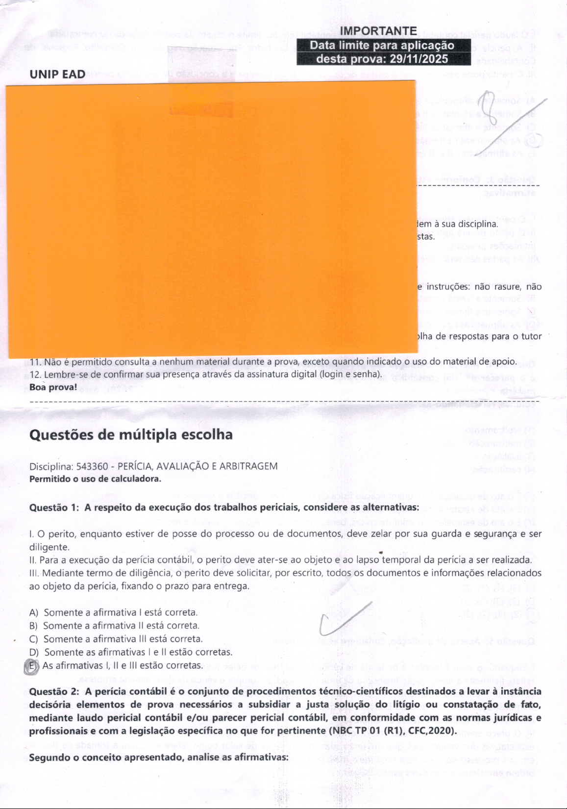 IMPORTANTE Data limite para aplicação desta prova: 29/11/2025 UNIP EAD dem à sua disciplina. stas. e instruções: não rasure, não de respostas para o tutor 11. Não é permitido consulta a nenhum material durante a prova, exceto quando indicado uso do material de apoio. 12. Lembre-se de confirmar sua presença através da assinatura digital (login e senha). Boa prova! Questões de múltipla escolha Disciplina: 543360 PERÍCIA, AVALIAÇÃO E ARBITRAGEM Permitido o uso de calculadora. Questão 1: A respeito da execução dos trabalhos periciais, considere as alternativas: I. O perito, enquanto estiver de posse do processo ou de documentos, deve zelar por sua guarda e segurança e ser diligente. II. Para a execução da perícia contábil, perito deve ater-se ao objeto e ao lapso temporal da perícia a ser realizada. III. Mediante termo de diligência, perito deve solicitar, por escrito, todos os documentos e informações relacionados ao objeto da perícia, fixando prazo para entrega. A) Somente a afirmativa I está correta. B) Somente a afirmativa II está correta. C) Somente a afirmativa III está correta. D) Somente as afirmativas I e II estão corretas. E) As afirmativas I, II e III estão corretas. Questão 2: A perícia contábil é o conjunto de procedimentos técnico-científicos destinados a levar à instância decisória elementos de prova necessários a subsidiar a justa solução do litígio ou constatação de fato, mediante laudo pericial contábil e/ou parecer pericial contábil, em conformidade com as normas jurídicas e profissionais e com a legislação específica no que for pertinente (NBC TP 01 (R1), CFC,2020). Segundo conceito apresentado, analise as afirmativas:I. O laudo pericial contábil e parecer pericial contábil têm por limite objeto da perícia deferida ou contratada. II. A perícia contábil é de competência exclusiva de contador em situação regular em Conselho Regional de Contabilidade. III. O perito pode desconsiderar a análise de documentos ou fatos para a conclusão de seu laudo pericial. A) Somente a afirmativa I está correta. B) Somente a afirmativa II está correta. C) Somente a afirmativa IIII está correta. D As afirmativas e II estão corretas. E) As afirmativas I, II e III estão corretas. Questão 3: Conforme estabelecido pelo Código de Processo Civil, no tocante à nomeação do perito analise as afirmativas: I. O perito deverá apresentar a proposta de honorários após nomeado. II. O perito deverá apresentar contatos profissionais, em especial endereço eletrônico, para onde serão dirigidas as intimações pessoais. As partes não terão direito a discutir os valores de honorários propostos pelo perito. A) Somente a está correta. B) Somente a II está correta. C) Somente a III está correta. D As afirmativas I e II estão corretas. E) As afirmativas I, e III estão corretas. Questão 4: Acerca da definição dos procedimentos periciais que visam fundamentar laudo pericial contábil e parecer pericial contábil e abrangem, total ou parcialmente, segundo a natureza e a complexidade da matéria contidos nas Normas Brasileiras de Contabilidade (NBC TP 01 (R1), CFC, 2020), associe as duas colunas, relacionando-as. (1) arbitramento (2) mensuração (3) avaliação (4) certificação (2) É ato de qualificação e quantificação física de coisas, bens, direitos e obrigações; (4) É ato de atestar a informação obtida na formação da prova pericial; (/) É ato de estabelecer valor de coisas, bens, direitos, obrigações, despesas e receitas; (3) É a determinação de valores, quantidades ou a solução de controvérsia por critério técnico-científico; A) (4); (1); (3); (2). B) (2); (4); (3); (1). C) (3); (4); (1); (2). D) (2); (3); (1); (2). (2); (4); (1); (3). Questão 5: Acerca da avaliação, considere as afirmativas. I. Enquanto valor é relativo e depende de vários fatores, muitos deles subjetivos, preço é único, exato e preciso e reflete fielmente a mensuração financeira de uma transação de compra e venda de determinada empresa. II. Em um primeiro momento, valor de uma empresa pode ser determinado exclusivamente a partir da Demonstração do Resultado do Exercício porque sua finalidade é informar lucro que os proprietários auferem no desenvolvimento das atividades da empresa. III. O preço apenas será definido como conclusão do processo de negociação entre desejo dos compradores e as expectativas dos vendedores, que utilizarão suas mensurações de valor como referencial para a tomada de decisão, em um processo no qual, sem uma ideia mais coerente desse valor da empresa, passam a preponderar fatores de ordem emocional e interesses especulativos.A) Somente a afirmativa I está correta. B) Somente a afirmativa II está correta. C) Somente a afirmativa III está correta. D Somente as afirmativas I e III estão corretas. E) As afirmativas I, e III estão corretas. Questão 6: Considerando que os impedimentos profissionais são situações fáticas ou circunstâncias que impossibilitam perito de exercer a atividade pericial. Acerca dessa questão, analise as afirmativas. I. Caso perito não possa exercer suas atividades com isenção, é fator determinante que ele se declare impedido, após nomeado ou indicado, quando ocorrerem as situações previstas nesta Norma. II. Quando nomeado, perito deve dirigir petição, no prazo legal, justificando a escusa ou motivo do impedimento. III. Quando indicado nos autos pela parte e não aceitando encargo, assistente técnico deve comunicar a ela sua recusa, devidamente justificada por escrito, facultado envio de cópia à autoridade competente. A) Somente a afirmativa está correta. B) Somente a afirmativa está correta. C) Somente a afirmativa IIII está correta. D Somente as afirmativas I e II estão corretas. E) As afirmativas I, e III estão corretas. Questão 7: A respeito da função do árbitro, assinale com V (verdadeiro) ou F (falso) os enunciados a seguir.