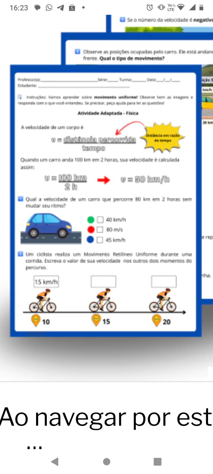 16:23 S LTE Se 0 número da velocidade é negative Observe as posições ocupadas pelo Ele está Qual 0 tipo de movimento? 3 aprender movimento Observe as com que Se peça para as Adaptada Física A velocidade de um corpo é distância percorrida tempo Quando um carro anda 100 km em 2 sua velocidade calculada assim: = 100 km = 50 km/h 2 Qual a velocidade de um carro que percorre 80 km em 2 horas sem mudar seu ritmo? 40 km/h 80 m/s 45 km/h e rep Um realiza um Movimento Retilineo Uniforme durante uma corrida. Escreva 0 valor de sua velocidade nos outros dois momentos do 15 km/h 10 15 20 Ao navegar por est