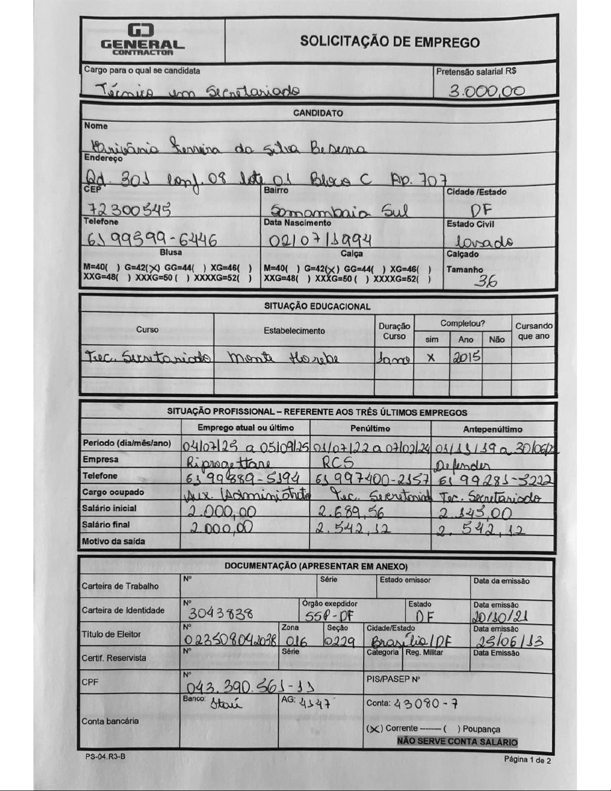 GENERAL SOLICITAÇÃO DE EMPREGO CONTRACTOR Cargo para qual se candidata Pretensão salarial R$ em Secretariado 3.000,00 CANDIDATO Nome do Endereço CEP 301 08 lote Bairro 01 C Ap. 707 Cidade /Estado 72300545 Sul DF Telefone Data Nascimento Estado Civil 02/07/1994 Blusa Calça Calçado M=40( ) G=42(X) GG=44( ) XG=46( ) M=40( ) G=42( GG=44( ) XG=46( Tamanho XXG=48( ) XXXG=50 XXXXG=52( ) XXG=48( ) XXXG=50 ( ) XXXXG=52( ) 36 SITUAÇÃO EDUCACIONAL Estabelecimento Duração Completou? Curso Cursando Curso sim Ano Não que ano Tec. monte Horebe 2015 SITUAÇÃO PROFISSIONAL REFERENTE AOS TRÊS ÚLTIMOS EMPREGOS Emprego atual ou último Penúltimo Antepenúltimo Período (dia/mês/ano) 04/07/25 a 05/09/25 Empresa Riprogettare RCS Defender Telefone Cargo ocupado Aux. Tec. Salário inicial 2.000,00 2.689,56 Salário final 2.000,00 2.542,12 Motivo da saída DOCUMENTAÇÃO (APRESENTAR EM ANEXO) N° Série Estado emissor Data da emissão Carteira de Trabalho N° Órgão exepdidor Estado Data emissão Carteira de Identidade 3043838 DF 20/10/21 Zona Seção Cidade/Estado Data emissão de Eleitor 023508042038 016 0229 N° Série Categoria Reg. Militar Data Emissão Certif. Reservista CPF PIS/PASEP N° Banco: AG: 4347 Conta: 43080-7 Conta bancária Corrente ( ) Poupança NÃO SERVE CONTA SALÁRIO PS-04.R3-B Página 1 de 2BENEFICIÁRIOS E DEPENDENTES Data de Nome Grau de parentesco nascimento CPF Bernando filho 18/08/23 Data e Assinatura do candidato: 13/13/2025 Sil A ser preenchido somente pelo Recursos Humanos Título do cargo Setor Data de admissão Salário inicial R$ Salário após experiência R$ Horário de trabalho Descanso semanal Avaliação do Candidato Item avaliado Avaliação Observações (verificar quadro de competência) Escolaridade (instrução) Experiência profissional Habilidades Antecedentes criminais Título do cargo Setor Data de admissão Salário inicial R$ Salário após experiência R$ Horário de trabalho Descanso semanal Observações: Assinatura do Responsável pela Seleção / data Assinatura Aprovação da Contratação/Data PS-04.R3-B Página 2 de 2