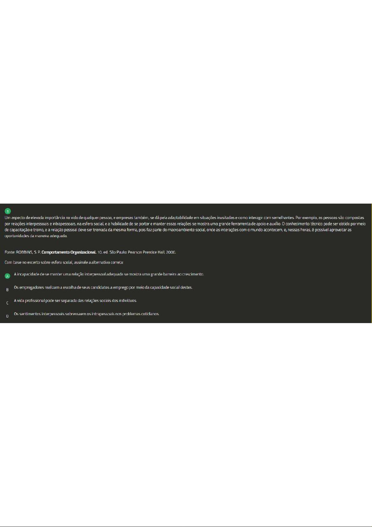 1 Um aspecto de elevada importância na vida de qualquer pessoa, e empresas também, se dá pela adaptabilidade em situações inusitadas e como interagir com Por exemplo, as pessoas são compostas por relações interpessoais e intrapessoais, na esfera social, e a habilidade de se portar e manter essas relações se mostra uma grande ferramenta de apoio e auxilio. 0 conhecimento técnico pode ser obtido por meio de capacitação e treino, e a relação pessoal deve ser treinada da mesma forma, pois faz parte do macroambiente social, onde as interações com 0 mundo acontecem, e, nessas horas, é possível aproveitar as oportunidades da maneira adequada. Fonte: ROBBINS, S. P. Comportamento Organizacional. 10. ed. Paulo: Pearson Prentice Hall, 2000. Com base no excerto sobre esfera social, assinale a alternativa correta: A A incapacidade de se manter uma relação interpessoal adequada se mostra uma grande barreira ao crescimento. B Os empregadores realizam a escolha de seus candidatos a emprego por meio da capacidade social destes. C A vida profissional pode ser separada das relações sociais dos indivíduos. D Os sentimentos interpessoais sobressaem intrapessoais nos problemas cotidianos.