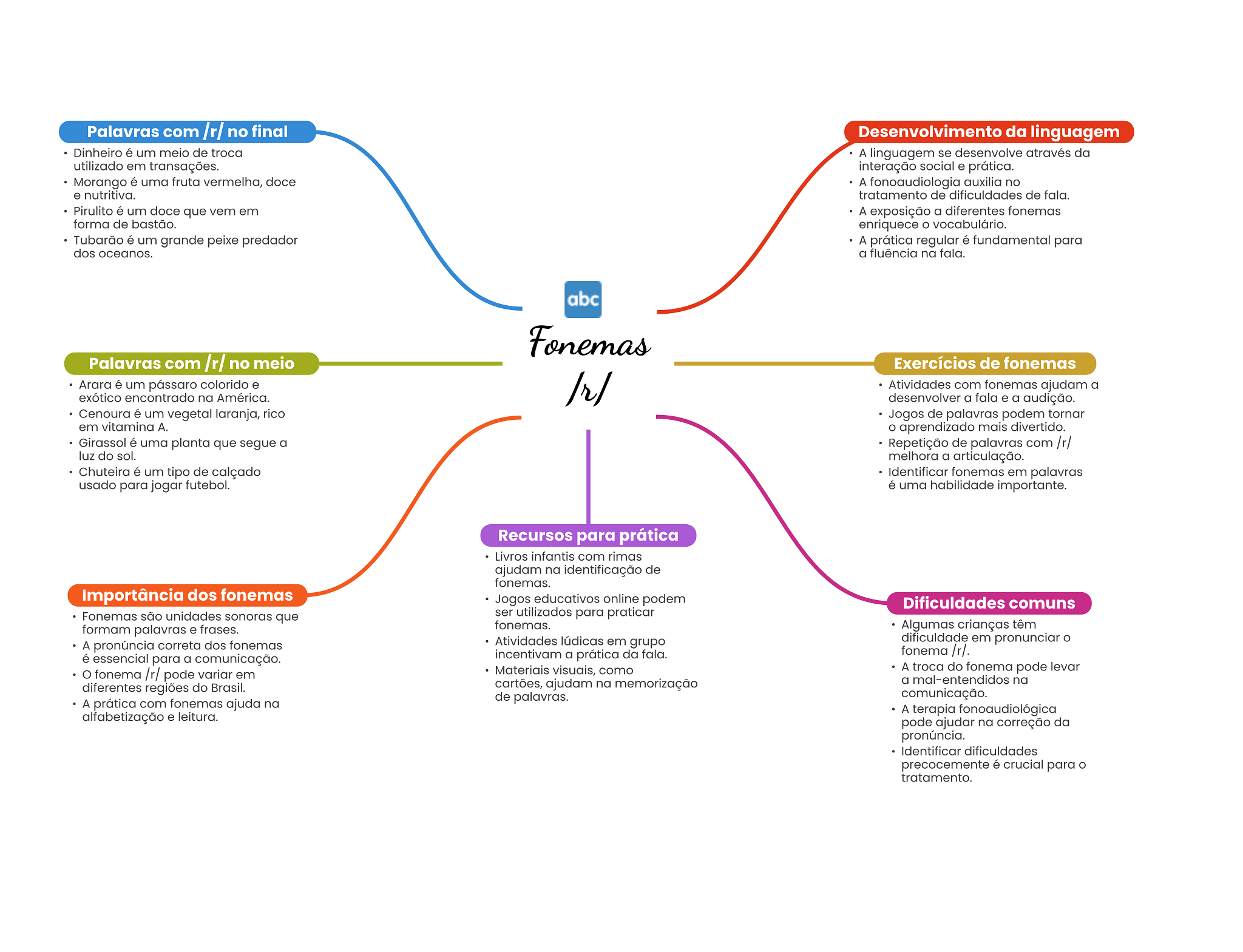 Palavras com /r/ no final Desenvolvimento da linguagem Dinheiro é um meio de troca A linguagem se desenvolve através da utilizado em transações. interação social e prática. Morango é uma fruta vermelha, doce A fonoaudiologia auxilia no e nutritiva. tratamento de dificuldades de fala. Pirulito é um doce que vem em A exposição a diferentes fonemas forma de bastão. enriquece vocabulário. Tubarão é um grande peixe predador A prática regular é fundamental para dos oceanos. a fluência na fala. abc Fonemas Palavras com /r/ no meio Exercícios de fonemas Arara é um pássaro colorido e exótico encontrado na América. /r/ Atividades com fonemas ajudam a desenvolver a fala e a audição. Cenoura é um vegetal laranja, rico Jogos de palavras podem tornar em vitamina aprendizado mais divertido. Girassol é uma planta que segue a Repetição de palavras com /r/ luz do sol. melhora a articulação. Chuteira é um tipo de calçado Identificar fonemas em palavras usado para jogar futebol. é uma habilidade importante. Recursos para prática Livros infantis com rimas ajudam na identificação de fonemas. Importância dos fonemas Jogos educativos online podem Dificuldades comuns Fonemas são unidades sonoras que ser utilizados para praticar formam palavras e frases. fonemas. Algumas crianças têm A pronúncia correta dos fonemas Atividades lúdicas em grupo dificuldade em pronunciar é essencial para a comunicação. incentivam a prática da fala. fonema /r/. fonema /r/ pode variar em Materiais visuais, como A troca do fonema pode levar cartões, ajudam na memorização a mal-entendidos na diferentes regiões do Brasil. de palavras. comunicação. A prática com fonemas ajuda na A terapia fonoaudiológica alfabetização e leitura. pode ajudar na correção da pronúncia. Identificar dificuldades precocemente é crucial para tratamento.