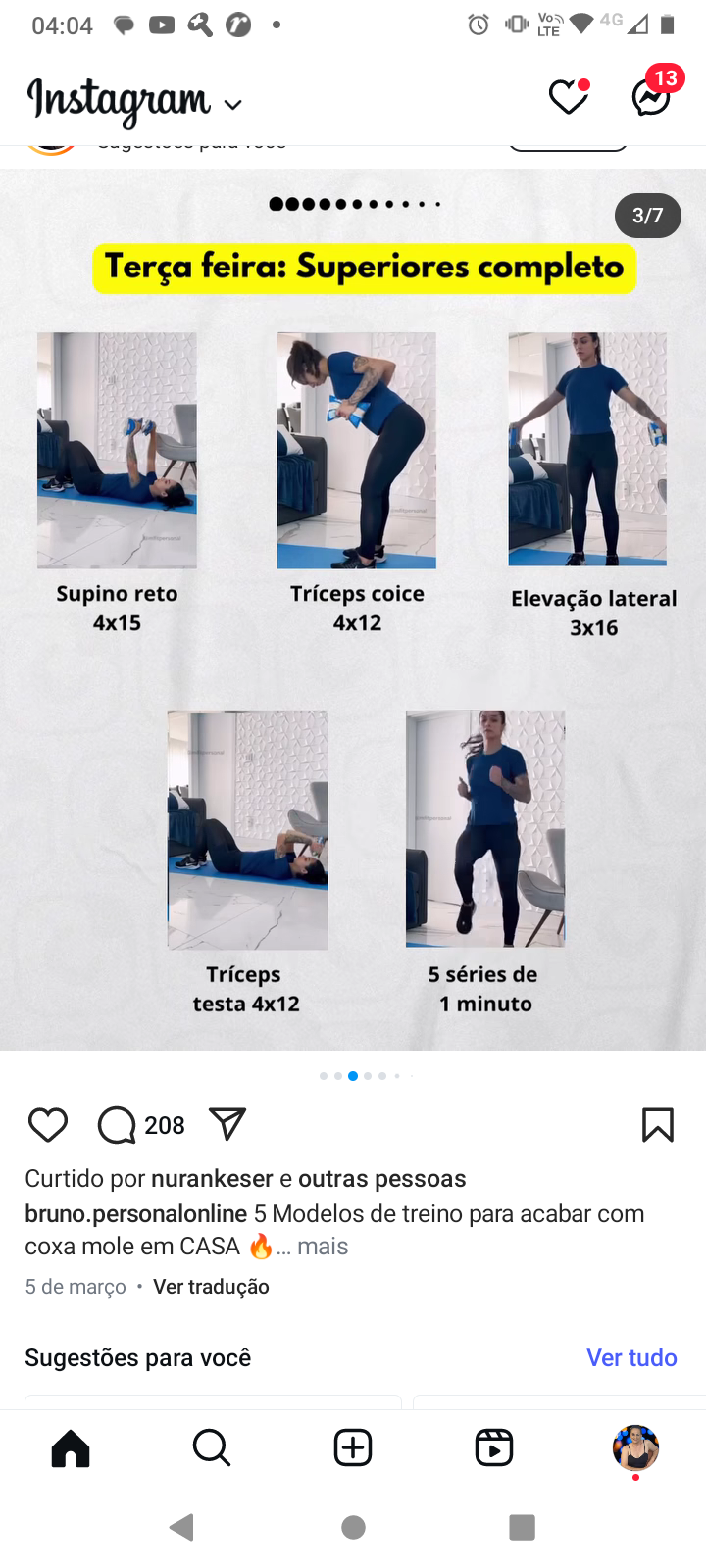 04:04 4G LTE 13 Instagram 3/7 Terça feira: Superiores completo Supino reto Tríceps coice Elevação lateral 4x15 4x12 3x16 Tríceps 5 séries de testa 4x12 1 minuto 208 Curtido por nurankeser e outras pessoas bruno.personalonline 5 Modelos de treino para acabar com coxa mole em CASA mais 5 de março Ver tradução Sugestões para você Ver tudo +