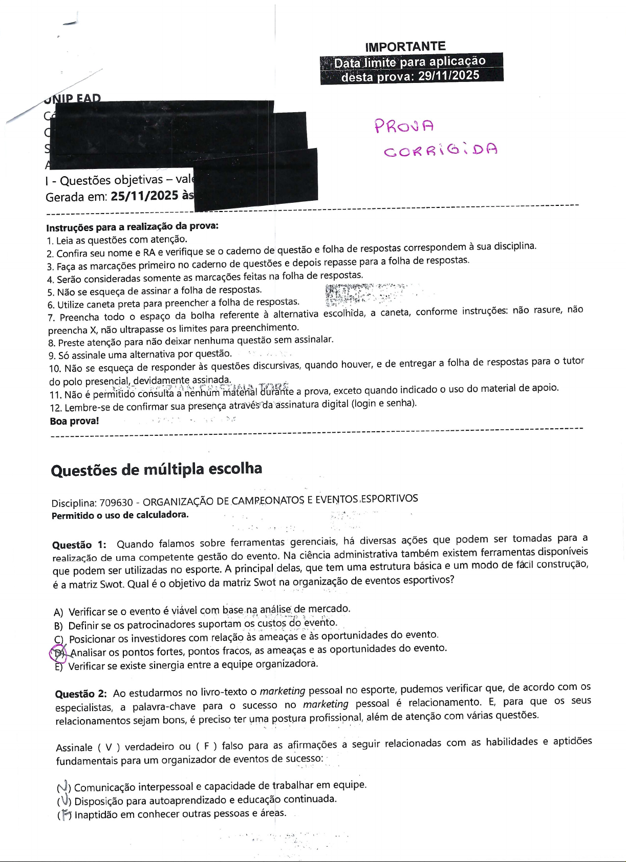 IMPORTANTE Data limite para aplicação desta prova: 29/11/2025 EAD Cá PROVA S A I - Questões objetivas Gerada em: 25/11/2025 às Instruções para a realização da prova: 1. Leia as questões com atenção. 2. Confira seu nome e RA e verifique se caderno de questão e folha de respostas correspondem à sua disciplina. 3. Faça as marcações primeiro no caderno de questões e depois repasse para a folha de respostas. 4. Serão consideradas somente as marcações feitas na folha de respostas. 5. Não se esqueça de assinar a folha de respostas. 6. Utilize caneta preta para preencher a folha de respostas. 7. Preencha todo espaço da bolha referente à alternativa escolhida, a caneta, conforme instruções: não rasure, não preencha X, não ultrapasse os limites para preenchimento. 8. Preste atenção para não deixar nenhuma questão sem assinalar. 9. Só assinale uma alternativa por questão. 10. Não se esqueça de responder às questões discursivas, quando houver, e de entregar a folha de respostas para o tutor do polo presencial, devidamente assinada. 11. Não é permitido consulta a nenhum material durante a prova, exceto quando indicado uso do material de apoio. 12. Lembre-se de confirmar sua presença através da assinatura digital (login e senha). Boa prova! Questões de múltipla escolha Disciplina: 709630 ORGANIZAÇÃO DE CAMPEONATOS E EVENTOS ESPORTIVOS Permitido o uso de calculadora. Questão 1: Quando falamos sobre ferramentas gerenciais, há diversas ações que podem ser tomadas para a realização de uma competente gestão do evento. Na ciência administrativa também existem ferramentas disponíveis que podem ser utilizadas no esporte. A principal delas, que tem uma estrutura básica e um modo de fácil construção, é a matriz Swot. Qual é o objetivo da matriz Swot na organização de eventos esportivos? A) Verificar se o evento é viável com base na análise de mercado. B) Definir se os patrocinadores suportam os custos do evento. C) Posicionar os investidores com relação às ameaças e às oportunidades do evento. D) Analisar os pontos fortes, pontos fracos, as ameaças e as oportunidades do evento. E) Verificar se existe sinergia entre a equipe organizadora. Questão 2: Ao estudarmos no livro-texto marketing pessoal no esporte, pudemos verificar que, de acordo com os especialistas, a palavra-chave para sucesso no marketing pessoal é relacionamento. E, para que os seus relacionamentos sejam bons, é preciso ter uma postura profissional, além de atenção com várias questões. Assinale verdadeiro ou (F) falso para as afirmações a seguir relacionadas com as habilidades e aptidões fundamentais para um organizador de eventos de sucesso: Comunicação interpessoal e capacidade de trabalhar em equipe. (V) Disposição para autoaprendizado e educação continuada. Inaptidão em conhecer outras pessoas e áreas.(F) Domínio de linguagens de programação. Habilidade de identificar e resolver problemas. A) V,V,F,F,V. D) Questão 3: Vimos que um projeto é formado por alguns itens. Ele deverá indicar as principais bases de sustentação da ideia que se pretende realizar/vender. Utilizando os conhecimentos adquiridos assinale (V) verdadeiro ou (F) falso para as afirmações a seguir. Beneficiários Os beneficiários podem ser diretos (os alunos, no caso) ou indiretos (os familiares). F) Metodologia Para a organização de eventos, a metodologia empreende as ações que serão desencadeadas antes (pré-evento), durante (evento) e após (pós-evento). O passo a passo (check-list) é um excelente recurso para a organização da equipe, distribuição das tarefas e funcionamento das comissões. ( A Estratégia A estratégia concentra o conjunto de técnicas e processos que caminham ao encontro dos objetivos, planejamento. das metas e da conceituação, seguindo os princípios da metodologia por ser o meio para cumprimento do () Anexos É um item opcional, o qual deve retratar fotos de eventos já realizados, dados estatísticos, resultados de pesquisa etc. Assinale a alternativa correta: A) V,F,F,V. B) Questão 4: Como rúgbi tornou-se queridinho dos patrocinadores no país do futebol? [...] O planejamento consistente e a boa gestão também fazem com que mais marcas se convertam ao esporte. Ao contrário de outras confederações nacionais, que têm enfrentado problemas na Justiça [...] a CBRu pode ser considerada um exemplo de gestão esportiva. A CBRu foi criada somente em 2010, apesar de esporte estar no Brasil desde fim do século 19. A entidade levou, em três anos seguidos (2015, 2016 e 2017), prêmio de Melhor Governança e Transparência em Entidades Esportivas do Brasil, promovido pela ONG Sou do Esporte. "Projetos a longo prazo, gestão profissional e um trabalho de proatividade fizeram o rúgbi ter essa afirmou pesquisador Neto. Acesso em: Tendo como base texto, analise as afirmações a seguir: Poit (2013) diz que, ao estudarmos administração, devemos tomar como referência as três variáveis básicas da Teoria Geral da Administração (TGA), ou seja, controlar os funcionários, cobrar e desenvolver novos produtos. A administração é a ciência que organiza as diversas atividades da vida. Por esse motivo ela é tão importante. Em todos os segmentos, a ação de um bom gestor se reverte em ganhos para a empresa. III Tal como em um time, é o trabalho em equipe que vai ter condições de proporcionar que evento seja memorável. Para isso, todos precisam estar engajados com a ideologia do evento, motivados com a perspectiva de sua realização e apaixonados por estarem presentes, tendo o claro sentimento de pertencimento IV Poit (2013), relaciona a Teoria Geral da Administração (TGA às atividades de organização de eventos esportivos, entre elas: atribuições das diversas comissões, cumprimentos dos objetivos e estrutura organizacional.Assinale a alternativa correta. A) Somente item I está correto. B) Somente os itens II e III estão corretos.