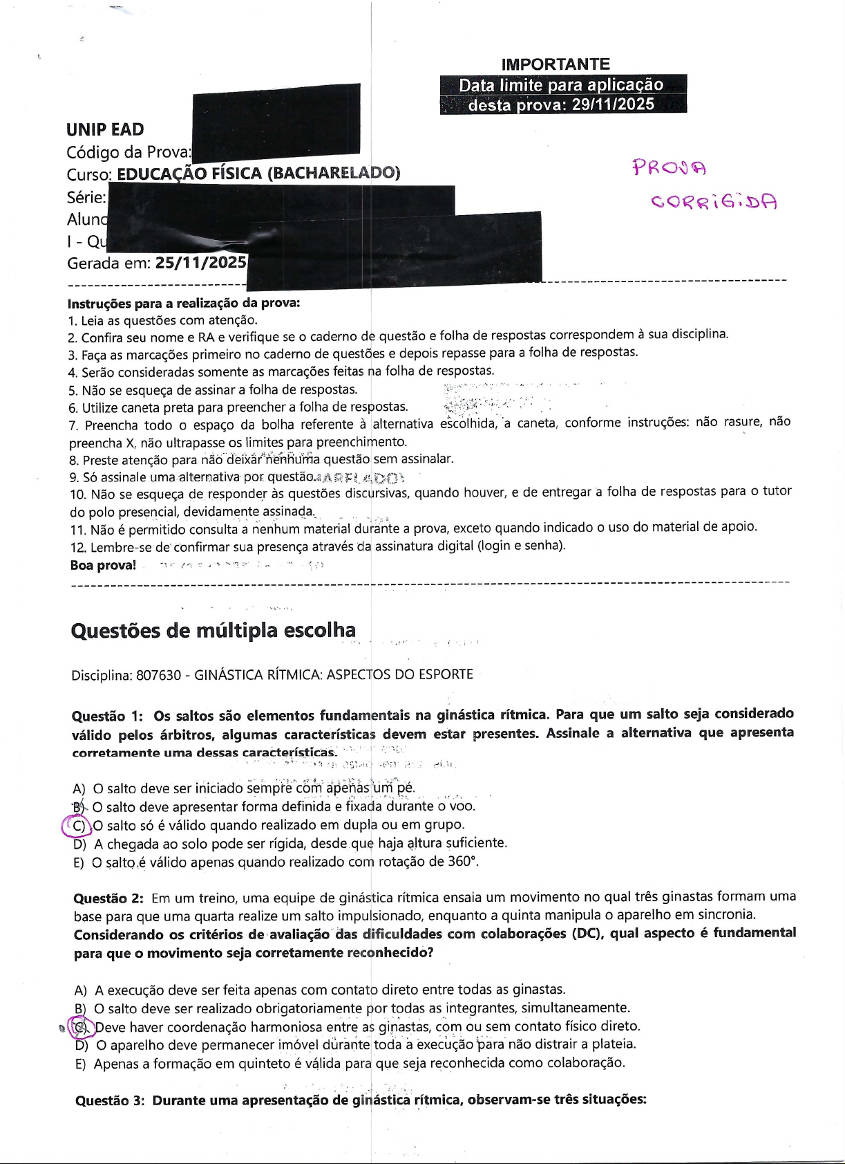 IMPORTANTE Data limite para aplicação desta prova: 29/11/2025 UNIP EAD Código da Prova: Curso: EDUCAÇÃO FÍSICA (BACHARELADO) PROJA Série: Alund Qu Gerada em: 25/11/2025 Instruções para a realização da prova: 1. Leia as questões com atenção. 2. Confira seu nome e RA e verifique se caderno de questão e folha de respostas correspondem à sua disciplina. 3. Faça as marcações primeiro no caderno de questões e depois repasse para a folha de respostas. 4. Serão consideradas somente as marcações feitas na folha de respostas. 5. Não se esqueça de assinar a folha de respostas. 6. Utilize caneta preta para preencher a folha de respostas. 7. Preencha todo espaço da bolha referente à alternativa escolhida, a caneta, conforme instruções: não rasure, não preencha X, não ultrapasse os limites para preenchimento. 8. Preste atenção para não nenhuma questão sem assinalar. 9. Só assinale uma alternativa por questão. DO 10. Não se esqueça de responder às questões discursivas, quando houver, e de entregar a folha de respostas para o tutor do polo presencial, devidamente assinada. 11. Não é permitido consulta a nenhum material durante a prova, exceto quando indicado o uso do material de apoio. 12. Lembre-se de confirmar sua presença através da assinatura digital (login e senha). Boa prova! Questões de múltipla escolha Disciplina: 807630 GINÁSTICA RÍTMICA: ASPECTOS DO ESPORTE Questão 1: Os saltos são elementos fundamentais na ginástica rítmica. Para que um salto seja considerado válido pelos árbitros, algumas características devem estar presentes. Assinale a alternativa que apresenta corretamente uma dessas características. A) O salto deve ser iniciado sempre com um pé. B) O salto deve apresentar forma definida e fixada durante o voo. C) O salto só é válido quando realizado em dupla ou em grupo. D) A chegada ao solo pode ser rígida, desde que haja altura suficiente. E) salto é válido apenas quando realizado com rotação de 360°. Questão 2: Em um treino, uma equipe de ginástica rítmica ensaia um movimento no qual três ginastas formam uma base para que uma quarta realize um salto impulsionado, enquanto a quinta manipula o aparelho em sincronia. Considerando os critérios de avaliação das dificuldades com colaborações (DC), qual aspecto é fundamental para que movimento seja corretamente reconhecido? A) A execução deve ser feita apenas com contato direto entre todas as ginastas. B) O salto deve ser realizado obrigatoriamente por todas as integrantes, simultaneamente. Deve haver coordenação harmoniosa entre as ginastas, com ou sem contato físico direto. D) O aparelho deve permanecer imóvel dúrante toda a execução para não distrair a plateia. E) Apenas a formação em quinteto é válida para que seja reconhecida como colaboração. Questão 3: Durante uma apresentação de ginástica rítmica, observam-se três situações:1. A ginasta realiza uma série complexa, incluindo todos os elementos de dificuldade exigidos. 2. Em alguns movimentos, a postura da ginasta se perde, e as pernas não estão alinhadas corretamente. 3. A coreografia apresenta falta de expressão artística e sincronia com a música. Associe corretamente cada situação ao painel de árbitros responsável: A) Situação 1 Painel E; Situação 2 Painel D; Situação 3 Painel B) Situação 1 Painel D; Situação 2 Painel E; Situação 3 Painel C) Situação 1 Painel A; Situação 2 Painel D; Situação 3 Painel E. D) Situação 1 Painel E; Situação 2 Painel A; Situação 3 Painel D. E) Situação 1 Painel D; Situação 2 Painel A; Situação 3 Painel E. Questão 4: Em exercícios de conjunto, um elemento obrigatório caracteriza-se por interação entre as ginastas realizando apoios, impulsões ou conexões físicas que demonstram a coordenação e a cooperação do grupo. Esses elementos podem ser executados com ou sem rotação, admitir possível elevação no máximo, uma ginasta por vez - e permitir apoio nos aparelhos ou nas outras ginastas. Podem ocorrer com todas as cinco juntas ou em subgrupos, com variedade de deslocamentos, direções e formações. Esse tipo de elemento recebe o nome de: A) Onda corporal completa (W). B) Elemento dinâmico com rotação (R). C) Equilíbrio estático individual. D) Elemento de dificuldade corporal (BD). Dificuldades com colaborações (DC). Questão 5: Em aulas de ginástica rítmica, uma professora utiliza um estilo de ensino no qual todas as decisões sobre que, como e quando realizar os movimentos são tomadas por ela, enquanto os alunos apenas realizam os gestos solicitados. De acordo com Mosston e Ashworth (1986 apud Alonso, 2011), esse estilo de ensino pertence à categoria: A) Produção de conhecimento. B) Aprendizagem cooperativa. Reprodução de conhecimento. D) Descoberta divergente. E) Descoberta orientada. Questão 6: Durante uma apresentação em conjunto de ginástica rítmica, as ginastas realizam um elemento que envolve lançamentos altos e longos dos aparelhos. Cada atleta lança seu próprio aparelho a uma parceira e, ao mesmo tempo, deve recuperar o aparelho lançado por outra ginasta, de forma sincronizada e precisa. Esse elemento, característico dos exercícios em conjunto e que exige coordenação espacial e alinhamento, recebe o nome de: Dificuldades com colaborações (DC). Dificuldades com trocas (DE). Elemento dinâmico com rotação D) Onda corporal completa (W). E) Elemento de dificuldade corporal (BD). Questão 7: Em um festival de ginástica rítmica, uma professora explica às alunas que manejo dos aparelhos é fundamental para a expressão artística, a criatividade e a dificuldade técnica das apresentações. Para ilustrar, ela mostra os cinco aparelhos oficiais que são utilizados nas competições da GR. Com Rítmica: base nessa explicação, assinale a alternativa que lista corretamente os aparelhos oficiais da Ginástica A) Arco, bola, clave, maças e corda. B) Bambolê, corda, fit