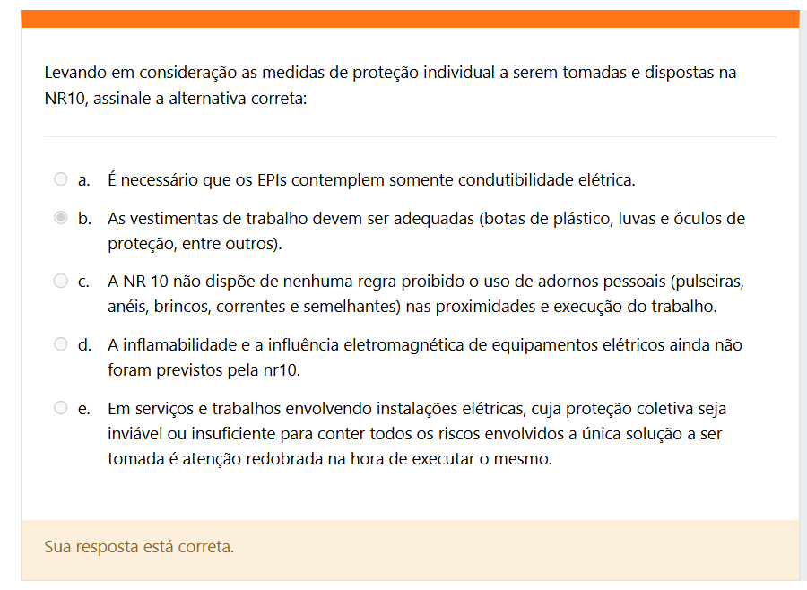 Levando em consideração as medidas de proteção individual a serem tomadas e dispostas na NR10, assinale a alternativa correta: a. É necessário que OS EPIs contemplem somente condutibilidade elétrica. b. As vestimentas de trabalho devem ser adequadas (botas de plástico, luvas e óculos de proteção, entre outros). C. A NR 10 não dispõe de nenhuma regra proibido 0 uso de adornos pessoais (pulseiras, anéis, brincos, correntes e semelhantes) nas proximidades e execução do trabalho. d. A inflamabilidade e a influência eletromagnética de equipamentos elétricos ainda não foram previstos pela nr10. e. Em serviços e trabalhos envolvendo instalações elétricas, cuja proteção coletiva seja inviável ou insuficiente para conter todos riscos envolvidos a única solução a ser tomada é atenção redobrada na hora de executar O mesmo. Sua resposta está correta.