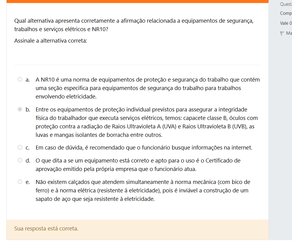 Questa Comp Qual alternativa apresenta corretamente a afirmação relacionada a equipamentos de segurança, Vale 0 trabalhos e serviços elétricos e NR10? Ma Assinale a alternativa correta: a. A NR10 é uma norma de equipamentos de proteção e segurança do trabalho que contém uma seção especifica para equipamentos de segurança do trabalho para trabalhos envolvendo eletricidade. b. Entre equipamentos de proteção individual previstos para assegurar a integridade física do trabalhador que executa serviços elétricos, temos: capacete classe B, óculos com proteção contra a radiação de Raios Ultravioleta A (UVA) e Raios Ultravioleta B (UVB), as luvas e mangas isolantes de borracha entre outros. C. Em caso de dúvida, é recomendado que funcionário busque informações na internet. d. que dita a se um equipamento está correto e apto para O uso é Certificado de aprovação emitido pela própria empresa que funcionário atua. e. Não existem calçados que atendem simultaneamente à norma mecânica (com bico de ferro) e à norma elétrica (resistente à eletricidade), pois é inviável a construção de um sapato de aço que seja resistente à eletricidade. Sua resposta está correta.