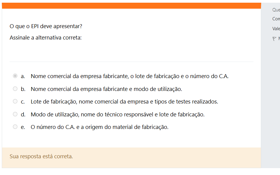 Que Con que EPI deve apresentar? Vale Assinale a alternativa correta: N a. Nome comercial da empresa fabricante, O lote de fabricação e número do C.A. b. Nome comercial da empresa fabricante e modo de utilização. C. Lote de fabricação, nome comercial da empresa e tipos de testes realizados. d. Modo de utilização, nome do técnico responsável e lote de fabricação. e. número do C.A. e a origem do material de fabricação. Sua resposta está correta.