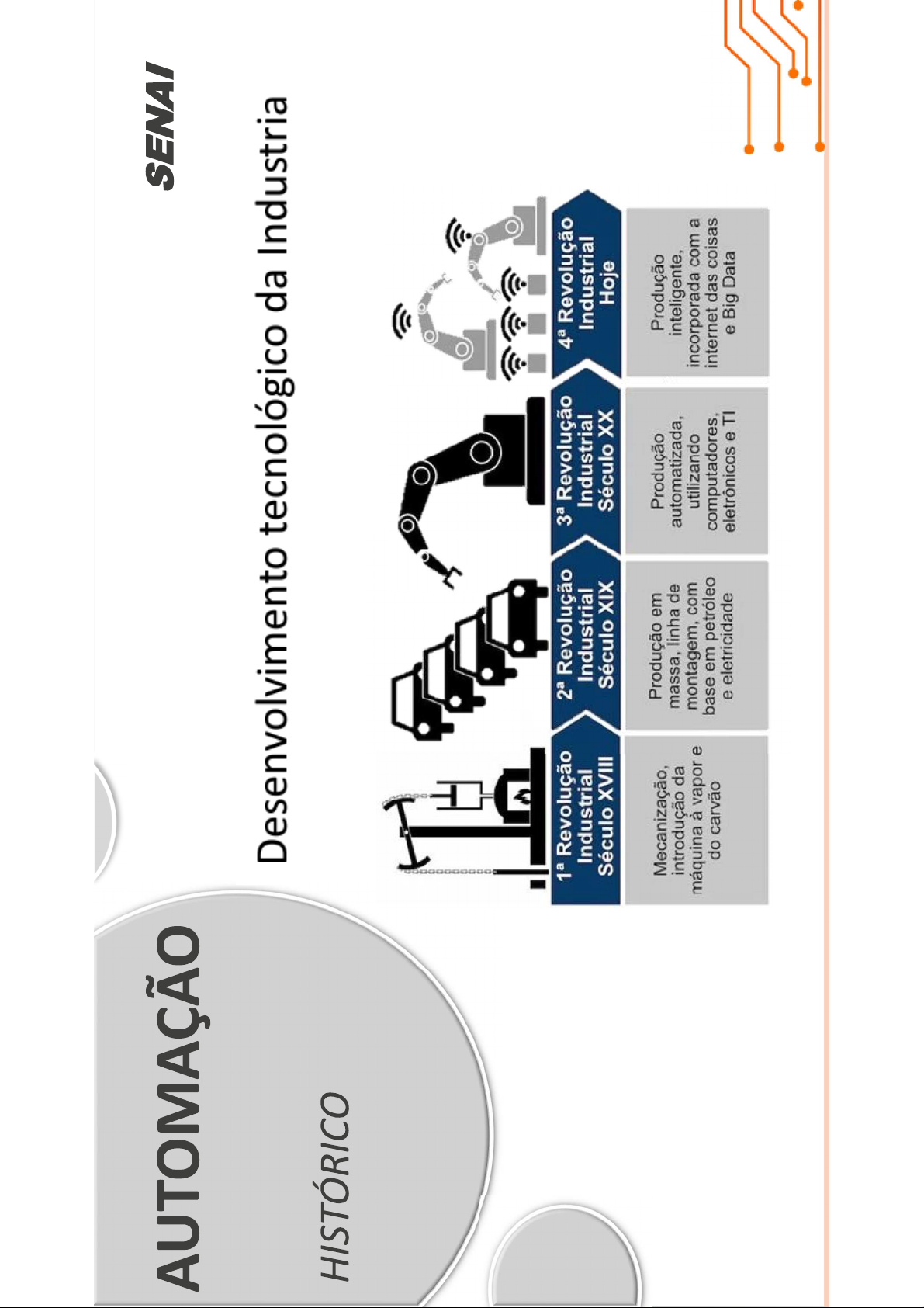 AUTOMAÇÃO SENAI Desenvolvimento tecnológico da Industria HISTÓRICO 1ª Revolução Revolução Revolução Revolução Industrial Industrial Industrial Industrial Século XVIII Século XIX Século Hoje Mecanização, Produção em Produção Produção introdução da massa, linha de automatizada, inteligente, máquina à vapor e montagem, com utilizando incorporada com a do carvão base em petróleo computadores, internet das coisas e eletricidade eletrônicos e TI e Big DataSENAI AUTOMAÇÃO INDUSTRIAL AUTOMAÇÃO INTRODUÇÃO AAUTOMAÇÃO SENAI aplicação de tecnologias, sistemas e INDUSTRIAL processos para otimizar e controlar automaticamente operações e processos em ambientes industriais. principal objetivo é aumentar a eficiência, melhorar a qualidade, reduzir custos operacionais e garantir a segurança nos processos industriais.AUTOMAÇÃO SENAI Envolve a integração de sistemas INDUSTRIAL computacionais, sensores, instrumentação e atuadores para realizar tarefas anteriormente realizadas por operadores. A automação busca não apenas substituir a mão de obra humana em tarefas repetitivas, perigosas ou monótonas, mas também aprimorar a precisão, consistência e velocidade na execução de processos complexos.AUTOMAÇÃO SENAI Os elementos fundamentais da automação industrial incluem sistemas de controle, INDUSTRIAL sensores para coleta de dados, atuadores para realizar ações físicas, e a lógica de controle programável. Esses componentes são interligados para formar sistemas integrados capazes de monitorar, controlar e otimizar operações em diversos setores industriais, como manufatura, petróleo, gás, química, energia, entre outros.AUTOMAÇÃO SENAI Compreende surgimento de uma nova INDUSTRIA 4.0 ou era de avanço tecnológico, como desenvolvimento de fábricas INDUSTRIA DIGITAL inteligentes, versáteis e eficientes. São apoiadas na Computação, na automação e na conectividade.SEGURANÇA DA INFORMAÇÃO INTERNET REALIDADE DAS COISAS AUMENTADA COMPUTAÇÃO DE NUVEM BIG DATA INDÚSTRIA SISTEMAS 4.0 INTEGRADOS ROBÔS AUTÔNOMOS MANUFATURA SIMULAÇÕES ADITIVA eAUTOMAÇÃO SENAI Internet das coisas INDUSTRIA 4.0 ou Internet of Things) INDUSTRIA DIGITAL São equipamentos conectados a internet que interagem e integram máquinas, produtos, sistemas e pessoas. Esses objetos, combinados com sistemas automatizados, podem ajudar a coletar informações em tempo real, analisá- las e criar ações de resposta conforme a necessidade. Dessa forma, a Internet das Coisas nada mais é do que uma expansão da conectividadeAUTOMAÇÃO SENAI Aplicações da loT INDUSTRIA 4.0 ou INDUSTRIA DIGITAL Casas Inteligentes: Interação dos equipamentos residenciais com dispositivos móveis, etc.AUTOMAÇÃO SENAI Aplicações da loT INDUSTRIA 4.0 ou INDUSTRIA DIGITAL Veículos conectados: AppleCarPlay, AndroidAuto etc.
