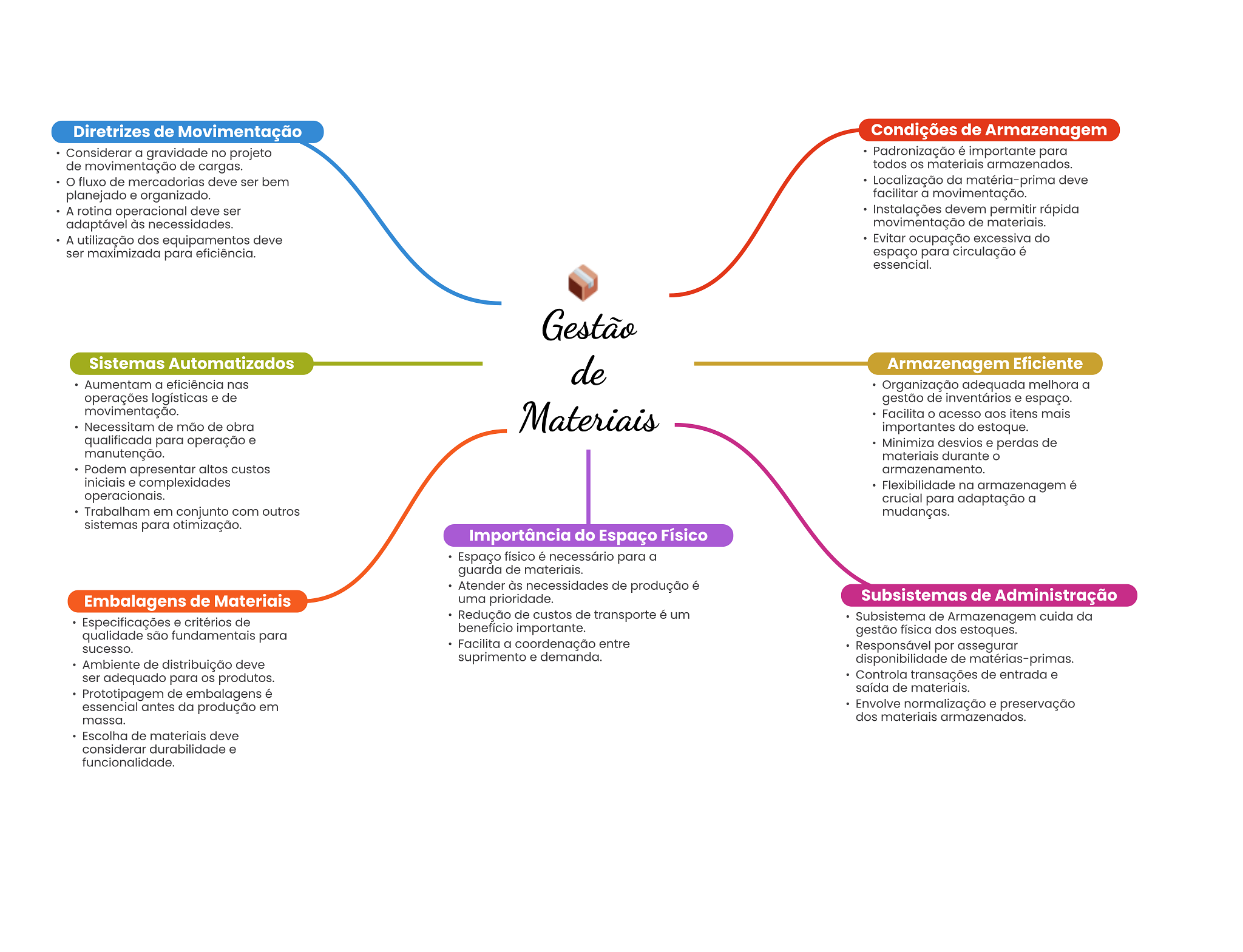 Diretrizes de Movimentação Condições de Armazenagem Considerar a gravidade no projeto Padronização é importante para de movimentação de cargas. todos os materiais armazenados. fluxo de mercadorias deve ser bem Localização da matéria-prima deve planejado e organizado. facilitar a movimentação. A rotina operacional deve ser Instalações devem permitir rápida adaptável às necessidades. movimentação de materiais. A utilização dos equipamentos deve Evitar ocupação excessiva do ser maximizada para eficiência. espaço para circulação é essencial. Gestão Sistemas Automatizados de Armazenagem Eficiente Aumentam a eficiência nas Organização adequada melhora a operações logísticas e de gestão de inventários e espaço. movimentação. Materiais Facilita acesso aos itens mais Necessitam de mão de obra importantes do estoque. qualificada para operação e Minimiza desvios e perdas de manutenção. materiais durante Podem apresentar altos custos armazenamento. iniciais e complexidades Flexibilidade na armazenagem é operacionais. crucial para adaptação a Trabalham em conjunto com outros mudanças. sistemas para otimização. Importância do Espaço Físico Espaço físico é necessário para a guarda de materiais. Atender às necessidades de produção é Embalagens de Materiais uma prioridade. Subsistemas de Administração Redução de custos de transporte é um Especificações e critérios de Subsistema de Armazenagem cuida da benefício importante. qualidade são fundamentais para gestão física dos estoques. sucesso. Facilita a coordenação entre Responsável por assegurar suprimento e demanda. Ambiente de distribuição deve disponibilidade de matérias-primas. ser adequado para produtos. Controla transações de entrada e saída de materiais. Prototipagem de embalagens é essencial antes da produção em Envolve normalização e preservação massa. dos materiais armazenados. Escolha de materiais deve considerar durabilidade e funcionalidade.