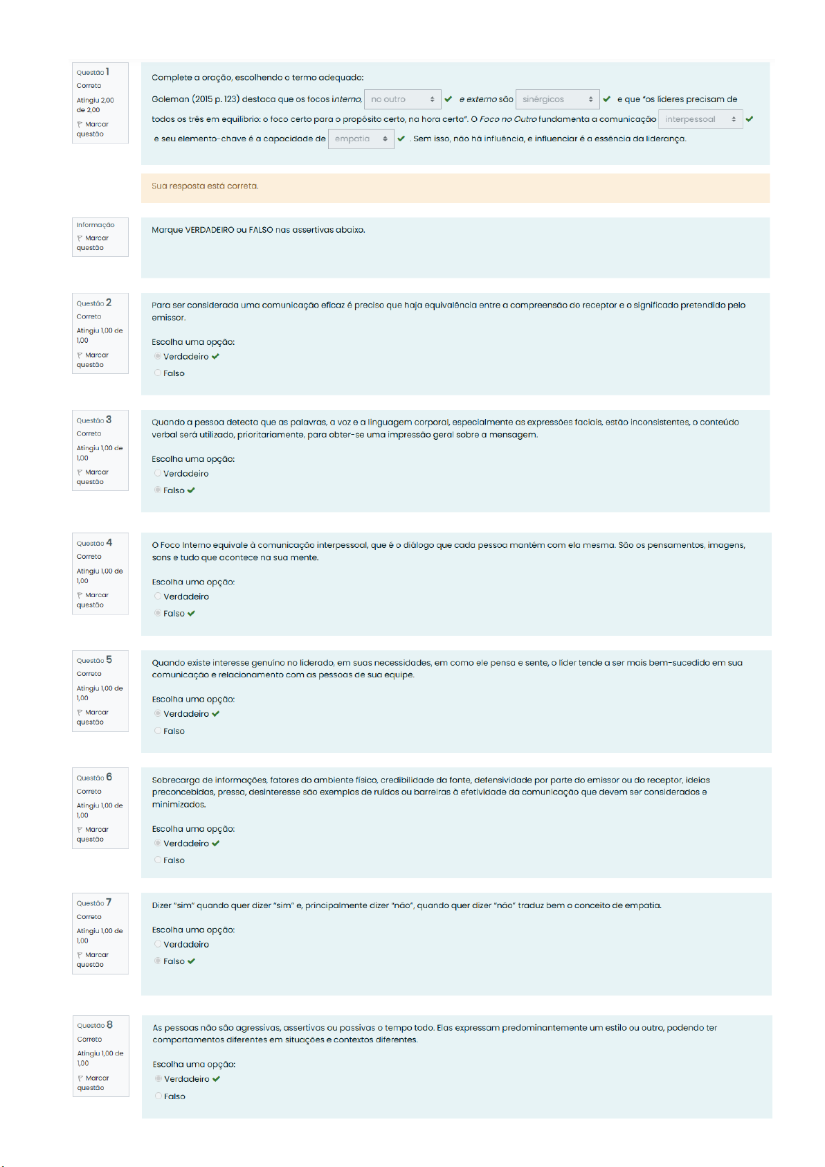 Questão 1 Complete a oração, escolhendo termo adequado: Correto Atingiu 2,00 Goleman (2015 123) destaca que os focos interno, no outro e externo são sinérgicos e que líderes precisam de de 2,00 todos os três em equilíbrio: foco certo para propósito certo, na hora certa". Foco no Outro fundamenta a comunicação interpessoal P Marcar questão e seu elemento-chave é a capacidade de empatia Sem isso, não há influência, e influenciar é a essência da liderança. Sua resposta está correta. Informação Marque VERDADEIRO ou FALSO nas assertivas abaixo. P Marcar questão Questão 2 Para ser considerada uma comunicação eficaz é preciso que haja equivalência entre a compreensão do receptor e significado pretendido pelo Correto emissor. Atingiu 1,00 de 1,00 Escolha uma opção: Marcar Verdadeiro questão Falso Questão 3 Quando a pessoa detecta que as palavras, a voz e a linguagem corporal, especialmente as expressões faciais, estão inconsistentes, conteúdo Correto verbal será utilizado, prioritariamente, para obter-se uma impressão geral sobre a mensagem. Atingiu 1,00 de 1,00 Escolha uma opção: Marcar Verdadeiro questão Falso Questão 4 Foco Interno equivale à comunicação interpessoal, que é diálogo que cada pessoa mantém com ela mesma. São os pensamentos, imagens, Correto sons e tudo que acontece na sua mente. Atingiu 1,00 de 1,00 Escolha uma opção: P Marcar Verdadeiro questão Falso Questão 5 Quando existe interesse genuíno no liderado, em suas necessidades, em como ele pensa e sente, líder tende a ser mais bem-sucedido em sua Correto comunicação e relacionamento com as pessoas de sua equipe. Atingiu 1,00 de 1,00 Escolha uma opção: P Marcar Verdadeiro questão Falso Questão 6 Sobrecarga de informações, fatores do ambiente físico, credibilidade da fonte, defensividade por parte do emissor ou do receptor, ideias Correto preconcebidas, pressa, desinteresse são exemplos de ruídos ou barreiras à efetividade da comunicação que devem ser considerados e Atingiu 1,00 de minimizados. 1,00 P Marcar Escolha uma opção: questão Verdadeiro Falso Questão 7 Dizer "sim" quando quer dizer "sim" e, principalmente dizer "não", quando quer dizer "não" traduz bem conceito de empatia. Correto Atingiu 1,00 de Escolha uma opção: 1,00 Verdadeiro P Marcar questão Falso Questão 8 As pessoas não são agressivas, assertivas ou passivas tempo todo. Elas expressam predominantemente um estilo ou outro, podendo ter Correto comportamentos diferentes em situações e contextos diferentes. Atingiu 1,00 de 1,00 Escolha uma opção: P Marcar Verdadeiro questão FalsoQuestão 9 São exemplos de comportamento passivo-agressivo: vitimização, procrastinação, teimosia, ressentimento, azedume, falhas repetidas e deliberadas Correto para retardar ou impedir a concretização de pedidos ou tarefas pelos quais a pessoa é responsável, agressão por meio de piadinhas, etc. Atingiu 1,00 de 1,00 Escolha uma opção: P Marcar Verdadeiro questão Falso Questão 10 A partir das afirmativas a seguir, escolha a opção correta: pontos) Correto desenvolvimento de relações maduras e produtivas requer desenvolvimento do comportamento assertivo, aprendendo a conhecer limites Atingiu 3,00 pessoais e a respeitar a diversidade e as diferenças dos outros. de 3,00 II. A comunicação assertiva é essencial para que líder comunique, com objetividade e clareza, metas e decisões, e para que liderado P Marcar questão compreenda seu papel na estratégia organizacional. III. A comunicação assertiva apresenta diversas vantagens, mas não se relaciona com a segurança psicológica no ambiente de trabalho. IV. Uma crença básica do líder que busca promover segurança psicológica é que a melhor equipe não é aquela que comete menos erros, mas aquela que tem um ambiente em que pode discutir abertamente erros cometidos. V.O tema Segurança Psicológica no Trabalho tem ganhado destaque nos estudos sobre produtividade. Nesse sentido, a empresa Google, por exemplo, empreendeu chamado Projeto Aristóteles. Escolha uma opção: a. Todas as afirmativas estão corretas. b. A única afirmativa incorreta é a III. Alternativa correta. A comunicação assertiva apresenta diversas vantagens, como: facilita fluxo das informações, confere mais credibilidade ao líder, assim como autoconfiança; diminui estresse; melhora a capacidade de negociação, ajuda a resolver confrontos e, sim, favorece a segurança psicológica no ambiente de trabalho. C. Estão incorretas as afirmativas e IV. d. Todas as afirmativas estão incorretas. e. Somente as afirmativas e V estão corretas. Sua resposta está correta. Questão 11 A respeito do Feedback é correto afirmar, exceto: Correto Atingiu 2,00 Escolha uma opção: de 2,00 a. Feedback é o processo de fornecer dados para que outro possa melhorar seu desempenho e alcançar determinados objetivos. P Marcar questão b. Trata-se de uma reorientação, se algo precisar ser modificado, ou de uma confirmação, se a pessoa estiver no rumo certo. Promover conscientização é um papel fundamental do feedback. d. Considerando a ferramenta "Janela de Johari", Solicitar feedback realmente consiste em aceitar e incentivar a percepção dos outros solicitar feedback consiste em aceitar e sobre você, para identificar como seus comportamentos afetam; é se ver pela ótica incentivar a percepção dos outros sobre você, dos outros, no entanto objetivo dessa ação é diminuir a área denominada Eu cego. e é importante porque diminui a área denominada Eu aberto. e. Dar feedback também é considerado um ato de autoexposição e envolve expressar suas percepções e sentimentos de como comportamento dos outros afeta; requer abertura e transparência de sua parte, diminuindo a área Eu desconhecido. Sua resposta está correta. Informação Marque VERDADEIRO ou FALSO nas assertivas abaixo P Marcar questão Questão 12 Um elogio, por si só, não pode ser confundido com um feedba