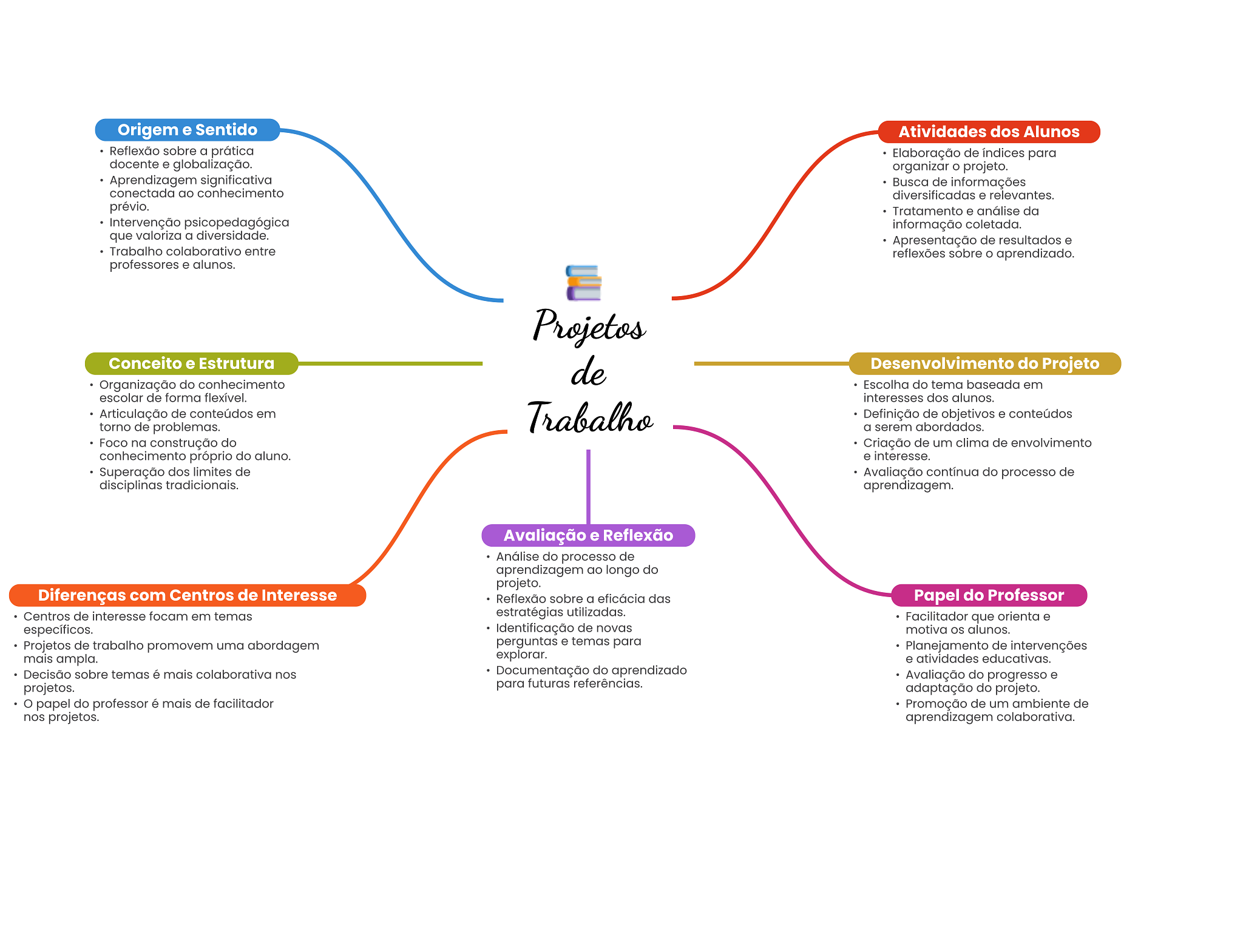 Origem e Sentido Atividades dos Alunos Reflexão sobre a prática Elaboração de índices para docente e globalização. organizar projeto. Aprendizagem significativa Busca de informações conectada ao conhecimento diversificadas e relevantes. prévio. Tratamento e análise da Intervenção psicopedagógica informação coletada. que valoriza a diversidade. Apresentação de resultados e Trabalho colaborativo entre reflexões sobre aprendizado. professores e alunos. Projetos Conceito e Estrutura de Desenvolvimento do Projeto Organização do conhecimento Escolha do tema baseada em escolar de forma flexível. interesses dos alunos. Articulação de conteúdos em Trabalho Definição de objetivos e conteúdos torno de problemas. a serem abordados. Foco na construção do Criação de um clima de envolvimento conhecimento próprio do aluno. e interesse. Superação dos limites de Avaliação contínua do processo de disciplinas tradicionais. aprendizagem. Avaliação e Reflexão Análise do processo de aprendizagem ao longo do projeto. Diferenças com Centros de Interesse Reflexão sobre a eficácia das Papel do Professor Centros de interesse focam em temas estratégias utilizadas. Facilitador que orienta e específicos. Identificação de novas motiva alunos. Projetos de trabalho promovem uma abordagem perguntas e temas para Planejamento de intervenções mais ampla. explorar. e atividades educativas. Decisão sobre temas é mais colaborativa nos Documentação do aprendizado Avaliação do progresso e projetos. para futuras referências. adaptação do projeto. papel do professor é mais de facilitador Promoção de um ambiente de nos projetos. aprendizagem colaborativa.