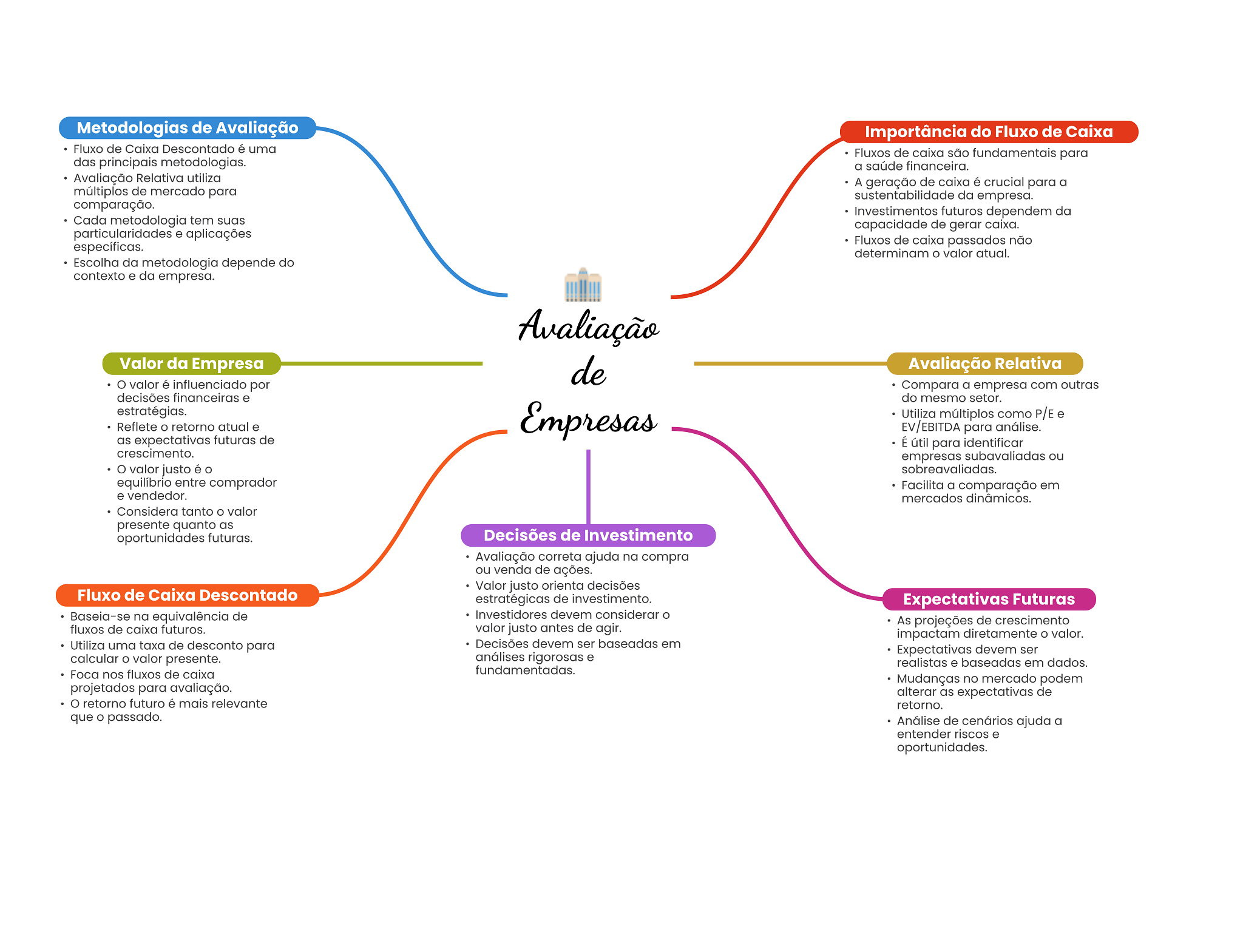 Metodologias de Avaliação Importância do Fluxo de Caixa Fluxo de Caixa Descontado é uma Fluxos de caixa são fundamentais para das principais metodologias. a saúde financeira. Avaliação Relativa utiliza A geração de caixa é crucial para a múltiplos de mercado para sustentabilidade da empresa. comparação. Investimentos futuros dependem da Cada metodologia tem suas capacidade de gerar caixa. particularidades e aplicações específicas. Fluxos de caixa passados não determinam valor atual. Escolha da metodologia depende do contexto e da empresa. Avaliação Valor da Empresa de Avaliação Relativa valor é influenciado por Compara a empresa com outras decisões financeiras e do mesmo setor. estratégias. Empresas Utiliza múltiplos como P/E e Reflete retorno atual e EV/EBITDA para análise. as expectativas futuras de É útil para identificar crescimento. empresas subavaliadas ou valor justo é sobreavaliadas. equilíbrio entre comprador Facilita a comparação em e vendedor. mercados dinâmicos. Considera tanto valor presente quanto as oportunidades futuras. Decisões de Investimento Avaliação correta ajuda na compra ou venda de ações. Valor justo orienta decisões Fluxo de Caixa Descontado estratégicas de investimento. Expectativas Futuras Baseia-se na equivalência de Investidores devem considerar As projeções de crescimento fluxos de caixa futuros. valor justo antes de agir. impactam diretamente O valor. Utiliza uma taxa de desconto para Decisões devem ser baseadas em Expectativas devem ser calcular valor presente. análises rigorosas e realistas e baseadas em dados. Foca nos fluxos de caixa fundamentadas. Mudanças no mercado podem projetados para avaliação. alterar as expectativas de retorno futuro é mais relevante retorno. que passado. Análise de cenários ajuda a entender riscos e oportunidades.