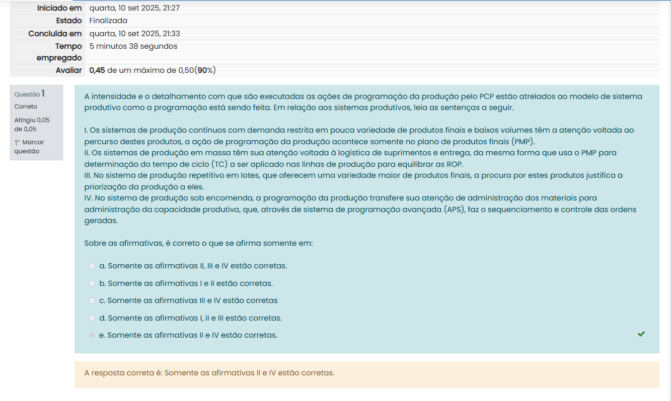 Iniciado em quarta, 10 set 2025, 21:27 Estado Finalizada Concluída em quarta, 10 set 2025, 21:33 Tempo 5 minutos 38 segundos empregado Avaliar 0,45 de um máximo de 0,50(90%) Questão 1 A intensidade e O detalhamento com que são executadas as ações de programação da produção pelo PCP estão atrelados ao modelo de sistema Correto produtivo como a programação está sendo feita. Em relação aos sistemas produtivos, leia as sentenças a seguir. Atingiu 0,05 de 0,05 I. Os sistemas de produção contínuos com demanda restrita em pouca variedade de produtos finais e baixos volumes têm a atenção voltada ao Marcar percurso destes produtos, a ação de programação da produção acontece somente no plano de produtos finais (PMP). questão II. Os sistemas de produção em massa têm sua atenção voltada à logística de suprimentos e entrega, da mesma forma que usa O PMP para determinação do tempo de ciclo (TC) a ser aplicado nas linhas de produção para equilibrar as ROP. III. No sistema de produção repetitivo em lotes, que oferecem uma variedade maior de produtos finais, a procura por estes produtos justifica a priorização da produção a eles. IV. No sistema de produção sob encomenda, a programação da produção transfere sua atenção de administração dos materiais para administração da capacidade produtiva, que, através de sistema de programação avançada (APS), faz O sequenciamento e controle das ordens geradas. Sobre as afirmativas, é correto que se afirma somente em: a. Somente as afirmativas II, III e IV estão corretas. b. Somente as afirmativas e II estão corretas. C. Somente as afirmativas III e IV estão corretas d. Somente as afirmativas I, II e III estão corretas. e. Somente as afirmativas II e IV estão corretas. A resposta correta é: Somente as afirmativas e IV estão corretas.