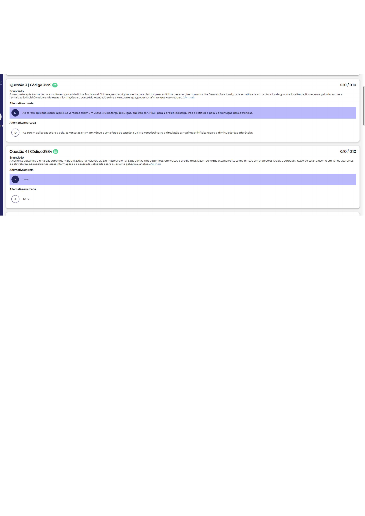 Questão 3 Código 3999 0.10 / 0.10 Enunciado A ventosaterapia é uma técnica muito antiga da Medicina Tradicional Chinesa, usada originalmente para desbloquear as linhas das energias humanas. Na Dermatofuncional, pode ser utilizada em protocolos de gordura localizada, fibroedema geloide, estrias e revitalização facial.Considerando essas informações e O conteúdo estudado sobre a ventosaterapia, podemos afirmar que esse recurso...Ver mais Alternativa correta D Ao serem aplicadas sobre a pele, as ventosas criam um vácuo e uma força de sucção, que irão contribuir para a circulação sanguínea e linfática e para a diminuição das aderências. Alternativa marcada D Ao serem aplicadas sobre a pele, as ventosas criam um vácuo e uma força de sucção, que irão contribuir para a circulação sanguínea e linfática e para a diminuição das aderências. Questão 41 Código 3984 0.10 / 0.10 Enunciado A corrente galvânica é uma das correntes mais utilizadas na Fisioterapia Dermatofuncional. Seus efeitos eletroquímicos, osmóticos e circulatórios fazem com que essa corrente tenha função em protocolos faciais e corporais, razão de estar presente em vários aparelhos de essas informações e O conteúdo estudado sobre a corrente analise...Ver mais Alternativa correta A IV. Alternativa marcada A IV.