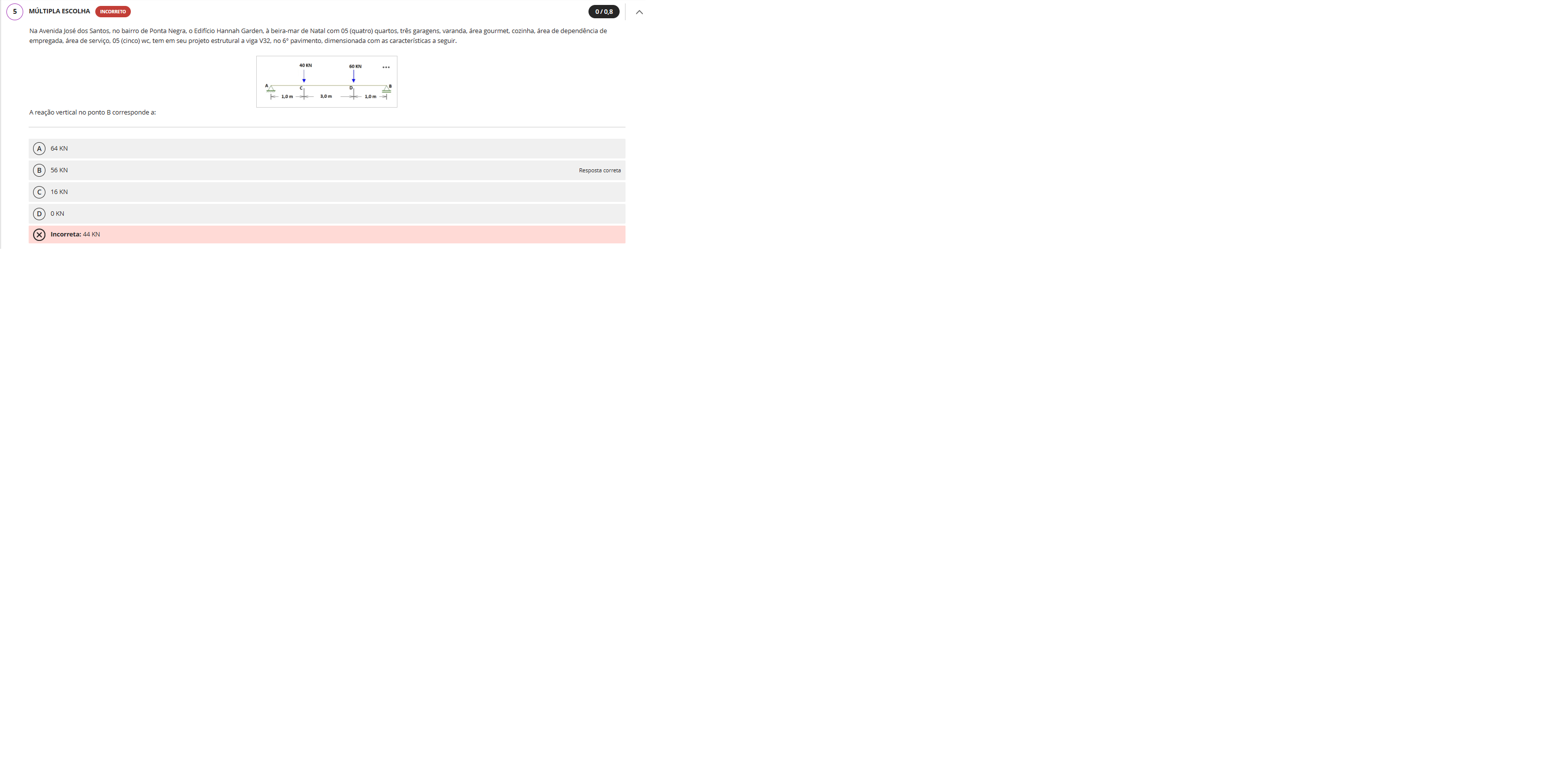 Na Avenida José dos Santos, no bairro de Ponta Negra, Edifício Hannah à beira-mar de Natal com 05 (quatro) quartos, três garagens, varanda, area gourmet, cozinha, área de dependência de empregada, área de serviço, 05 (cinco) WC, tem em seu projeto estrutural a viga V32, no 6° pavimento, dimensionada com as características a seguir. 60 KN ... A D 1,0 m A reação vertical no ponto B corresponde a: A 64 KN B 56 KN Resposta correta C 16 KN D 0 KN Incorreta: 44 KN