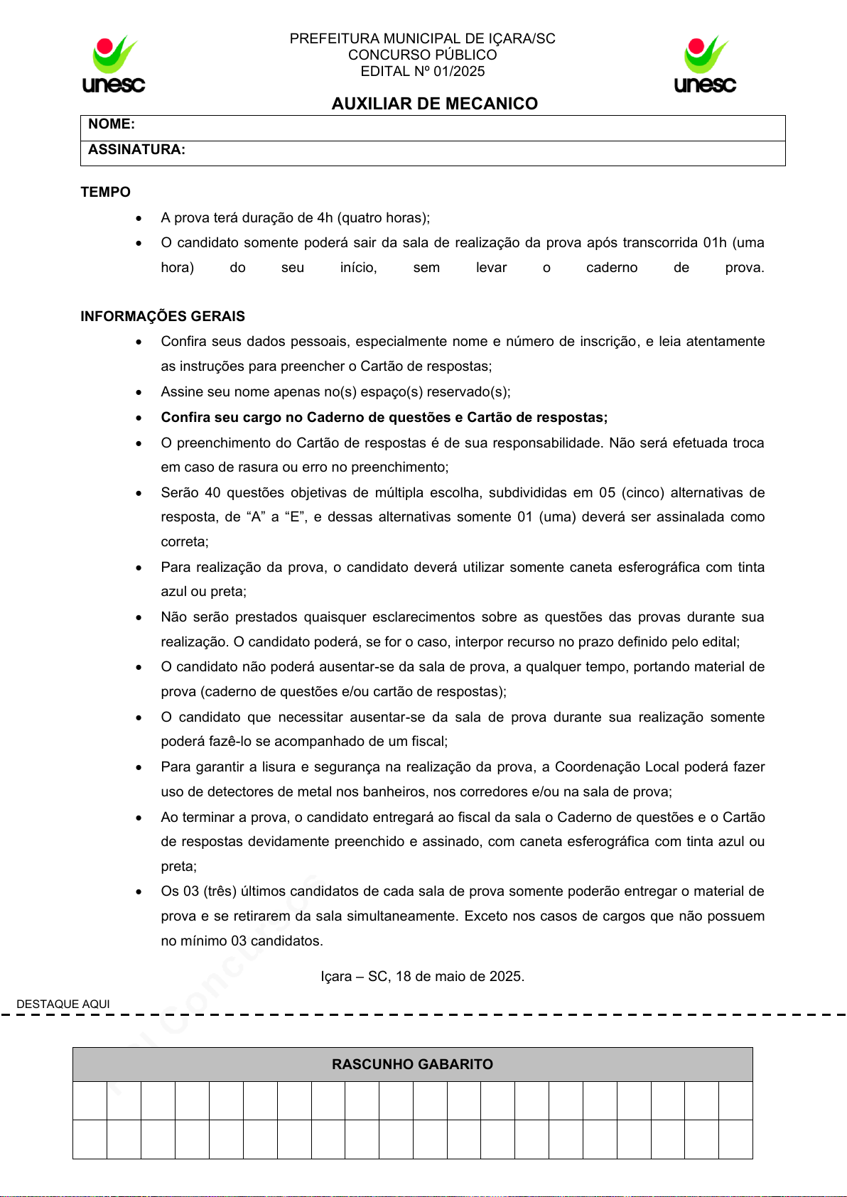 pcimarkpci MjgwNDowMjE0OjkzZDU6OWY5NDozZDkxOjI3ZGI6MTMzZDoxNzZi:TW9uLCAwMSBEZWMgMjAyNSAyMDoyMDozMSAtMDMwMA== www.pciconcursos.com.br PREFEITURA MUNICIPAL DE IÇARA/SC CONCURSO PÚBLICO EDITAL Nº 01/2025 RASCUNHO GABARITO NOME: ASSINATURA: TEMPO • A prova terá duração de 4h (quatro horas); • O candidato somente poderá sair da sala de realização da prova após transcorrida 01h (uma hora) do seu início, sem levar o caderno de prova. INFORMAÇÕES GERAIS • Confira seus dados pessoais, especialmente nome e número de inscrição, e leia atentamente as instruções para preencher o Cartão de respostas; • Assine seu nome apenas no(s) espaço(s) reservado(s); • Confira seu cargo no Caderno de questões e Cartão de respostas; • O preenchimento do Cartão de respostas é de sua responsabilidade. Não será efetuada troca em caso de rasura ou erro no preenchimento; • Serão 40 questões objetivas de múltipla escolha, subdivididas em 05 (cinco) alternativas de resposta, de “A” a “E”, e dessas alternativas somente 01 (uma) deverá ser assinalada como correta; • Para realização da prova, o candidato deverá utilizar somente caneta esferográfica com tinta azul ou preta; • Não serão prestados quaisquer esclarecimentos sobre as questões das provas durante sua realização. O candidato poderá, se for o caso, interpor recurso no prazo definido pelo edital; • O candidato não poderá ausentar-se da sala de prova, a qualquer tempo, portando material de prova (caderno de questões e/ou cartão de respostas); • O candidato que necessitar ausentar-se da sala de prova durante sua realização somente poderá fazê-lo se acompanhado de um fiscal; • Para garantir a lisura e segurança na realização da prova, a Coordenação Local poderá fazer uso de detectores de metal nos banheiros, nos corredores e/ou na sala de prova; • Ao terminar a prova, o candidato entregará ao fiscal da sala o Caderno de questões e o Cartão de respostas devidamente preenchido e assinado, com caneta esferográfica com tinta azul ou preta; • Os 03 (três) últimos candidatos de cada sala de prova somente poderão entregar o material de prova e se retirarem da sala simultaneamente. Exceto nos casos de cargos que não possuem no mínimo 03 candidatos. Içara – SC, 18 de maio de 2025. DESTAQUE AQUI AUXILIAR DE MECANICO pcimarkpci MjgwNDowMjE0OjkzZDU6OWY5NDozZDkxOjI3ZGI6MTMzZDoxNzZi:TW9uLCAwMSBEZWMgMjAyNSAyMDoyMDozMSAtMDMwMA== www.pciconcursos.com.br Conhecimentos Específicos Questão 01 Os Equipamentos de Proteção Individuais (EPIs) não impedem que os acidentes de trabalho aconteçam, entretanto, o seu uso pode diminuir o risco associado às atividades rotineiras. Logo, a sua utilização é imprescindível a qualquer atividade que tenham riscos de trabalho associados. Abaixo estão alguns EPIs, identifique e marque a alternativa CORRETA que represente um que seja necessário à sua profissão de Auxiliar de Mecânico. (A) Avental de proteção. (B) Talabarte. (C) Boné árabe. (D) Cinto travaqueda. (E) Perneira. Questão 02 Na convivência diária é importante a manutenção da boa qualidade de relacionamento entre os colegas, e quando for realizar um atendimento ao público também. Existem algumas regras de convívio social e profissional, e a sua prática é fundamental para facilitar a convivência diária. Avalie as regras abaixo, e assinale a alternativa CORRETA. (A) Cumprimentar a todos, sem exceção e sem intimidades, tanto ao chegar quanto ao sair, inclusive pelos corredores. (B) Falar com sobriedade e gestos exagerados ou voz alterada. (C) Sempre que necessário, demonstrar firmeza, parecendo ser o dono da verdade. (D) Não exagerar nas gírias e nos modismos linguísticos, utilizar somente o necessário para uma boa conversa. (E) Tratar as pessoas com formas de respeito que se distinguem, sendo uns mais e outros menos. Questão 03 Durante uma atividade de chapeação, foram discutidas boas práticas de preparação de superfície e segurança. Observe as afirmações abaixo e marque (V) para as verdadeiras e (F) para as falsas: (__)A superfície a ser pintada deve estar limpa, seca e sem ferrugem. (__)A soldagem pode ser realizada próximo a tanques de combustível se bem ventilado. (__)O uso de máscara com filtro é essencial durante lixamento e pintura. (__)A aplicação da tinta deve ser feita diretamente sobre camadas espessas de ferrugem para garantir fixação. Após análise, assinale a alternativa que apresenta a sequência correta dos itens acima, de cima para baixo: (A) V, F, F, V. (B) F, F, V, V. (C) V, V, V, F. (D) V, F, V, F. (E) F, V, F, F. Questão 04 Em um dia de serviço, o auxiliar de mecânico é chamado para ajudar na substituição de uma peça no sistema de arrefecimento de um motor a diesel. Ele observa que o reservatório está com coloração enferrujada. Qual é a conduta técnica correta diante dessa situação? (A) Ignorar a coloração, pois não compromete o funcionamento. (B) Completar o nível do reservatório com água da torneira. (C) Retirar o termostato para acelerar o resfriamento. (D) Substituir o fluido de arrefecimento e realizar a limpeza completa do sistema. (E) Adicionar apenas fluido aditivo sem esvaziar o sistema. Questão 05 Durante uma troca de filtrode óleo em um trator, o auxiliar precisa identificar o momento correto para instalar o novo filtro. Qual é a etapa obrigatória antes da instalação do novo filtro? (A) Pintar o novo filtro para identificação. (B) Colocar o filtro novo com o motor ligado. (C) Lubrificar a borracha de vedação com o próprio óleo. (D) Aplicar graxa na rosca do filtro. (E) Lavar o filtro antigo e reutilizá-lo. Questão 06 Durante a separação de resíduos na oficina, o auxiliar de mecânico deve seguir práticas ambientalmente corretas para destinar os materiais. Qual dos procedimentos está de acordo com a política de destinação correta de resíduos? (A) Lavar panos com óleo di