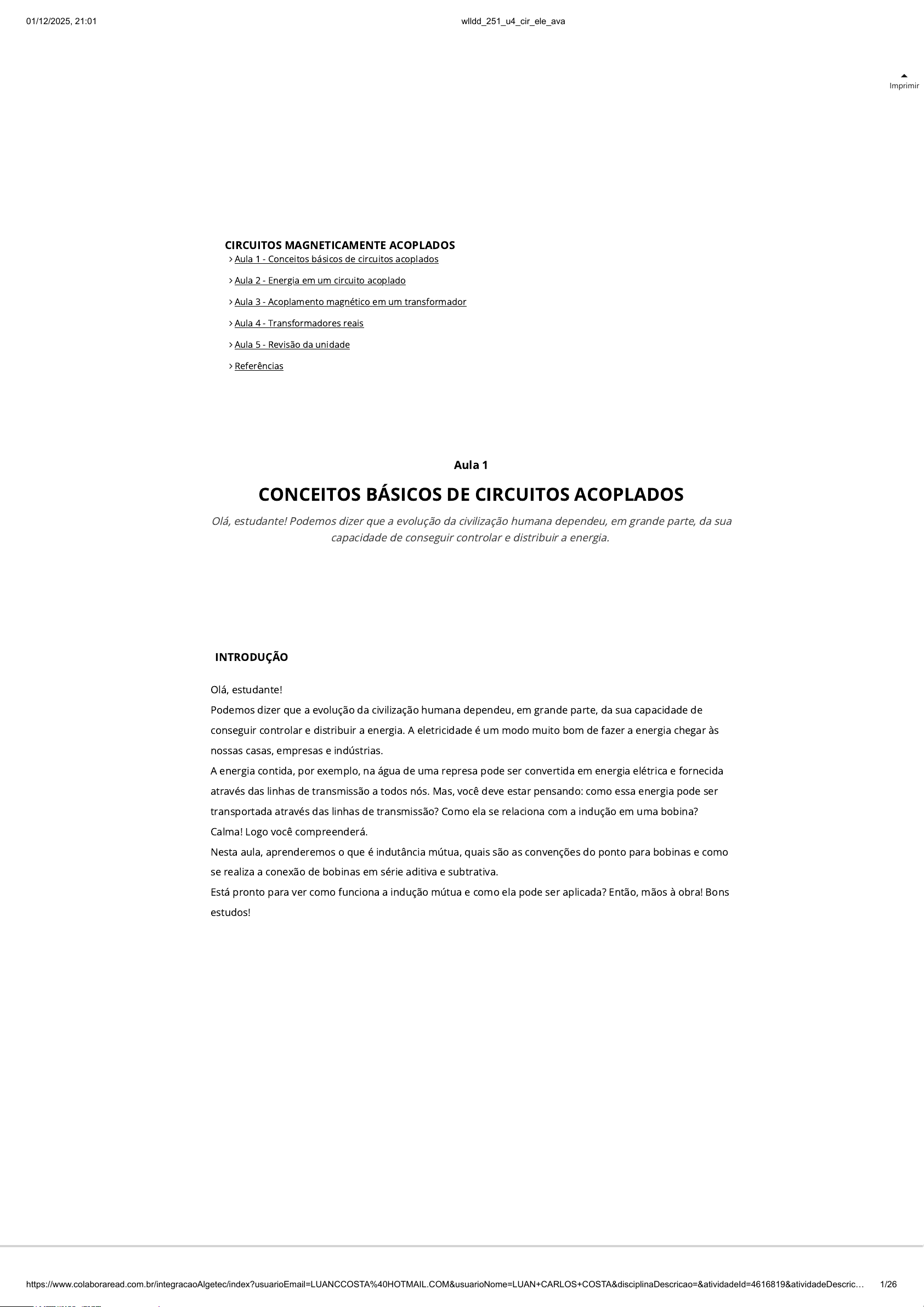 Imprimir INTRODUÇÃO Olá, estudante! Podemos dizer que a evolução da civilização humana dependeu, em grande parte, da sua capacidade de conseguir controlar e distribuir a energia. A eletricidade é um modo muito bom de fazer a energia chegar às nossas casas, empresas e indústrias. A energia contida, por exemplo, na água de uma represa pode ser convertida em energia elétrica e fornecida através das linhas de transmissão a todos nós. Mas, você deve estar pensando: como essa energia pode ser transportada através das linhas de transmissão? Como ela se relaciona com a indução em uma bobina? Calma! Logo você compreenderá. Nesta aula, aprenderemos o que é indutância mútua, quais são as convenções do ponto para bobinas e como se realiza a conexão de bobinas em série aditiva e subtrativa. Está pronto para ver como funciona a indução mútua e como ela pode ser aplicada? Então, mãos à obra! Bons estudos! Aula 1 CONCEITOS BÁSICOS DE CIRCUITOS ACOPLADOS Olá, estudante! Podemos dizer que a evolução da civilização humana dependeu, em grande parte, da sua capacidade de conseguir controlar e distribuir a energia. CIRCUITOS MAGNETICAMENTE ACOPLADOS Aula 1 - Conceitos básicos de circuitos acoplados Aula 2 - Energia em um circuito acoplado Aula 3 - Acoplamento magnético em um transformador Aula 4 - Transformadores reais Aula 5 - Revisão da unidade Referências 01/12/2025, 21:01 wlldd_251_u4_cir_ele_ava https://www.colaboraread.com.br/integracaoAlgetec/index?usuarioEmail=LUANCCOSTA%40HOTMAIL.COM&usuarioNome=LUAN+CARLOS+COSTA&disciplinaDescricao=&atividadeId=4616819&atividadeDescric… 1/26 INTRODUÇÃO À INDUTÂNCIA E POLARIDADE Caro estudante, um dos grandes problemas que as companhias de energia enfrentaram é como conseguir transportar a energia elétrica que foi produzida em uma usina até as cidades e, por consequência, até as nossas casas, comércio e indústria. Fica claro que a solução seria através dos cabos, mas isso também seria um problema, pois existem companhias elétricas que distribuem energia para muitos estados brasileiros. Pense quanta energia seria perdida desde a produção até a chegada aos locais. É muita energia! Para resolver isso, descobriram um modo de diminuir essa perda, e o meio escolhido e usado até hoje é reduzir a tensão elétrica/corrente elétrica. Assim, as companhias elétricas aumentaram a voltagem nas linhas de transmissão. Porém, a voltagem entregue nas nossas casas não pode ser muito alta, já que os equipamentos eletrodomésticos operam com tensões da ordem de 127 V e 220 V. Desse modo, para diminuir a tensão ao chegar às cidades, é utilizado o que chamamos de transformador, que é responsável por aumentar ou reduzir a tensão. O transformador é um dispositivo que foi projetado especificamente para produzir o efeito de indutância mútua entre duas ou mais bobinas. Ele tem como base o conceito de acoplamento magnético, pois usa bobinas acopladas magneticamente para transferir energia de um circuito para outro. Além disso, é um elemento fundamental para os sistemas de geração de energia elétrica, já que tem a propriedade de elevar ou abaixar as tensões e/ou as correntes alternadas (Alexander; Sadiku, 2013). Mas, o que é indutância mútua? E o que vem a ser acoplamento magnético? Quando dois indutores ou bobinas estiverem muito próximos um do outro, o fluxo magnético que é provocado pela corrente em uma bobina se associará à outra bobina, induzindo, desse modo, uma tensão nessa última bobina. Esse fenômeno é chamado de indutância mútua, e é medida em henrys (H) (Alexander; Sadiku, 2013). A tensão induzida só acontece quando o fluxo do campo magnético está mudando de intensidade em relação ao fio, assim, a indutância mútua entre duas bobinas só pode acontecer com tensão CA, e não com tensão em corrente contínua (CC). A polaridade da tensão mútua é feita examinando a orientação ou o modo particular pelo qual as bobinas são enroladas fisicamente, bem como através da Lei de Lenz, junto à regra da mão direita. Porém, como não é conveniente mostrar os detalhes construtivos das bobinas em um esquema elétrico, o modo mais simples de mostrar a polaridade é através da aplicação da convenção do ponto em análise de circuitos. A convenção do ponto é definida do seguinte modo: caso uma corrente entre pelo terminal da bobina marcado com um ponto, a polaridade de referência da tensão mútua na segunda bobina será positiva no terminal da segunda bobina que foi marcado com um ponto (Alexander; Sadiku, 2013). É importante ficar claro que, no circuito, os pontos já estão marcados ao lado das bobinas, de modo que não é necessário ficarmos preocupados em inseri-los. Isso já facilita e muito as nossas análises. 01/12/2025, 21:01 wlldd_251_u4_cir_ele_ava https://www.colaboraread.com.br/integracaoAlgetec/index?usuarioEmail=LUANCCOSTA%40HOTMAIL.COM&usuarioNome=LUAN+CARLOS+COSTA&disciplinaDescricao=&atividadeId=4616819&atividadeDescric… 2/26 INDUTÂNCIA MÚTUA Caro estudante, consideraremos um único indutor e uma bobina com N espiras. Quando a corrente i flui através dessa bobina, é produzido um fluxo magnético ϕ em torno dela, conforme a Figura 1. Figura 1 | Fluxo magnético produzido por uma única bobina com N espiras Fonte: Alexander e Sadiku (2013, p. 494). Conforme a Lei de Faraday, a tensão v induzida na bobina é proporcional ao número de espiras N e à velocidade de variação do fluxo magnético ϕ do seguinte modo: (1) O fluxo ϕ é produzido pela corrente i; assim, qualquer variação em ϕ é provocada por uma variação na corrente. Portanto, a Equação (1) pode ser reescrita como: (2) Ou (3) A Equação (3) apresenta a relação tensão-corrente para o indutor, e a indutância L do indutor é determinada através da Equação (4), ou seja: (4) A indutância é normalmente chamada de autoindutância, pois ela relaciona a tensão induzida em