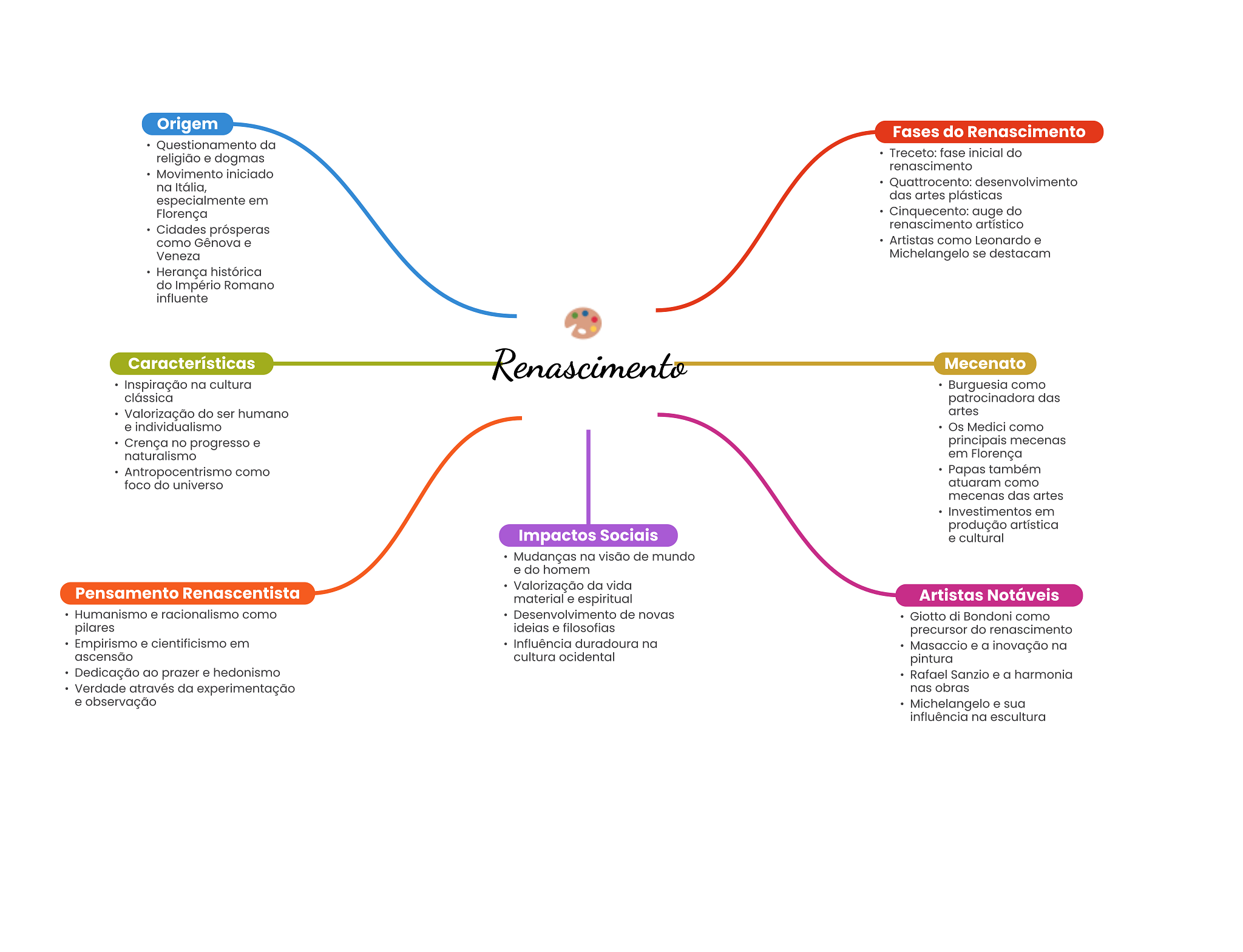Origem Fases do Renascimento Questionamento da Treceto: fase inicial do religião e dogmas renascimento Movimento iniciado na Itália, Quattrocento: desenvolvimento especialmente em das artes plásticas Florença Cinquecento: auge do Cidades prósperas renascimento artístico como Gênova e Artistas como Leonardo e Veneza Michelangelo se destacam Herança histórica do Império Romano influente Características Renascimento Mecenato Inspiração na cultura Burguesia como clássica patrocinadora das Valorização do ser humano artes e individualismo Os Medici como Crença no progresso e principais mecenas naturalismo em Florença Antropocentrismo como Papas também foco do universo atuaram como mecenas das artes Investimentos em produção artística Impactos Sociais e cultural Mudanças na visão de mundo e do homem Pensamento Renascentista Valorização da vida material e espiritual Artistas Notáveis Humanismo e racionalismo como Desenvolvimento de novas Giotto di Bondoni como pilares ideias e filosofias precursor do renascimento Empirismo e cientificismo em Influência duradoura na Masaccio e a inovação na ascensão cultura ocidental pintura Dedicação ao prazer e hedonismo Rafael Sanzio e a harmonia Verdade através da experimentação nas obras e observação Michelangelo e sua influência na escultura