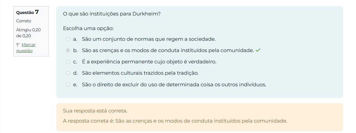 Questão 7 O que são instituições para Durkheim? Correto Atingiu 0,20 Escolha uma opção: de 0,20 a. São um conjunto de normas que regem a sociedade. Marcar questão b. São as crenças e modos de conduta instituídos pela comunidade. C. É a experiência permanente cujo objeto é verdadeiro. d. São elementos culturais trazidos pela tradição. e. São direito de excluir do uso de determinada coisa outros indivíduos. Sua resposta está correta. A resposta correta é: São as crenças e OS modos de conduta instituídos pela comunidade.