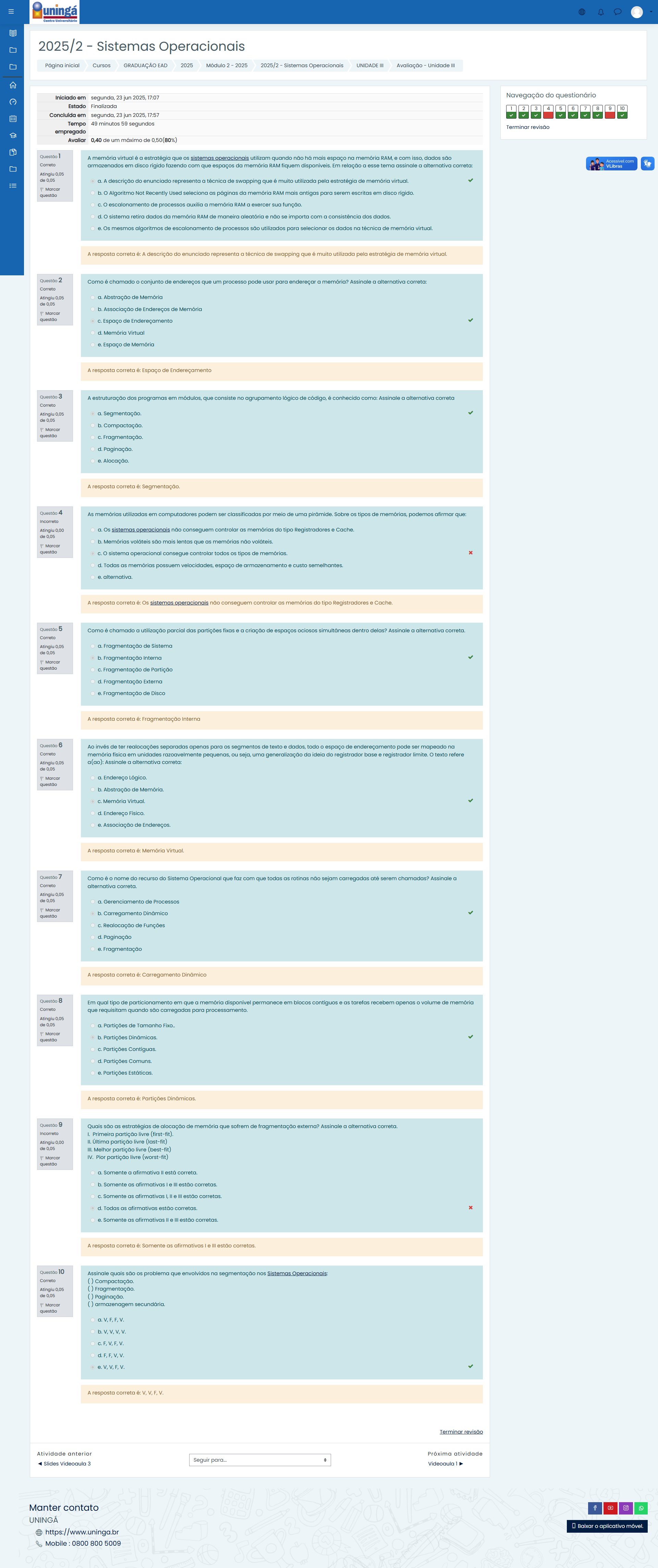 2025/2 - Sistemas Operacionais inicial Cursos EAD 2025 Módulo 2025 2025/2 Sistemas Operacionais UNIDADE Avaliação Unidade Iniciado em segunda, 23 17:07 Navegação do questionário Estado Finalizada em 23 jun 17:57 Tempo minutos segundos Terminar revisão empregado Avaliar 0,40 de um máximo de 0,50(80%) memória virtual estratégia que os sistemas operacionais utilizam quando não mais espaço memória com isso, dados são Correto armazenados em disco fazend com que espaços da memório RAM fiquem Em relação esse issinale iva correta descrição do enunciado de swapping que muito utilizada pela estratégia de memório virtual questão b Algoritmo Not Recently Used seleciona as páginas da RAM mais antigas para serem escritas em disco escalonam de processos auxilia memória RAM sua unção. sistema retira dados da memória RAM de maneira não se importa com consistência dos dados. Os mesmos algoritmos de escalonamento de processos são utilizados para dados na técnica de memória virtual. resposta correto descrição do enunciado técnico de swapping que muito ilizada pela de virtual Como chamado conjunto de endereços que um processo pode usar para endereçar memória? Assinale alternat va correta: Abstração de Memória Associação Endereços de Memória Espaço de Virtual Espaço resposta correto Espaço de Endereçamento A estruturação dos programas em módulos, que consiste no agrupamento lógico de código, conhecido como ale correta Correto Segmentação Compactação Fragmentação Alocação. correto mentação As memórias utilizadas em computadores podem ser classificadas por meio de uma Sobre tipos de podemos afirmar que Os sistemas operacionais não consegue controlar as do tipo Registradores Cache são mais lentas que as não sistema operacional consegue controlar todos tipos de Todas as memórias possuem velocidades, espaço de armazenamento custo semelhantes resposto Os sistemas operacionais onseguem controlar as do tipo stradore Cache Como chamado utilização parcial partições fixas criação de espaços ociosos dentro delas? Assinale alternativo Fragmentação Sistema Fragmentação Interna Fragmentação Partição Fragmentação Externa Fragmentação Disco A resposta correto Fragmentação Interno Ao de ter realocações separadas apenas para os segmentos de texto dados, todo endereçamen pode ser mapeado na Correto fisica em unidades razoavelmente ou seja, uma da do registrador base registrador limite texto refere a(ao): Assinale correta: Endereço questão Abstração Memória Virtual Endereço Associação Endereços resposta correto Memória Como nome do recurso do Sistema Operacional que faz com que todas as rotinas não sejam carregadas até serem chamadas? Assinale a Gerenciamento de Processos Carregamento Realocação Funções Paginação Fragmentação resposta correto Carregamento Em qual tipo de particion em que disponível permanece em blocos tarefas recebem apenas volume de memória Correto que requisitam quando são carregadas para processamento. Partições Tamanho questão b. Partições Dinâmicas Partições Partições Comuns Partições Estáticas resposta correto Partições Quais são as estratégias de alocação de memória que sofrem de fragmentação externa? Assinale alternativa correta Primeiro partição (first fit) partição livre (last fit) Melhor partição livre (best IV. Pior (worst fit) questão a Somente afirmativa estó correta Somente as afirmativas estão corretas Somente as afirmativas estão corretas Todas as afirmativas estão corretas Somente as afirmativas estão corretas resposta Somente as afirmativas estão corretas 10 Assinale quais são os problema que envolvidos na nos Sistemas Operacionais Correto Compactação. Fragmentação armazenagem correta Terminar revisão Atividade anterior atividade Slides Seguir para... Manter contato Baixar # Mobile 0800 800 5009