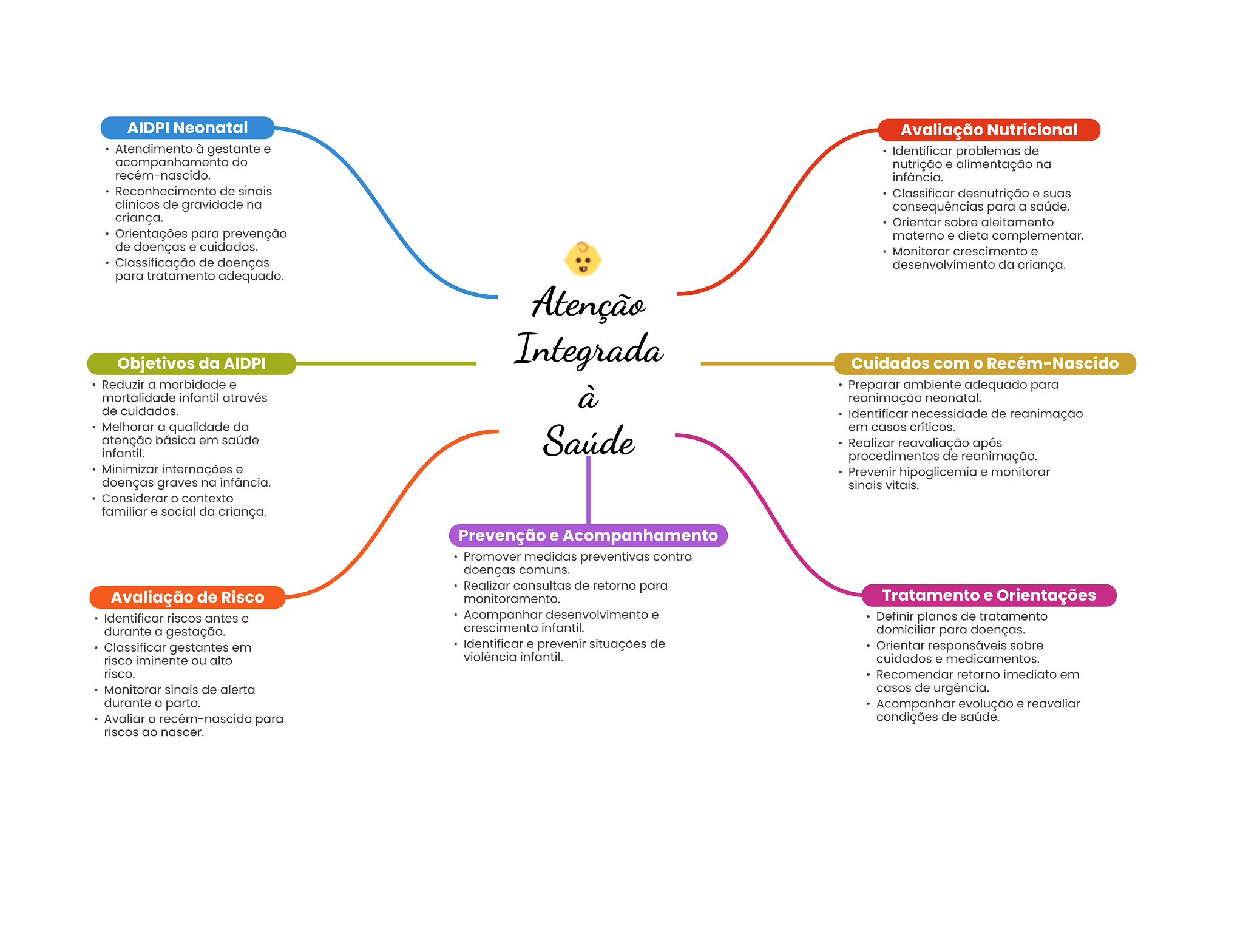 AIDPI Neonatal Avaliação Nutricional Atendimento à gestante e Identificar problemas de acompanhamento do nutrição e alimentação na recém-nascido. infância. Reconhecimento de singis Classificar desnutrição e suas clínicos de gravidade na consequências para a saúde. criança. Orientar sobre aleitamento Orientações para prevenção materno e dieta complementar. de doenças e cuidados. Monitorar crescimento e Classificação de doenças desenvolvimento da criança. para tratamento adequado. Atenção Objetivos da AIDPI Integrada Cuidados com Recém-Nascido Reduzir a morbidade e Preparar ambiente adequado para mortalidade infantil através à reanimação neonatal. de cuidados. Identificar necessidade de reanimação Melhorar a qualidade da em casos críticos. atenção básica em saúde Saúde Realizar reavaliação após infantil. procedimentos de reanimação. Minimizar internações e Prevenir hipoglicemia e monitorar doenças graves na infância. sinais vitais. Considerar contexto familiar e social da criança. Prevenção e Acompanhamento Promover medidas preventivas contra doenças comuns. Realizar consultas de retorno para Avaliação de Risco monitoramento. Tratamento e Orientações Identificar riscos antes e Acompanhar desenvolvimento e Definir planos de tratamento durante a gestação. crescimento infantil. domiciliar para doenças. Classificar gestantes em Identificar e prevenir situações de Orientar responsáveis sobre risco iminente ou alto violência infantil. cuidados e medicamentos. risco. Recomendar retorno imediato em Monitorar sinais de alerta casos de urgência. durante parto. Acompanhar evolução e reavaliar Avaliar recém-nascido para condições de saúde. riscos ao nascer.