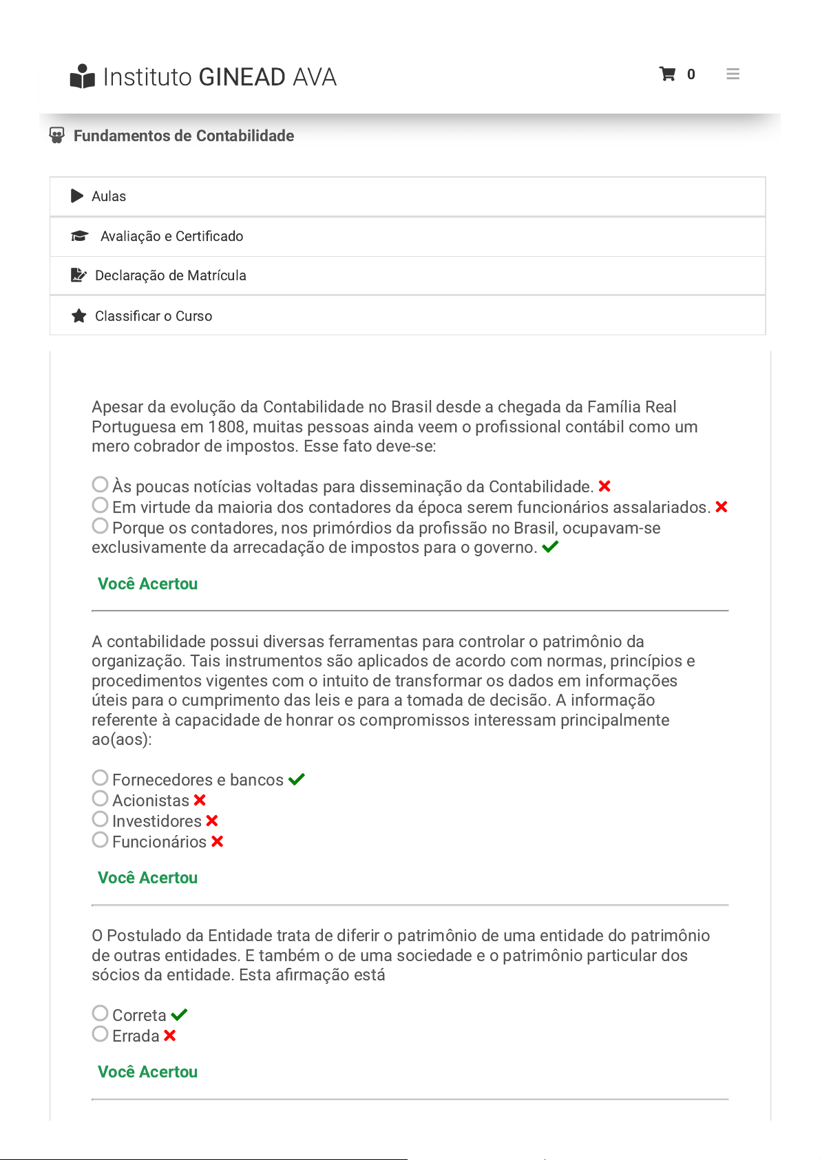 Fundamentos de Contabilidade Apesar da evolução da Contabilidade no Brasil desde a chegada da Família Real Portuguesa em 1808, muitas pessoas ainda veem o profissional contábil como um mero cobrador de impostos. Esse fato deve-se: Às poucas notícias voltadas para disseminação da Contabilidade. Em virtude da maioria dos contadores da época serem funcionários assalariados. Porque os contadores, nos primórdios da profissão no Brasil, ocupavam-se exclusivamente da arrecadação de impostos para o governo. Você Acertou A contabilidade possui diversas ferramentas para controlar o patrimônio da organização. Tais instrumentos são aplicados de acordo com normas, princípios e procedimentos vigentes com o intuito de transformar os dados em informações úteis para o cumprimento das leis e para a tomada de decisão. A informação referente à capacidade de honrar os compromissos interessam principalmente ao(aos): Fornecedores e bancos Acionistas Investidores Funcionários Você Acertou O Postulado da Entidade trata de diferir o patrimônio de uma entidade do patrimônio de outras entidades. E também o de uma sociedade e o patrimônio particular dos sócios da entidade. Esta afirmação está Correta Errada Você Acertou Aulas Avaliação e Certificado Declaração de Matrícula Classificar o Curso Instituto GINEAD AVA 0 https://www.ginead.com.br/ava/curso/curso-gratuito-fundamentos-de-contabilidade https://www.ginead.com.br/ava/curso/curso-gratuito-fundamentos-de-contabilidade https://www.ginead.com.br/ava/curso/curso-gratuito-fundamentos-de-contabilidade/avaliacao https://www.ginead.com.br/ava/curso/curso-gratuito-fundamentos-de-contabilidade/avaliacao https://www.ginead.com.br/ava/curso/curso-gratuito-fundamentos-de-contabilidade/declaracao https://www.ginead.com.br/ava/curso/curso-gratuito-fundamentos-de-contabilidade/declaracao https://www.ginead.com.br/ava/curso/curso-gratuito-fundamentos-de-contabilidade/classificar-curso https://www.ginead.com.br/ava/curso/curso-gratuito-fundamentos-de-contabilidade/classificar-curso https://www.ginead.com.br/ava https://www.ginead.com.br/ava https://www.ginead.com.br/ava https://www.ginead.com.br/ava https://www.ginead.com.br/ava/pedidos/carrinho A Teoria Patrimonialista divide-se em contas próprias e contas de agentes consignatários. Esta afirmação está Correta Errada Você Acertou Os financiamentos de longo prazo, superior a 365 dias são obrigações que devem ser lançadas no: Passivo não circulante. Conta redutora de ativo. Passivo circulante. Você Acertou Ao tratar dos bens e direitos das organizações consideram-se as contas no Balanço Patrimonial correspondente. Assim, o ativo circulante diz respeito aos bens e direitos numerários ou que podem facilmente ser transformados em dinheiro. Nesse contexto, é correto apenas o que se afirma em: As aplicações financeiras são exemplos de bens numerários. Bens numerários correspondem aos imóveis, às máquinas e aos equipamentos. As obrigações correspondem aos valores a receber que constam no passivo não circulante. Você Acertou O Balanço Patrimonial pode ser utilizado para a mensuração da situação econômica e financeira da empresa através da análise dos elementos que o compõem. Tais elementos são divididos em origens e aplicações de recursos. Selecione a opção que traz uma operação que representa uma aplicação de recursos: Aumento na conta de despesas. Integralização do capital para a quitação de dívidas. Aumento no ativo circulante referente à integralização de capital. Você Acertou Com base nos ativos da empresa, assinale a opção correta: O passivo circulante refere-se às contas de fornecedores e de patrimônio líquido. O passivo não circulante refere-se às contas de empréstimos de longo prazo e ao patrimônio líquido. Ativo circulante refere-se, entre outras contas, às de estoques e de disponibilidades. Você Acertou Instituto GINEAD AVA 0 https://www.ginead.com.br/ava https://www.ginead.com.br/ava https://www.ginead.com.br/ava https://www.ginead.com.br/ava https://www.ginead.com.br/ava/pedidos/carrinho Em relação aos atos e aos fatos administrativos, assinale apenas a alternativa correta. Um ato administrativo sempre é composto de um fato administrativo. Um fato simples envolve dois fatos modificativos. Fatos modificativos alteram a situação líquida da empresa. Você Acertou Assinale a alternativa que apresenta as técnicas contábeis: Auditoria, planejamento, execução, demonstrações contábeis e análises das demonstrações contábeis. Auditoria, escrituração e análises das demonstrações contábeis. Auditoria, escrituração, demonstrações contábeis e análises das demonstrações contábeis. Você Errou. A reposta é: Auditoria, escrituração, demonstrações contábeis e análises das demonstrações contábeis. Instituto GINEAD AVA 0 https://www.ginead.com.br/ava https://www.ginead.com.br/ava https://www.ginead.com.br/ava https://www.ginead.com.br/ava https://www.ginead.com.br/ava/pedidos/carrinho