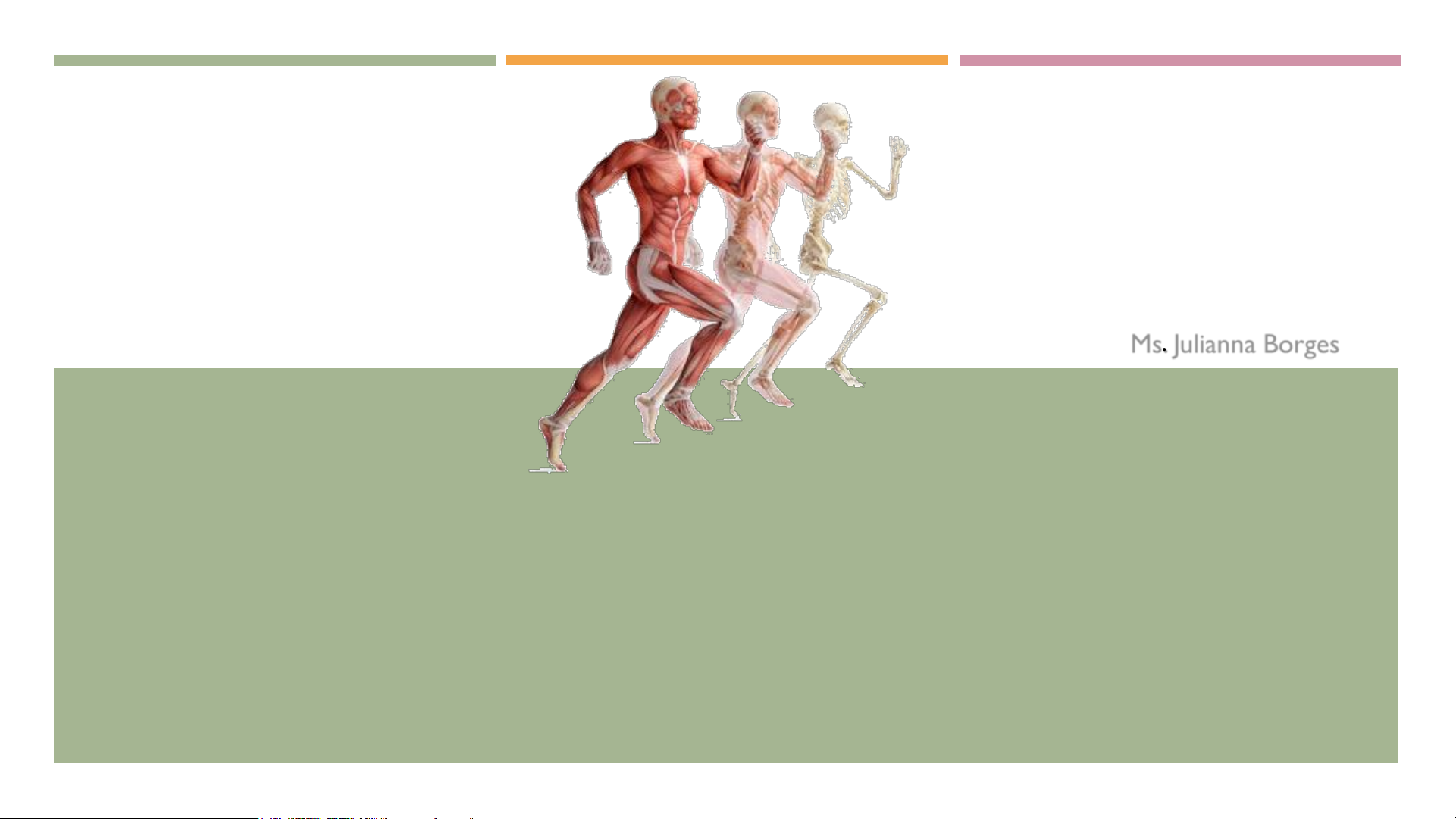 SISTEMA MUSCULO ESQUELÉTICO - ARTICULAÇÕES - Ms. Julianna Borges A UNIÃO ENTRE O SIST. MUSCULAR E ESQUELÉTICO A união dos ossos é o que constitui o esqueleto humano do qual uma das principais funções é permitir a mobilidade. O Movimento Nervos Ossos Músculos Articulações PARA DESIGNAR QUAISQUER CONEXÃO EXISTENTE ENTRE AS PARTES DO ESQUELETO EMPREGA-SE O TERMO: JUNTURA OU ARTICULAÇÃO. Classificações: Fibrosas: tec. Conjuntivo Cartilaginosas: Cartilagem hialina Sinoviais: presença de capsula articular preenchida com líquido sinovial Superfícies articulares e seu revestimento: São revestidas em toda a sua extensão por cartilagem hialina Redução do movimento = fibrose da cartilagem = anquilose (perda de mobilidade) A cartilagem é avascular, sua nutrição é reduzida , o que dificulta a regeneração em casos de lesão (difícil e lenta) CAPSULA ARTICULAR CONSTITUIÇÃO DA CAPSULA ARTICULAR: Apresenta-se em 2 camadas: A membrana fibrosa (externa) Mais resistente Composta por feixes fibrosos (ligamentos capsulares) A membrana sinovial (interna) Abundante vascularização e inervação Líquido sinovial (ác. hialurônico) = função lubrificadora . Os ligamentos e a capsula tem a finalidade de manter a união entre os ossos, impedir movimentos em planos indesejáveis e limitar a amplitude de movimentos. DISCOS E MENISCOS São formações fibro-cartilaginosas (originalmente) Superfícies que se articulam com intuito de absorver parte do impacto/pressão Pode ser removido cirurgicamente O novo menisco é formado por tec. Conjuntivo fibroso É denso e menos resistente ARTICULAÇÕES SINOVIAIS CLASSIFICAÇÃO FUNCIONAL DAS JUNTURAS SINOVIAIS Este tipo de classificação leva em consideração o grau de liberdade do movimento Mono-axial (cotovelo) Bi-axial (punho) Tri-axial (ombro e quadril) Como as superfícies entram em contato Meios de união que pode limita-los PRINCIPAIS MOVIMENTOS REALIZADOS PELO CORPO HUMANO A direção: Sempre em torno do eixo O eixo: Antero-posterior Látero-lateral Longitudianal A direção do movimento é sempre PERPENDICULAR ao plano no qual se realiza o movimento MOVIMENTOS ANGULARES: Nesse movimento há a diminuição ou aumento do ângulo existente entre o seguimento que se desloca e o que permanece fixo. Flexão e extensão ADUÇÃO E ABDUÇÃO O seguimento é deslocado em relação ao plano mediano, afastando-se (abdução) ou aproximando-se (adução) ROTAÇÃO É o movimento que o seguimento gira em torno do eixo Rotação medial; rotação lateral CIRCUNDAÇÃO Movimento combinatório (descreve um circulo) ATIVIDADE (S): conceituar junturas. Citar exemplos de articulações fibrosas e cartilaginosas; Citar as características de uma articulação sinovial e, explicar suas funções. Defina morfologicamente e funcionalmente: capsula articular Classifique as articulações a seguir: ombro, cotovelo, punho, quadril, joelho, tornozelo. Sobre os tipos de movimento: flexão, extensão, abdução, rotação, circundação; cite quais tipo de movimento são possíveis para: : ombro, cotovelo, punho, quadril, joelho, tornozelo MUSCULOS> Funções São células especializadas para contração e relaxamento, para finalidade de gerar movimento. Une as peças ósseas Determinam posição e postura CLASSIFICAÇÃO DOS MÚSCULOS Musculo voluntário Apresentam estrias transversais (estriados) São esqueléticos (uma de sus extremidades está fixada ao esqueleto) Musculo involuntário Não possuem estrias transversais (lisos) Viscerais COMPONENTES ANATÔMICOS DOS MÚSCULOS Ventre muscular (A): é a porção contrátil do musculo (parte ativa), constituída pelas fibras que se contraem , forma o corpo do musculo (porção carnosa); Tendão (B): é um tecido conjuntivo, rico em fibras colágenas, que tem como objetivo/ função, a fixação das fibras. Podem ser cilíndricas ou laminares (aponeuroses) Fáscia muscular: é uma fina camada laminar de tec. Conjuntivo que recobre o musculo; Funções: fixação, facilitar deslizamento dos músculos entre si; A CONTRAÇÃO MUSCULAR Enquanto os músculos estriados geram movimentos que desencadeiam a locomoção, a musculatura lisa, em seu trabalho de contração, reduz seu volume e diâmetro para, desta forma expelir ou impulsionar seu conteúdo. VARIAÇÕES NAS FIBRAS MUSCULARES DEPENDEM: Estas variações podem ocorrer no diâmetro e são relacionadas a/ao ❑ músculo ❑ idade ❑ sexo ❑ estado de nutrição ❑ treinamento físico Outras variações no volume e número de fibras: Hipertrofia Atrofia hiperplasia INERVAÇÃO E NUTRIÇÃO Nenhum músculo se contrai sem ação do SNC Quando seccionado o nervo, o musculo entra em atrofia A anergia necessário para a contração muscular chega através da corrente sanguínea (altamente vascularizados) AÇÃO MUSCULAR = COORDENAÇÃO MOTORA ❖ Quando um músculo é o principal executor do movimento = AGONISTA ❖ Os músculos fizadores , posturais ou sinergistas estabilizam diversas partes do corpo para realização do movimento principal O músculo ANTAGONISTA se opõe ao trabalho do musculo agonista para regular o movimento, sua rapidez e potência. m. Flexores dos dedos = agonista Tendões do punho = flexão da mão E Musculos extensores do carpo PRINCIPAIS MÚSCULOS E SUAS CLASSIFICAÇÕES Quanto a forma do músculo e o arranjo das fibras: Disposição paralela das fibras: Encontrada em músculos longos (m. esternocleidomastoideo) Quando as fibras convergem em direção aos tendões = fusiformes (bíceps braquial) Encontrada em músculos largos ou seja: comprimento e largura equivalentes (m. glúteo maximo) Quando as fibras convergem em direção a um tendão = musc. Em leque ( m. peitoral maior) Disposição oblíqua das fibras: Quando as fibras são obliquas em relação aos tendões = peniformes m. Reto da coxa (bi), M. extensor longo dos dedos do pé (uni) Quanto a origem: Quando se originam por mais de um tendão: bíceps, tríceps, quatriceps; Quant