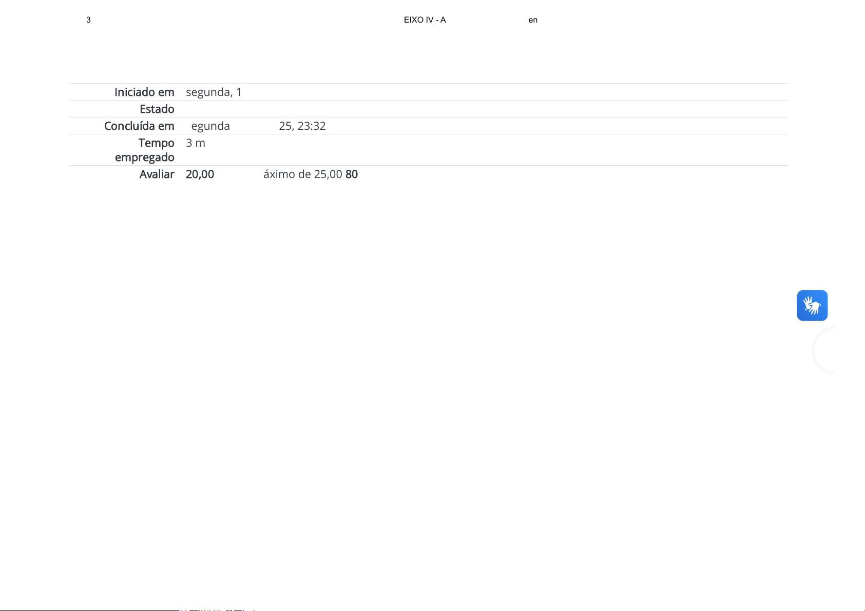 ... Iniciado em segunda, 1 dez 2025, 23:29 Estado Finalizada Concluída em segunda, 1 dez 2025, 23:32 Tempo empregado 3 minutos 29 segundos Avaliar 20,00 de um máximo de 25,00(80%) 01/12/2025, 23:33 EIXO IV - Atividades: Revisão da tentativa https://ead.educacao.mg.gov.br/mod/quiz/review.php?attempt=4032496&cmid=45362 1/7 Questão 1 Completo Atingiu 5,00 de 5,00 Segundo a proposta do CRMG, para o desenvolvimento do projeto de vida, é preciso saber o que fazer, por que fazer e como fazer. Os conhecimentos em Ciências da Natureza podem ajudar ao: a. ampliar as possibilidades de atuação frente aos diversos cenários que envolvem seus conhecimentos e inspirar novas possibilidades. b. ampliar as possibilidades de atuação empreendedora em função dos conhecimentos, inspirando novas possibilidades. c. proporcionar a ampliar as possibilidades de atuação empreendedora e inspirar ideias inovadoras. d. proporcionar possibilidades de atuação criativa e inspirar novas possibilidades que possam acompanhar os estudos. Sua resposta está correta. A alternativa mostra corretamente o que o CRMG propõe para esta perspectiva de formação utilizando os conhecimentos da área de CNT. 01/12/2025, 23:33 EIXO IV - Atividades: Revisão da tentativa https://ead.educacao.mg.gov.br/mod/quiz/review.php?attempt=4032496&cmid=45362 2/7 Lauro Realce Questão 2 Completo Atingiu 0,00 de 5,00 O professor deve contar com o apoio de colegas e gestores para avaliar os resultados obtidos. Visto que a. os conhecimentos em estudo e suas aplicações são de interesse somente da gestão escolar. b. o que está sendo estudado, dada as necessidades de vinculação com situações reais pode gerar problemas. c. o entendimento da aplicação dos conteúdos em diversos ambientes e realidades, favorece o acompanhamento da aprendizagem. d. a aplicação dos conceitos da área de conhecimento e sua aprendizagem visam favorecer o cuidado e a preservação. Sua resposta está incorreta. A alternativa correta demonstra a habilidade que visa trabalhar diversos aspectos aplicação diária dos conhecimentos e suas relações. 01/12/2025, 23:33 EIXO IV - Atividades: Revisão da tentativa https://ead.educacao.mg.gov.br/mod/quiz/review.php?attempt=4032496&cmid=45362 3/7 Lauro Realce Questão 3 Completo Atingiu 5,00 de 5,00 No caso das avaliações escritas, o professor pode ainda tabular as respostas dos estudantes para criar um panorama geral da turma e selecionar a questão que apresentou maior número de respostas erradas. Em seguida, listar os a. eventos que podem ter levado à presente situação e mostrar aos estudantes o que deve ser feito para terem melhores resultados em outra avaliação. b. grupos de resultados para entender as diversas situações de impacto no ambiente educacional. c. impactos nos estudantes por meio da criação de uma análise dos pontos dos grupos avaliados e propor novos estudos. d. possíveis motivos que levaram tantos estudantes ao erro. Cada item da lista pode ser um problema que alimenta o COI. Sua resposta está correta. A alternativa é a que se relaciona diretamente à proposição feita pelo CRMG como exemplo de como proceder à uma auto-avaliação docente. 01/12/2025, 23:33 EIXO IV - Atividades: Revisão da tentativa https://ead.educacao.mg.gov.br/mod/quiz/review.php?attempt=4032496&cmid=45362 4/7 Lauro Realce Questão 4 Completo Atingiu 5,00 de 5,00 O CRMG sugere uma metodologia para o desenvolvimento das habilidades investigativas que coloca os estudantes como protagonistas do processo de ensino-aprendizagem. O nome dessa metodologia é a. Tecnologia, Ciência, Sociedade e Ambiente (TCSA). b. Ciência, Tecnologia, Sociedade e Ambiente (CTSA). c. Sociedade, Ciência, Tecnologia e Ambiente (SCTA). d. Ambiente, Ciência, Tecnologia e Sociedade (ACTS). Sua resposta está correta. A alternativa mostra que no conceito de competência descrito no documento do CRMG temos a mobilização de conhecimentos, que envolvem tanto os conceitos quanto os procedimentos, assim, uma metodologia de atividades que favoreçam uma aprendizagem significativa. 01/12/2025, 23:33 EIXO IV - Atividades: Revisão da tentativa https://ead.educacao.mg.gov.br/mod/quiz/review.php?attempt=4032496&cmid=45362 5/7 Lauro Realce Questão 5 Completo Atingiu 5,00 de 5,00 Pensando nas três habilidades específicas do eixo de Empreendedorismo, a primeira pode ser avaliada como sendo uma forma de: a. conhecer os recursos relacionados às Ciências da Natureza e utilizá-los na concretização de projetos pessoais ou produtivos, considerando as diversas tecnologias disponíveis e os impactos socioambientais. b. relacionar oportunidades, conhecimentos e recursos relacionados às Ciências da Natureza podem ser utilizados na concretização de projetos produtivos, considerando as diversas tecnologias disponíveis e os impactos socioambientais. c. avaliar como oportunidades, conhecimentos e recursos relacionados às Ciências da Natureza podem ser utilizados na concretização de projetos pessoais ou produtivos, considerando as diversas tecnologias disponíveis e os impactos socioambientais. d. identificar recursos relacionados às Ciências da Natureza e como eles podem ser utilizados na concretização de projetos pessoais ou produtivos. Sua resposta está correta. A alternativa é a que se relaciona corretamente à habilidade: (EMIFCNT10). 01/12/2025, 23:33 EIXO IV - Atividades: Revisão da tentativa https://ead.educacao.mg.gov.br/mod/quiz/review.php?attempt=4032496&cmid=45362 6/7 https://ead.educacao.mg.gov.br/mod/forum/view.php?id=45361&forceview=1 https://ead.educacao.mg.gov.br/mod/forum/view.php?id=45361&forceview=1 https://ead.educacao.mg.gov.br/mod/forum/view.php?id=45361&forceview=1 https://ead.educacao.mg.gov.br/mod/resource/view.php?id=45363&forceview=1 https://ead.educacao.mg.gov.br/mod/resource/view.php?id=45363&forceview=1 https://ead.educacao.mg.gov.br/mod/resource/view.php?id=45363&forceview=1 Lauro Realce 01/12/2025,