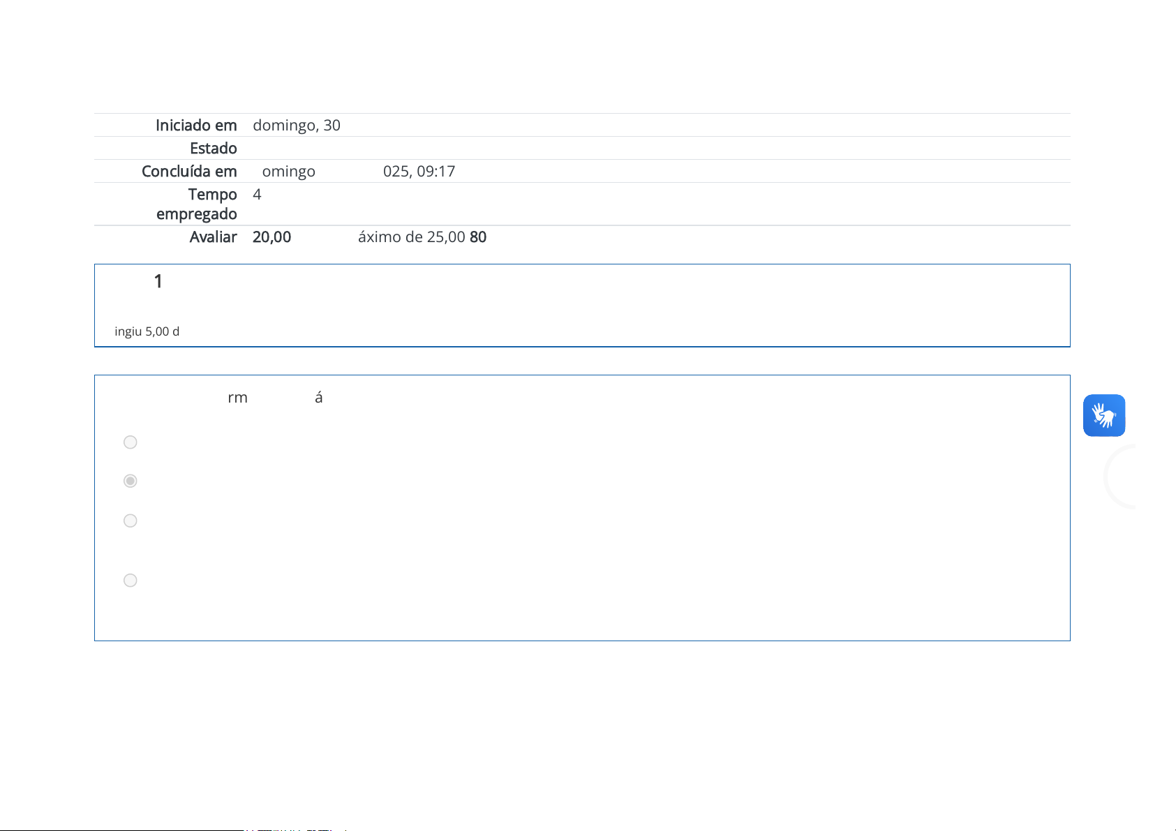 ... Iniciado em domingo, 30 nov 2025, 09:13 Estado Finalizada Concluída em domingo, 30 nov 2025, 09:17 Tempo empregado 4 minutos 15 segundos Avaliar 20,00 de um máximo de 25,00(80%) Questão 1 Completo Atingiu 5,00 de 5,00 Os itinerários formativos da área de Ciências Humanas e Sociais Aplicadas se caracterizam: a. pela consideração do contexto local e das possibilidades de oferta pelos sistemas de ensino. b. Todas as opções acima estão corretas. c. por arranjos curriculares que permitam estudos em relações sociais, modelos econômicos, processos políticos, pluralidade cultural, dentre outros. d. pelo aprofundamento de conhecimentos estruturantes para aplicação de diferentes conceitos em contextos sociais e de trabalho. Sua resposta está correta. 30/11/2025, 09:18 EIXO I - Atividades: Revisão da tentativa https://ead.educacao.mg.gov.br/mod/quiz/review.php?attempt=4027375&cmid=45588 1/6 Questão 2 Completo Atingiu 5,00 de 5,00 Os quatro eixos estruturantes dos itinerários formativos são: a. Educação integral, projeto de vida, componentes curriculares eletivos e formação geral básica. b. Investigação científica, mediação e intervenção sociocultural, empreendedorismo e processos criativos. c. Planejamento, gestão de sala de aula, avaliação e protagonismo estudantil. d. Investigação científica, mediação comunicativa, empreendedorismo sociocultural e processos investigativos. Sua resposta está correta. 30/11/2025, 09:18 EIXO I - Atividades: Revisão da tentativa https://ead.educacao.mg.gov.br/mod/quiz/review.php?attempt=4027375&cmid=45588 2/6 Questão 3 Completo Atingiu 0,00 de 5,00 A partir da habilidade EMIFCG02 (Posicionar-se com base em critérios científicos, éticos e estéticos, utilizando dados, fatos e evidências para respaldar conclusões, opiniões argumentos, meio e por de afirmações claras, ordenadas, coerentes e compreensíveis, sempre respeitando valores universais, como liberdade, democracia, justiça social, pluralidade, solidariedade sustentabilidade) podemos: a. recorrer a tecnologias de informação e comunicação para a sistematização e classificação de dados, a partir de uma abordagem que envolva posicionamento crítico e racionalidade científica. b. Nenhuma das alternativas acima está correta. c. explorar a compreensão da realidade social e os possíveis dilemas éticos decorrentes de diferentes posicionamentos individuais ou de grupos sociais com os quais os estudantes possuem algum tipo de contato. d. auxiliar os estudantes na seleção de informações e dados nos mais diferentes formatos (mapas, tabelas, gráficos, vídeos, notícias, artigos científicos, livros etc.) sobre um determinado assunto, ensejando junto aos discentes a análise crítica de conteúdos. Sua resposta está incorreta. 30/11/2025, 09:18 EIXO I - Atividades: Revisão da tentativa https://ead.educacao.mg.gov.br/mod/quiz/review.php?attempt=4027375&cmid=45588 3/6 https://ead.educacao.mg.gov.br/mod/glossary/showentry.php?eid=307&displayformat=dictionary https://ead.educacao.mg.gov.br/mod/glossary/showentry.php?eid=307&displayformat=dictionary Questão 4 Completo Atingiu 5,00 de 5,00 A habilidade _______________ tem como objetivo assistir os discentes na sistematização das informações e dos dados levantados. Esse procedimento envolve a produção de um argumento baseado em estudos e pesquisas, desde a leitura de textos científicos até a coleta de informações. Outro aspecto importante dessa habilidade é a sua apresentação em diferentes formatos de mídia, como recursos audiovisuais, tabelas, textos, mapas etc. Marque a opção que completa a lacuna do trecho supracitado: a. EMIFCHSA03 (Selecionar e sistematizar, com base em estudos e/ou pesquisas [bibliográfica, exploratória, de campo, experimental etc.] em fontes confiáveis, informações sobre temas e processos de natureza histórica, social, econômica, filosófica, política e/ou cultural, em âmbito local, regional, nacional e/ou global, identificando os diversos pontos de vista e posicionando-se mediante argumentação, com o cuidado de citar as fontes dos recursos utilizados na pesquisa e buscando apresentar conclusões com o uso de diferentes mídias). b. EMIFCHSA04 (Reconhecer produtos e/ou processos criativos por meio de fruição, vivências e reflexão crítica sobre temas e processos de natureza histórica, social, econômica, filosófica, política e/ou cultural, em âmbito local, regional, nacional e/ou global). c. EMIFCHSA02 (Levantar e testar hipóteses sobre temas e processos de natureza histórica, social, econômica, filosófica, política e/ou cultural, em âmbito local, regional, nacional e/ou global, contextualizando os conhecimentos em sua realidade local e utilizando procedimentos e linguagens adequados à investigação científica). d. EMIFCHSA01 (Investigar e analisar situações-problema envolvendo temas e processos de natureza histórica, social, econômica, filosófica, política e/ou cultural, em âmbito local, regional, nacional e/ou global, considerando dados e informações disponíveis em diferentes mídias). Sua resposta está correta. 30/11/2025, 09:18 EIXO I - Atividades: Revisão da tentativa https://ead.educacao.mg.gov.br/mod/quiz/review.php?attempt=4027375&cmid=45588 4/6 https://ead.educacao.mg.gov.br/mod/glossary/showentry.php?eid=307&displayformat=dictionary Questão 5 Completo Atingiu 5,00 de 5,00 Qual dentre as habilidades abaixo pertence ao eixo estruturante “Processos Criativos”: a. EMIFCHSA01 (Investigar e analisar situações-problema envolvendo temas e processos de natureza histórica, social, econômica, filosófica, política e/ou cultural, em âmbito local, regional, nacional e/ou global, considerando dados e informações disponíveis em diferentes mídias). b. EMIFCHSA09 (Propor e testar estratégias de mediação e intervenção para resolver problemas de natureza sociocultural e de natureza ambiental, em âmbito local, regio